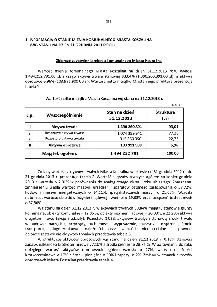 255 1. INFORMACJA O STANIE MIENIA KOMUNALNEGO MIASTA KOSZALINA (WG STANU NA DZIEŃ 31 GRUDNIA 2013 ROKU) Zbiorcze zestawienie mienia komunalnego Miasta Koszalina Wartość mienia komunalnego Miasta Koszalina na dzień 31.12.2013 roku wynosi 1.494.252.791,00 zł, z czego aktywa trwałe stanowią 93,04% (1.390.260.891,00 zł), a aktywa obrotowe 6,96% (103.991.900,00 zł). Wartość netto majątku Miasta i jego strukturę prezentuje tabela 1. Wartość netto majątku Miasta Koszalina wg stanu na 31.12.2013 r. TABELA 1 Stan na dzień 31.12.2013 Struktura (%) L.p. Wyszczególnienie I Aktywa trwałe 1 390 260 891 93,04 1. 2. Rzeczowe aktywa trwałe Pozostałe aktywa trwałe II Aktywa obrotowe 1 074 399 941 315 860 950 103 991 900 77,28 22,72 6,96 Majątek ogółem: 1 494 252 791 100,00 Zmiany wartości aktywów trwałych Miasta Koszalina w okresie od 31 grudnia 2012 r. do 31 grudnia 2013 r. prezentuje tabela 2. Wartość aktywów trwałych ogółem na koniec grudnia 2013 r. wzrosła o 2.01% w porównaniu do analogicznego okresu roku ubiegłego. Znacznemu zmniejszeniu uległa wartość maszyn, urządzeń i aparatów ogólnego zastosowania o 37,72%, kotłów i maszyn energetycznych o 14,11%, specjalistycznych maszyn o 21,08%. Wzrosła natomiast wartość obiektów inżynierii lądowej i wodnej o 19,03% oraz urządzeń technicznych o 57,80%. Wg stanu na dzień 31.12.2013 r. w aktywach trwałych 30,84% majątku stanowią grunty komunalne, obiekty komunalne – 12,05 %, obiekty inżynierii lądowej – 26,80%, a 22,29% aktywa długoterminowe (akcje i udziały). Pozostałe 8,02% aktywów trwałych stanowią środki trwałe w budowie, narzędzia, przyrządy, ruchomości i wyposażenie, maszyny i urządzenia, środki transportu, długoterminowe należności oraz wartości niematerialne i prawne. Zbiorcze zestawienie aktywów trwałych przedstawia tabela 3. W strukturze aktywów obrotowych wg stanu na dzień 31.12.2013 r. 0,16% stanowią zapasy, należności krótkoterminowe 77,10% a środki pieniężne 28,74 %. W porównaniu do roku ubiegłego wartość aktywów obrotowych ogółem wzrosła o 27%, w tym należności krótkoterminowe o 17% a środki pieniężne o 60% i zapasy o 2%. Zmiany w stanach aktywów obrotowych Miasta Koszalina przedstawia tabela 4. 256 Majątek Urzędu Miejskiego Majątek trwały wartość netto Urzędu Miejskiego stanowi 55,64% majątku trwałego ogółem a aktywa rzeczowe stanowią 42,61% aktywów rzeczowych ogółem. W strukturze majątku trwałego Urzędu Miejskiego aktywa rzeczowe stanowią 59,19%, pozostałe aktywa 40,81%. W grupie aktywów rzeczowych nieruchomości (tj. grunty, budynki i lokale oraz obiekty inżynierii lądowej) stanowią 47,65%. Stopień zużycia ( stosunek wartości umorzenia do wartości początkowej ) obiektów komunalnych wynosi 24,02%, a obiektów inżynierii lądowej 23,78%. Zestawienie majątku trwałego Urzędu Miejskiego prezentuje tabela 5. Aktywa obrotowe Urzędu Miejskiego w strukturze majątku obrotowego Miasta ogółem stanowią 48,73%. W porównaniu do stanu na dzień 31.12.2012 r. aktywa obrotowe Urzędu Miejskiego są wyższe o 40,77% - tj. o 14.675.139,00 zł. Wzrost odnotowano w grupie: „środki pieniężne na rachunkach bankowych” – 76,89% tj. 11.208.745,00 zł , „należności od budżetów” – 10,89% tj. o 285.315,00 zł i „inne należności” – 23,82% tj. o 3.831.096,00 zł . Spadek wartości wystąpił w grupie: „należności z tytułu dostaw i usług” – 23,92% tj. o 650.017,00 zł. Dane dotyczące aktywów obrotowych Urzędu Miejskiego zawarte są w tabeli 6. Miasto Koszalin jest udziałowcem w 11 spółkach miejskich na łączną kwotę 309.994.600,00 zł, co stanowi 22,29% aktywów trwałych ogółem. Udziały pieniężne wynoszą 57.989.400,00 zł (4,17% aktywów trwałych Miasta), niepieniężne 248.480.200,00 zł (17,87% aktywów trwałych Miasta), a akcje 3 525 000,00 zł co stanowi 0,25% majątku trwałego ogółem. Wykaz udziałów Miasta Koszalina zawiera tabela 7. Grunty komunalne Miasto Koszalin posiada łącznie prawo własności 2 196,8 ha nieruchomości gruntowych. 1 967,2 ha jest to własność Gminy Koszalin a 229,6 ha własność powiatu. • Gmina Koszalin posiada prawo własności 1 967,2 ha nieruchomości gruntowych, które stały się mieniem komunalnym w wyniku komunalizacji z mocy prawa i komunalizacji na wniosek a także w wyniku nabycia w różnych formach od osób prawnych i fizycznych. W granicach administracyjnych miasta Koszalina pozostaje 1 949,0 ha nieruchomości. Poza granicami administracyjnymi miasta jest 18,2 ha. W gminie Manowo Miasto jest właścicielem 17,0 ha gruntów (nieruchomość zabudowana głównie magistralą wodociągową Mostowo-Koszalin), w gminie Darłowo 0,6 ha (nieruchomość zabudowana ośrodkiem wypoczynkowym), w gminie Mielno 0,5 ha (nieruchomość zabudowana ośrodkiem wypoczynkowym) oraz w gminie Świeszyno 0,1 ha (nieruchomość przeznaczona na drogę publiczną). • Powiat Koszalin posiada prawo własności 229,6 ha nieruchomości gruntowych. W granicach administracyjnych miasta Koszalina pozostaje 228,1 ha, w gminie Sianów 1,5 ha. 257 1. GRUNTY ROLNE Stanowią własność Gminy Miasto Koszalin. Są to grunty ujęte w operacie ewidencji gruntów miasta Koszalina jako użytki rolne (na gruntach tworzących gminny zasób nieruchomości) i zajmują powierzchnię 219,6 ha. Miasto wydzierżawia 41,9 ha gruntów. 2. DROGI Łączna powierzchnia dróg powiatowych, gminnych i wewnętrznych wynosi 467,8 ha. Powierzchnia dróg gminnych i dróg wewnętrznych stanowiących własność Gminy Miasto Koszalin wynosi 256,2 ha. Miasto Koszalin na prawach powiatu jest właścicielem 211,6 ha nieruchomości gruntowych zajętych przez drogi powiatowe. Nieruchomości drogowe o powierzchni 185,5 ha przekazane zostały w trwały zarząd na rzecz Zarządu Dróg Miejskich w Koszalinie, drogi o powierzchni 0,1 ha pozostają w użytkowaniu wieczystym, drogi o powierzchni 1,4 