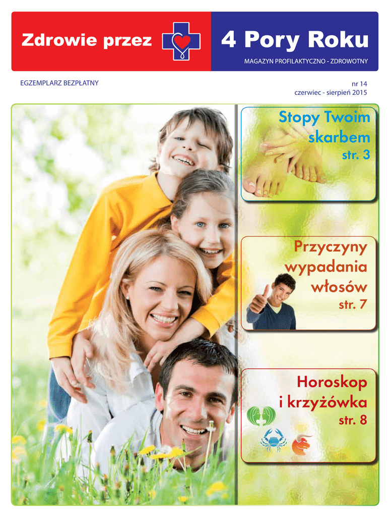 EGZEMPLARZ BEZPŁATNY nr 14 czerwiec - sierpień 2015 Stopy Twoim skarbem str. 3 Przyczyny wypadania włosów str. 7 Horoskop i krzyżówka str. 8 str. 2 Fenistil® żel żel 30 g żel na ukąszenia Ranigast® Max na zgagę 20 tabletek powlekanych 9,98 zł 15,49 zł Novartis Consumer Health GmbH ZF Polpharma SA Fenistil® żel 30 g. Wskazania: łagodzi objawy alergiczne i podrażnienia skóry różnego typu, także przy ukąszeniach owadów i oparzeniach słonecznych. Substancja czynna: 1 g żelu zawiera 1 mg maleinian dimetindenu. Przeciwwskazania: nadwrażliwość na dimetykon lub składniki preparatu, oparzenia drugiego i trzeciego stopnia, pierwszy trymestr ciąży. Podmiot odpowiedzialny: Novartis Consumer Health GmbH. Espumisan® na wzdęcia 100 kapsułek Ranigast® MAX 20 tabletek powlekanych. Ranigast MAX (Ranitidinum). Skład i postać: 1 tabletka powlekana zawiera 150 mg ranitydyny w postaci chlorowodorku, co odpowiada 168 mg chlorowodorku ranitydyny. Wskazania: objawowe leczenie dolegliwości dyspeptycznych takich jak zgaga, niestrawność, nadkwaśność, nie związanych z chorobą organiczną przewodu pokarmowego. Przeciwwskazania: nadwrażliwość na ranitydynę lub którąkolwiek substancję pomocniczą. Nie stosować u dzieci w wieku poniżej 16 lat. Podmiot odpowiedzialny: ZF Polpharma SA. Permen® King Dla Mężczyzny 30 tabletek Permen® Go! 6 tabletek 15,98 zł 23,98 zł Permen® King 30 tabletek. EFSA. Tabletki Permen® King to kombinacja skutecznych substancji roślinnych Berlin Chemie AG Espumisan® 100 kapsułek. Skład i postać farmaceutyczna: każda kapsułka produktu leczniczego Espumisan zawiera 40 mg symetykonu (Simeticonum). Wskazania terapeutyczne do stosowania: leczenie objawowe zaburzeń żołądkowo-jelitowych związanych z nadmiernym gromadzeniem się gazów w przewodzie pokarmowym, np.: wzdęcia. W przypadku wzmożonego powstawania gazów w okresie pooperacyjnym. W przygotowaniu pacjentów do badań radiologicznych i ultrasonograficznych jamy brzusznej oraz gastroskopii. Przeciwwskazania: nadwrażliwość na substancję czynną – symetykon lub na którąkolwiek substancję pomocniczą. Podmiot odpowiedzialny: Berlin Chemie AG, Glienicker Weg 125, 12489 Berlin, Niemcy. Nervomix® Control 20 kapsułek 44,98 zł Walmark Sp. z o.o. na uspokojenie wzbogacona o L-argininę, której preparat zawiera zwiększoną ilość. Substancja ta jest w organizmie prekursorem tlenku azotu, cząsteczki odpowiedzialnej za regulację krążenia krwi dzięki wpływowi na ściany naczyń krwionośnych. Ginsenozydy pomagają wywołać i wzmocnić erekcję, a ponadto dodają seksualnego wigoru. Zawarty w preparacie Tribulusterrestris wzmaga pożądanie seksualne. Składniki aktywne preparatu wspierają fizyczną i psychiczną wydajność męskiego organizmu w naturalny sposób. Permen® King jest zalecany do regularnego stosowania, a najlepsze efekty można zaobserwować po 6-8 tygodniach. Działanie składników: Ginsenozydy pomagają wywołać i wzmocnić erekcję; Tribulusterrestris wyzwala pożądanie i dodaje seksualnego wigoru; Ginsenozydy wykazują korzystny wpływ na psychofizyczny stan mężczyzny. Suplement diety. Podmiot odpowiedzialny: Walmark Sp. z o.o. Permen®Go! 6 tabletek. PermenGo! to kompozycja wysokiej jakości składników roślinnych, wspomagających naturalny proces wywołania erekcji i zwiększonej ilości L-argininy. Podmiot odpowiedzialny: Walmark Sp. z o.o. Viscoplast Uniwersalny lub Turystyczny 9,98 zł 1 zestaw - 24 szt. Adamed Conumer Healthcare SA 3M Poland Sp. z o.o. na skaleczenia i otarcia 5,98 zł Viscoplast Uniwersalny Zestaw plastrów zawiera duży wybór plastrów dostosowanych do różnej wielkości Nervomix® Control 20 kapsułek. Nervomix® Control suplement diety to bogata, wysokiej jakości kompo- zycja naturalnych wyciągów roślinnych z dobrze przyswajalnym magnezem i witaminą B6. Magnez i witamina B6 pomagają w utrzymaniu prawidłowych funkcji psychologicznych i w prawidłowym funkcjonowaniu układu nerwowego. Preparat zawiera także naturalne składniki (melisa, głóg, lawenda), które: ułatwiają kontrolowanie napięcia nerwowego, wspomagają w łagodzeniu rozdrażnienia i wyciszeniu organizmu, wspomagają w utrzymaniu dobrego samopoczucia. Produkt nie wpływa ujemnie na aktywność psychofizyczną i nie uzależnia. Podmiot odpowiedzialny: Adamed Consumer Healthcare SA Panthenol Protect na oparzenia pianka 150 ml 6,98 zł Polski Lek SA Panthenol Protect 150 ml. Pianka do stosowania przy oparzeniach słonecznych i otarciach naskórka. Panthenol Protect wspomaga ochronę podrażnionej skóry, narażonej na promieniowanie słoneczne lub inne podrażnienia termiczne. D-panthenolwykazuje działanie łagodząco-regenerujące. Witamina E chroni przed uszkodzeniami wywołanymi przez promieniowanie słoneczne. Olej z nasion lnu może zapobiegać uszkodzeniom skóry wywołanym przez promieniowanie UV. Pianka może być stosowana u pacjentów od 3 roku życia. Producent: Polski Lek SA drobnych ran i skaleczeń na 3 podłożach: foliowym, tkaninowym i włókninowym. Zestaw zawiera 24 szt. plastrów z opatrunkiem w 3 rodzajach: Wodoodporny: 72 x 25 mm - 4 szt., 72 x 19 mm - 8 szt. 57 x 16 mm - 6 szt., 38 x 10 mm - 4 szt. Supermiękki: 10 x 6 cm - 1 szt. Supermocny: 10 x 6 cm - 1 szt. Viscoplast Turystyczny Zestaw plastrów zawiera duży wybór plastrów dostosowanych do różnej wielkości drobnych ran i skaleczeńna 3 podłożach: foliowym, tkaninowym i włókninowym. Zestaw zawiera 24 szt. plastrów z opatrunkiem w 3 rodzajach: Wodoodporny: 72 x 25 mm - 4 szt., 72 x 19 mm - 4 szt. 57 x 16 mm - 8 szt., 38 x 10 mm - 4 szt. Wrażliwa Skóra: 76 x 51 mm - 2 szt. Supermocny: 10 x 6 cm - 2 szt. Producent: 3M Poland Sp. z o.o. Allergical 20 tabletek musujących na alergie 3,49 zł Diagnosis SA Allergical 20 tabletek musujących o smaku pomarańczowym. Suplement diety przeznaczony dla osób dorosłych jako uzupełnienie diety w wapń, kwerce