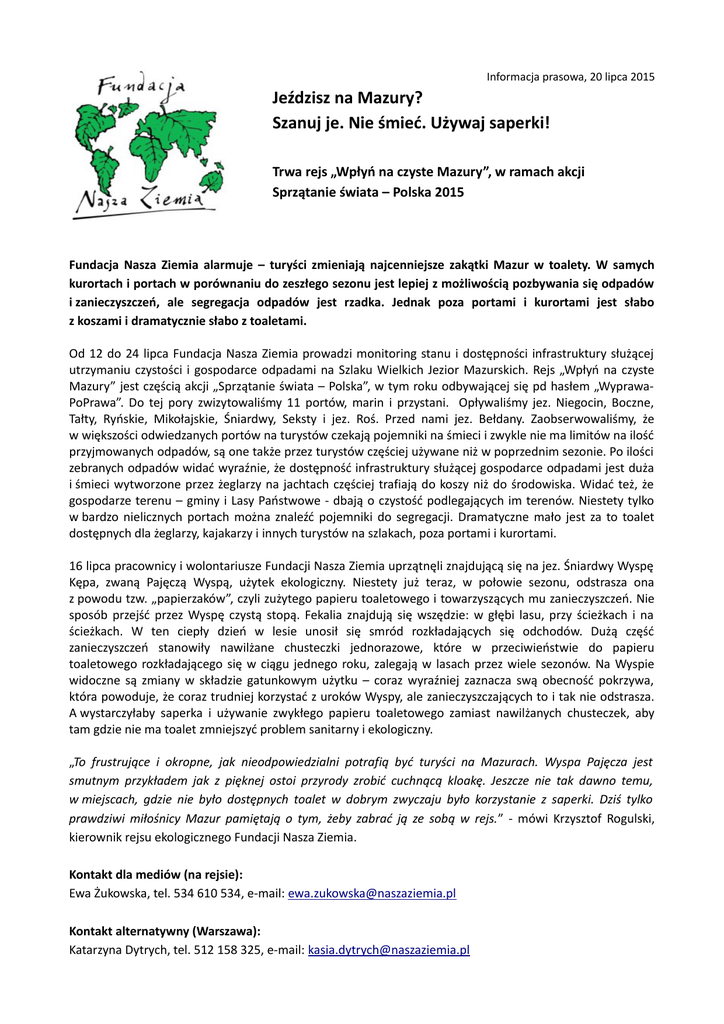 Informacja prasowa, 20 lipca 2015 Jeździsz na Mazury? Szanuj je. Nie śmieć. Używaj saperki! Trwa rejs „Wpłyń na czyste Mazury”, w ramach akcji Sprzątanie świata – Polska 2015 Fundacja Nasza Ziemia alarmuje – turyści zmieniają najcenniejsze zakątki Mazur w toalety. W samych kurortach i portach w porównaniu do zeszłego sezonu jest lepiej z możliwością pozbywania się odpadów i zanieczyszczeń, ale segregacja odpadów jest rzadka. Jednak poza portami i kurortami jest słabo z koszami i dramatycznie słabo z toaletami. Od 12 do 24 lipca Fundacja Nasza Ziemia prowadzi monitoring stanu i dostępności infrastruktury służącej utrzymaniu czystości i gospodarce odpadami na Szlaku Wielkich Jezior Mazurskich. Rejs „Wpłyń na czyste Mazury” jest częścią akcji „Sprzątanie świata – Polska”, w tym roku odbywającej się pd hasłem „WyprawaPoPrawa”. Do tej pory zwizytowaliśmy 11 portów, marin i przystani. Opływaliśmy jez. Niegocin, Boczne, Tałty, Ryńskie, Mikołajskie, Śniardwy, Seksty i jez. Roś. Przed nami jez. Bełdany. Zaobserwowaliśmy, że w większości odwiedzanych portów na turystów czekają pojemniki na śmieci i zwykle nie ma limitów na ilość przyjmowanych odpadów, są one także przez turystów częściej używane niż w poprzednim sezonie. Po ilości zebranych odpadów widać wyraźnie, że dostępność infrastruktury służącej gospodarce odpadami jest duża i śmieci wytworzone przez żeglarzy na jachtach częściej trafiają do koszy niż do środowiska. Widać też, że gospodarze terenu – gminy i Lasy Państwowe - dbają o czystość podlegających im terenów. Niestety tylko w bardzo nielicznych portach można znaleźć pojemniki do segregacji. Dramatyczne mało jest za to toalet dostępnych dla żeglarzy, kajakarzy i innych turystów na szlakach, poza portami i kurortami. 16 lipca pracownicy i wolontariusze Fundacji Nasza Ziemia uprzątnęli znajdującą się na jez. Śniardwy Wyspę Kępa, zwaną Pajęczą Wyspą, użytek ekologiczny. Niestety już teraz, w połowie sezonu, odstrasza ona z powodu tzw. „papierzaków”, czyli zużytego papieru toaletowego i towarzyszących mu zanieczyszczeń. Nie sposób przejść przez Wyspę czystą stopą. Fekalia znajdują się wszędzie: w głębi lasu, przy ścieżkach i na ścieżkach. W ten ciepły dzień w lesie unosił się smród rozkładających się odchodów. Dużą część zanieczyszczeń stanowiły nawilżane chusteczki jednorazowe, które w przeciwieństwie do papieru toaletowego rozkładającego się w ciągu jednego roku, zalegają w lasach przez wiele sezonów. Na Wyspie widoczne są zmiany w składzie gatunkowym użytku – coraz wyraźniej zaznacza swą obecność pokrzywa, która powoduje, że coraz trudniej korzystać z uroków Wyspy, ale zanieczyszczających to i tak nie odstrasza. A wystarczyłaby saperka i używanie zwykłego papieru toaletowego zamiast nawilżanych chusteczek, aby tam gdzie nie ma toalet zmniejszyć problem sanitarny i ekologiczny. „To frustrujące i okropne, jak nieodpowiedzialni potrafią być turyści na Mazurach. Wyspa Pajęcza jest smutnym przykładem jak z pięknej ostoi przyrody zrobić cuchnącą kloakę. Jeszcze nie tak dawno temu, w miejscach, gdzie nie było dostępnych toalet w dobrym zwyczaju było korzystanie z saperki. Dziś tylko prawdziwi miłośnicy Mazur pamiętają o tym, żeby zabrać ją ze sobą w rejs.” - mówi Krzysztof Rogulski, kierownik rejsu ekologicznego Fundacji Nasza Ziemia. Kontakt dla mediów (na rejsie): Ewa Żukowska, tel. 534 610 534, e-mail: [email protected] Kontakt alternatywny (Warszawa): Katarzyna Dytrych, tel. 512 158 325, e-mail: [email protected] „Wyprawa – PoPrawa” Sprzątanie świata – Polska 2015 PARTNER GŁÓWNY PARTNER MERYTORYCZNY PARTNERZY PATRONAT MEDIALNY PARTNER LOGISTYCZNY PARTNERZY REGIONALNI „Sprzątanie świata – Polska” - to już 22. edycja kampanii „Sprzątanie świata - Polska”, w tym roku pod haslem Wyprawa-PoPrawa. Jest częścią międzynarodowego społecznego ruchu na rzecz ochrony środowiska Clean up the World. Misją akcji zainicjowanej w Polsce w 1994 roku przez Mirę Stanisławską-Meysztowicz jest edukacja odpadowa oraz promowanie poszanowania środowiska i angażowanie do działań służących jego ochronie. W ramach kampanii organizowane są wydarzenia mające na celu zwrócenie uwagi na problem zanieczyszczenia środowiska, co roku w nowym kontekście. Celem tegorocznej edycji jest zwrócenie uwagi na rolę, jaką każdy z nas może odegrać w tworzeniu i funkcjonowaniu systemów utrzymania czystości i gospodarowania odpadami w gminie. Fundacja Nasza Ziemia - organizacja pozarządowa realizująca cel pożytku publicznego - edukację ekologiczną. Została założona w 1994 roku temu przez Mirę Stanisławską-Meysztowicz. Fundacja popularyzuje proste sposoby i zachowania pomagające dbać o ochronę środowiska naturalnego. Inspiruje do działania i angażuje w nie setki szkół, samorządów, instytucji, firm i osób niezrzeszonych. W jej dorobku znajduje się blisko 40 programów edukacyjnych, m.in. „Sprzątanie świata”, „Międzynarodowe Sprzątanie Bałtyku”, „Kluby Naszej Ziemi”, „Czysta Gmina”. Za prowadzone działania Fundacja Nasza Ziemia została uhonorowana „Złotym Liściem” Ministra Środowiska, Henry Ford European Conservation Award, wyróżnieniem „Pro Publico Bono” oraz wyróżnieniem specjalnym Prezydenta Rzeczypospolitej Polskiej za promowanie wolontariatu i działania wolontariackie. Więcej: www.naszaziemia.pl Sprzątanie świata - Clean Up the World – ogólnoświatowy ruch społeczny zainicjowany w 1989 roku w Australii przez biznesmena i żeglarza Jana Kiernana. Misją programu jest promowanie poszanowania środowiska i angażowanie do działań służących jego ochronie Udział w Clean up the World bierze ponad 30 krajów oraz ponad 40 mln wolontariuszy. Akcja w 1994 roku została przez Mirę