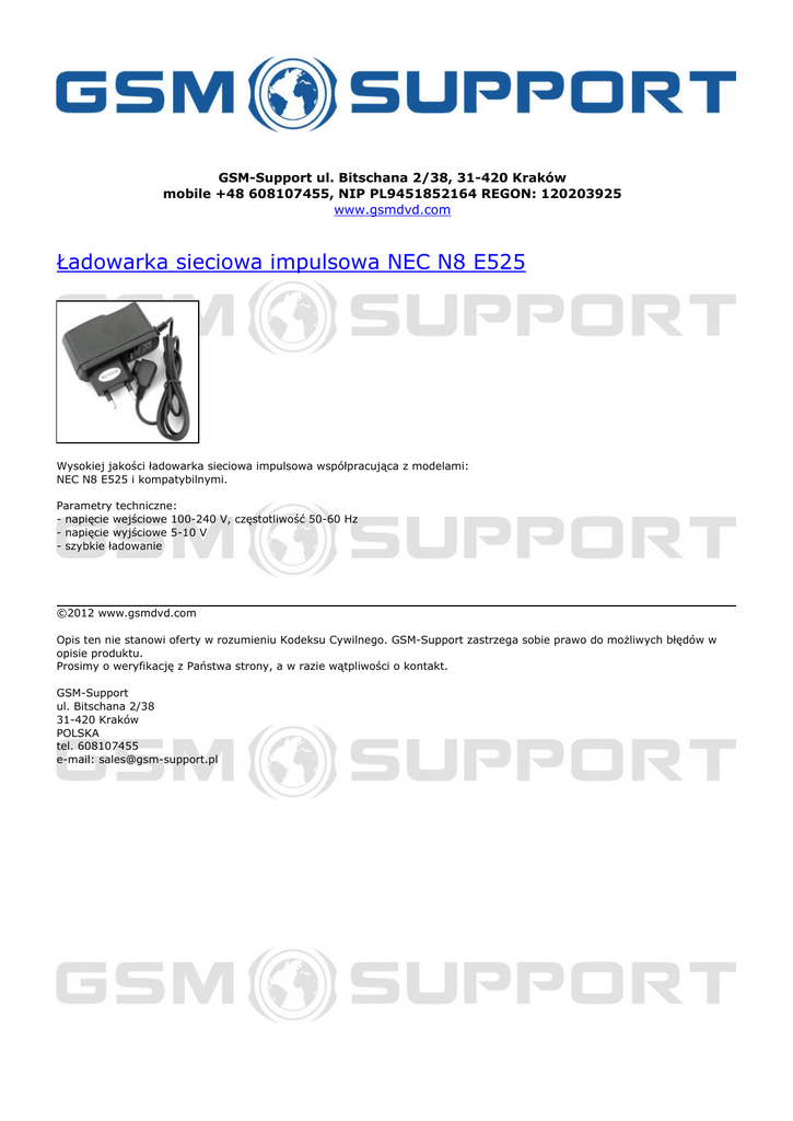 GSM-Support ul. Bitschana 2/38, 31-420 Kraków mobile +48 608107455, NIP PL9451852164 REGON: 120203925 www.gsmdvd.com Ładowarka sieciowa impulsowa NEC N8 E525 Wysokiej jakości ładowarka sieciowa impulsowa współpracująca z modelami: NEC N8 E525 i kompatybilnymi. Parametry techniczne: - napięcie wejściowe 100-240 V, częstotliwość 50-60 Hz - napięcie wyjściowe 5-10 V - szybkie ładowanie ©2012 www.gsmdvd.com Opis ten nie stanowi oferty w rozumieniu Kodeksu Cywilnego. GSM-Support zastrzega sobie prawo do możliwych błędów w opisie produktu. Prosimy o weryfikację z Państwa strony, a w razie wątpliwości o kontakt. GSM-Support ul. Bitschana 2/38 31-420 Kraków POLSKA tel. 608107455 e-mail: [email protected] Powered by TCPDF (www.tcpdf.org)