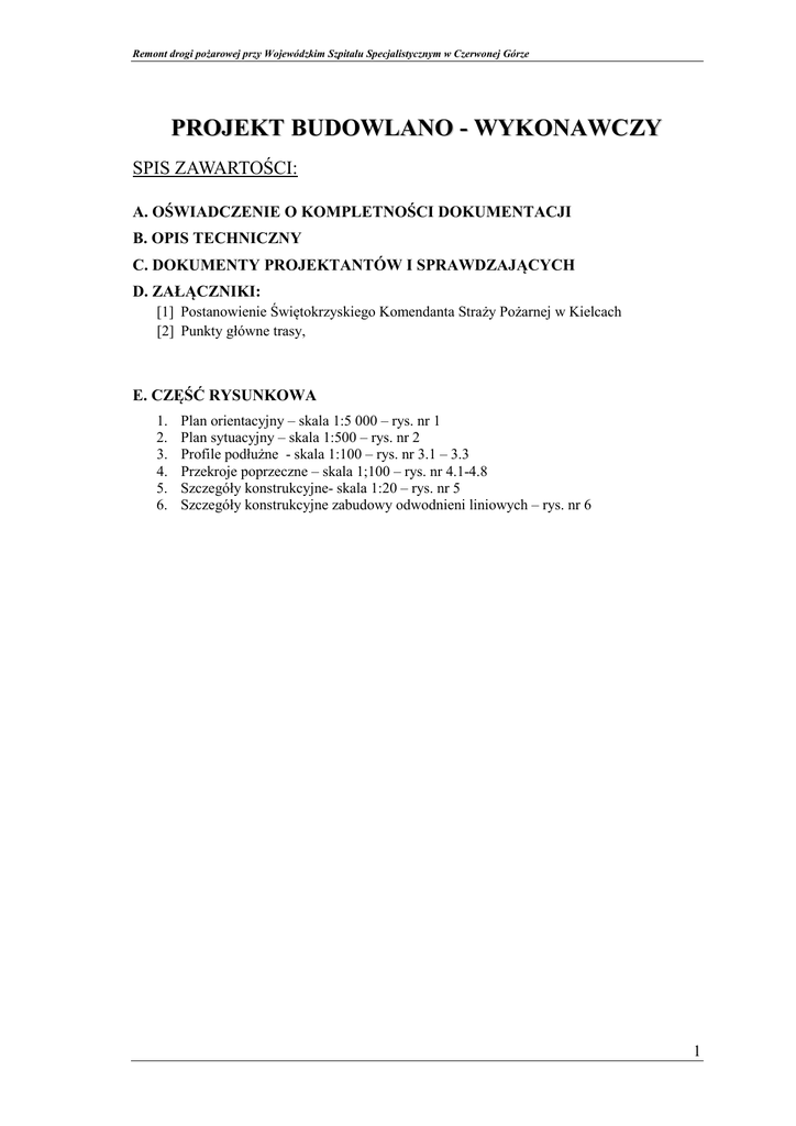 Remont drogi pożarowej przy Wojewódzkim Szpitalu Specjalistycznym w Czerwonej Górze PROJEKT BUDOWLANO - WYKONAWCZY SPIS ZAWARTOŚCI: A. OŚWIADCZENIE O KOMPLETNOŚCI DOKUMENTACJI B. OPIS TECHNICZNY C. DOKUMENTY PROJEKTANTÓW I SPRAWDZAJĄCYCH D. ZAŁĄCZNIKI: [1] Postanowienie Świętokrzyskiego Komendanta Straży Pożarnej w Kielcach [2] Punkty główne trasy, E. CZĘŚĆ RYSUNKOWA 1. 2. 3. 4. 5. 6. Plan orientacyjny – skala 1:5 000 – rys. nr 1 Plan sytuacyjny – skala 1:500 – rys. nr 2 Profile podłużne - skala 1:100 – rys. nr 3.1 – 3.3 Przekroje poprzeczne – skala 1;100 – rys. nr 4.1-4.8 Szczegóły konstrukcyjne- skala 1:20 – rys. nr 5 Szczegóły konstrukcyjne zabudowy odwodnieni liniowych – rys. nr 6 1 Remont drogi pożarowej przy Wojewódzkim Szpitalu Specjalistycznym w Czerwonej Górze Kielce dnia 10.2016 OŚWIADCZENIE O KOMPLETNOŚCI DOKUMENTACJI dla: Wojewódzkiego Szpitala Specjalistycznego im. Św. Rafała w Czerwonej Górze pod nazwą: Remont istniejącej drogi dojazdowej oraz dojść do segmentów D i E przy Wojewódzkim Szpitalu Specjalistycznym im. Św. Rafała w Czerwonej Górze w stadium: PROJEKT BUDOWLANO - WYKONAWCZY Powyższa dokumentacja została sporządzona zgodnie z obowiązującymi przepisami oraz zasadami wiedzy technicznej, została poddana sprawdzeniu pod względem zgodności z w/w przepisami oraz jest kompletna z punktu widzenia celu, któremu ma służyć i może być skierowana do realizacji. BRANŻA DROGOWA Projektant: mgr inż. Andrzej Kasprzyk Sprawdzający: mgr inż. Agnieszka Żaba - Żabińska ………………………………………………... ………………………………………………... Projektant: mgr inż. Teresa Kozłowska ………………………………………………... 2 Remont drogi pożarowej przy Wojewódzkim Szpitalu Specjalistycznym w Czerwonej Górze B. OPIS TECHNICZNY 3 Remont drogi pożarowej przy Wojewódzkim Szpitalu Specjalistycznym w Czerwonej Górze Spis treści: 1. 2. 3. 4. 1. 2. 3. 5. 6. 1. 2. 3. PODSTAWA OPRACOWANIA .................................................................................................... 5 PRZEDMIOT, LOKALIZACJA I ZAKRES INWESTYCJI ...................................................... 6 KOLEJNOŚĆ REALIZACJI INWESTYCJI................................................................................ 6 ISTNIEJĄCE ZAGOSPODAROWANIE TERENU .................................................................... 6 INFORMACJE OGÓLNE ..................................................................................................................... 6 OPIS TERENU ISTNIEJĄCEGO PRZEZNACZONEGO POD INWESTYCJĘ ................................................. 6 WARUNKI GEOLOGICZNE I HYDROGEOLOGICZNE ........................................................................... 6 PRZEWIDYWANE ZMIANY W ISTNIEJĄCYM ZAGOSPODAROWANIU TERENU....... 8 PROJEKTOWANE ZAGOSPODAROWANIE TERENU .......................................................... 8 INFORMACJE OGÓLNE ..................................................................................................................... 8 UKŁAD KOMUNIKACYJNY............................................................................................................... 8 PROJEKTOWANE OBIEKTY BUDOWLANE ......................................................................................... 8 1. Droga pożarowa .................................................................................................................. 8 1.1. 1.2. 1.3. 2. Ciągi komunikacyjne ............................................................................................................ 9 2.1. 2.2. 2.3. 7. 8. 9. 10. 11. 12. Ukształtowanie sytuacyjne............................................................................................................................ 8 Ukształtowanie wysokościowe ..................................................................................................................... 8 Układ konstrukcyjny ....................................................................................................................................... 9 Ukształtowanie sytuacyjne............................................................................................................................ 9 Ukształtowanie wysokościowe ..................................................................................................................... 9 Układ konstrukcyjny ....................................................................................................................................... 9 3. Odwodnienie ...................................................................................................................... 10 ROZBIÓRKA OBIEKTÓW BUDOWLANYCH ........................................................................ 11 BILANS TERENU I POWIERZCHNIA OBIEKTU .................................................................. 11 ODDZIAŁYWANIE OBIEKTU ................................................................................................... 11 WARUNKI BEZPIECZEŃSTWA I OCHRONA ZDROWIA NA TERENIE BUDOWY ..... 11 OCHRONA INTERESÓW OSÓB TRZECICH ......................................................................... 12 OCHRONA PRZECIWPOŻAROWA ......................................................................................... 12 4 Remont drogi pożarowej przy Wojewódzkim Szpitalu Specjalistycznym w Czerwonej Górze 1. Podstawa opracowania [1] Ustawa z dnia 7 lipca 1994 r. Prawo budowlane [2] Rozporządzenie Ministra Transportu, Budownictwa i Gospodarki Morskiej z dnia 25 kwietnia 2012 r. w sprawie szczegółowego zakresu i formy projektu budowlanego (Dz.U. poz. 452), [3] Rozporządzenie Ministra Transportu i Gospodarki Morskiej z dnia 2 marca 1999 r. w sprawie warunków technicznych, jakim powinny odpowiadać drogi publiczne i ich usytuowanie (Dz.U. Nr 43, poz. 430 ze zmianami Dz