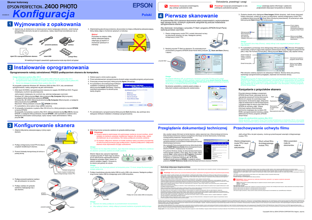 Ostrzeżenia, przestrogi i uwagi Skaner kolorowy w 4043856-00 Konfiguracja Polski skaner przewód zasilania kabel USB Przestrogi muszą być przestrzegane w celu uniknięcia uszkodzenia sprzętu. Pierwsze skanowanie 2. Zdejmij taśmę pakunkową ze skanera, ale pozostaw na miejscu żółtą taśmę zabezpieczającą, którą należy zdjąć w momencie opisanym w instrukcji. 3. Zostanie otwarte okno dialogowe View Images (Widok obrazów). Jeśli chcesz skanować kolejny dokument, umieść go na tacy na dokumenty, zamknij zintegrowany moduł TPU, a następnie kliknij przycisk Scan More (Kontynuuj skanowanie). W przeciwnym razie kliknij przycisk Next (Dalej), aby kontynuować. W tym miejscu wyświetlane są instrukcje korzystania z programu Smart Panel. Kliknij przycisk Scan More (Kontynuuj skanowanie), aby skanować następny dokument. 1. Otwórz zintegrowany moduł TPU i umieść dokument na tacy na dokumenty obrazem do dołu. Następnie zamknij zintegrowany moduł TPU. Ważne! Pozostaw na miejscu żółtą taśmę zabezpieczającą, zdejmując ją dopiero w momencie opisanym w instrukcji. zasilacz Uwagi zawierają ważne informacje i użyteczne podpowiedzi dotyczące korzystania ze skanera. Aby skanować, korzystając z przycisku] Start i programu EPSON Smart Panel, wykonaj poniższe czynności. Kliknij przycisk Next (Dalej) po zakończeniu skanowania. Uwaga: Aby wyświetlić okno Help (Pomoc), należy kliknąć znak zapytania w prawym dolnym rogu ekranu. 2. Naciśnij przycisk] Start na skanerze. Po automatycznym uruchomieniu programu EPSON Smart Panel kliknij znaczek i zapisz). dysk CD z oprogramowaniem skanera c W systemie Mac OS X pierwsze skanowanie należy przeprowadzić z wykorzystaniem tego samego konta, na którym użytkownik zalogował się podczas instalowania oprogramowania skanera. Wyjmowanie z opakowania 1. Upewnij się, że dostarczono w nienaruszonym stanie następujące elementy. Jeżeli brakuje jakiegokolwiek elementu lub jest on uszkodzony, należy natychmiast skontaktować się ze sprzedawcą. Ostrzeżenia muszą być przestrzegane, aby uniknąć uszkodzenia ciała. Scan and Save (Skanuj 4. Po wyświetleniu poniższego okna dialogowego kliknij przycisk Browse (Przeglądaj) i wskaż folder, w którym mają zostać zapisane zeskanowane obrazy. Następnie wybierz format pliku z listy File Format (Format pliku). Kliknij przycisk Save (Zapisz), aby zapisać obrazy. Określ ścieżkę do folderu, w którym zostaną zapisane obrazy. uchwyt filmu W niektórych krajach zawartość opakowania może się różnić od opisan Instrukcje korzystania z programu Smart Panel. przycisk Start Określ format pliku. Kliknij przycisk Save (Zapisz), aby zapisać obrazy. Instalowanie oprogramowania Oprogramowanie należy zainstalować PRZED podłączeniem skanera do komputera. Uwaga dotycząca systemu Mac OS X: ❏ To oprogramowanie nie obsługuje systemu plików UNIX (UFS) dla systemu Mac OS X. Oprogramowanie należy zainstalować na dysku lub partycji, która nie używa systemu plików UFS. ❏ Skaner nie obsługuje środowiska Classic systemu Mac OS X. W przypadku systemów Windows XP, Windows 2000 lub Mac OS X, aby zainstalować oprogramowanie, należy zalogować się jako administrator. 1. Włóż dysk CD-ROM z oprogramowaniem skanera do napędu CD-ROM lub DVD. Program instalacyjny uruchomi się automatycznie. Jeśli program instalacyjny nie uruchomi się, wykonaj następujące czynności: Windows XP: Kliknij przycisk Start, kliknij polecenie My Computer (Mój komputer), a następnie kliknij dwukrotnie polecenie EPSON. Windows Me, 98 i 2000: Kliknij dwukrotnie ikonę My Computer (Mój komputer), a następnie kliknij dwukrotnie ikonę EPSON. Macintosh: Kliknij podwójnie znaczek EPSON CD-ROM. Po wyświetleniu okna wyboru kraju wybierz swój kraj. 2. W przypadku korzystania z systemu Mac OS 8.6 do 9.x, kliknij podwójnie znaczek EPSON w teczce EPSON. W przypadku korzystania z systemu Mac OS X, kliknij podwójnie teczkę Mac OS X w teczce EPSON, a następnie kliknij podwójnie znaczek EPSON. Jeśli wyświetlone zostanie okno dialogowe Authorization (Autoryzacja), wpisz nazwę i hasło administratora i kliknij przycisk OK. 3. 4. 5. 6. Uwaga: W systemie Windows XP, po pierwszym naciśnięciu przycisku ] Start może zostać wyświetlony komunikat. W takim wypadku należy wybrać opcję Smart Panel for Scanner, zaznaczyć pozycję Always use this program for this action (Zawsze używaj tego programu do tej akcji), a następnie kliknąć przycisk OK. Wybierz język w oknie wyboru języka. Przed zainstalowaniem oprogramowania drukarki wyłącz wszystkie programy antywirusowe. Przeczytaj umowę licencyjną i kliknij przycisk Agree (Akceptuję). Po wyświetleniu okna dialogowego Software Installation (Instalacja oprogramowania) kliknij przycisk Install (Zainstaluj). Wykonuj instrukcje wyświetlane na ekranie przez każdy program. Na ekranie wyświetlony zostanie pasek postępu, a dokument zostanie automatycznie zeskanowany. Pliki obrazów zostaną zapisane we wskazanym folderze. Możesz teraz przy pomocy wybranego oprogramowania przeglądać, edytować lub drukować obrazy. Uwaga: Naciśnięcie przycisku ] Start domyślnie uruchamia program EPSON Smart Panel. Program EPSON Smart Panel umożliwia skanowanie i wysyłanie danych bezpośrednio do określonej aplikacji. Aby uzyskać więcej informacji, należy zapoznać się z Dokumentacją techniczną, która znajduje się na dysku CD z oprogramowaniem, oraz skorzystać z Pomocy programu EPSON Smart Panel. Korzystanie z przycisków skanera Przyciski skanera działają z programem EPSON Smart Panel, stanowiąc skrót do Start najczęściej używanych funkcji skanowania. Można ich używać do automatycznego skanowania i drukowania zdjęć, dołączania Kopiowanie zdjęć do wiadomości e-mail lub skanowania i wysyłania zdjęć do witryny sieci Web firmy Skanowanie EPSON do wymiany zdjęć. Więcej do wiadomości informacji zawiera Dokumentacja e-mail t