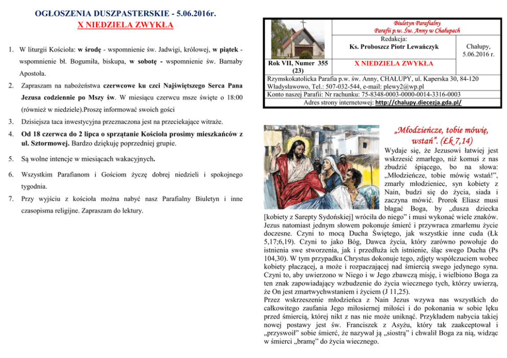 OGŁOSZENIA DUSZPASTERSKIE - 5.06.2016r. X NIEDZIELA ZWYKŁA 1. W liturgii Kościoła: w środę - wspomnienie św. Jadwigi, królowej, w piątek wspomnienie bł. Bogumiła, biskupa, w sobotę - wspomnienie św. Barnaby Apostoła. 2. Zapraszam na nabożeństwa czerwcowe ku czci Najświętszego Serca Pana Jezusa codziennie po Mszy św. W miesiącu czerwcu msze święte o 18:00 Biuletyn Parafialny Parafii p.w. Św. Anny w Chałupach Redakcja: Ks. Proboszcz Piotr Lewańczyk Chałupy, 5.06.2016 r. Rok VII, Numer 355 X NIEDZIELA ZWYKŁA (23) Rzymskokatolicka Parafia p.w. św. Anny, CHAŁUPY, ul. Kaperska 30, 84-120 Władysławowo, Tel.: 507-032-544, e-mail: [email protected] Konto naszej Parafii: Nr rachunku: 75-8348-0003-0000-0014-3316-0003 Adres strony internetowej: http://chalupy.diecezja.gda.pl/ (również w niedziele).Proszę informować swoich gości 3. Dzisiejsza taca inwestycyjna przeznaczona jest na przeciekające witraże. 4. Od 18 czerwca do 2 lipca o sprzątanie Kościoła prosimy mieszkańców z ul. Sztormowej. Bardzo dziękuję poprzedniej grupie. 5. Są wolne intencje w miesiącach wakacyjnych. 6. Wszystkim Parafianom i Gościom życzę dobrej niedzieli i spokojnego tygodnia. 7. Przy wyjściu z kościoła można nabyć nasz Parafialny Biuletyn i inne czasopisma religijne. Zapraszam do lektury. „Młodzieńcze, tobie mówię, wstań”. (Łk 7,14) Wydaje się, że Jezusowi łatwiej jest wskrzesić zmarłego, niż komuś z nas zbudzić śpiącego, bo na słowa: „Młodzieńcze, tobie mówię wstań!”, zmarły młodzieniec, syn kobiety z Nain, budzi się do życia, siada i zaczyna mówić. Prorok Eliasz musi błagać Boga, by „dusza dziecka [kobiety z Sarepty Sydońskiej] wróciła do niego” i musi wykonać wiele znaków. Jezus natomiast jednym słowem pokonuje śmierć i przywraca zmarłemu życie doczesne. Czyni to mocą Ducha Świętego, jak wszystkie inne cuda (Łk 5,17;6,19). Czyni to jako Bóg, Dawca życia, który zarówno powołuje do istnienia swe stworzenia, jak i przedłuża ich istnienie, śląc swego Ducha (Ps 104,30). W tym przypadku Chrystus dokonuje tego, zdjęty współczuciem wobec kobiety płaczącej, a może i rozpaczającej nad śmiercią swego jedynego syna. Czyni to, aby uwierzono w Niego i w Jego zbawczą misję, i wielbiono Boga za ten znak zapowiadający wzbudzenie do życia wiecznego tych, którzy uwierzą, że On jest zmartwychwstaniem i życiem (J 11,25). Przez wskrzeszenie młodzieńca z Nain Jezus wzywa nas wszystkich do całkowitego zaufania Jego miłosiernej miłości i do pokonania w sobie lęku przed śmiercią, której nikt z nas nie może uniknąć. Przykładem nabycia takiej nowej postawy jest św. Franciszek z Asyżu, który tak zaakceptował i „przyswoił” sobie śmierć, że nazywał ją „siostrą” i chwalił Boga za nią, widząc w śmierci „bramę” do życia wiecznego. Błogosławiony Bogumił-Piotr, biskup Bogumił urodził się w Koźminie (Wielkopolska). Pochodził ze znakomitego rodu Leszczyców. Przyszedł na świat ok. 1135 r. Jego bliższym krewnym, może nawet bratem, był cysters w Łeknie, Boguchwał. W roku 1185 miał powstać klasztor cystersów w Koprzywnicy, a jego opatem miał być wybrany wówczas właśnie BogumiłPiotr. W roku 1186 Bogumił został powołany na urząd biskupa w Poznaniu. Do dziś w skarbcu katedry przechowywana jest jego stuła. Jednak już w roku następnym, 1187, po śmierci arcybiskupa gnieźnieńskiego Zdzisława, Bogumił został powołany do Gniezna na jego następcę. Bogumił był chlubą zakonu cysterskiego dzięki swojej mądrości, uczynności, dzielności, świętości i hojnej fundacji na cele misyjne. Swoje przywiązanie do zakonu cystersów okazał Bogumił zaraz na początku swoich rządów, kiedy przeznaczył dochody z kilkunastu wsi, należących do metropolii, na zorganizowanie nowego opactwa cystersów w Sulejowie, które ufundował wtedy książę Kazimierz Sprawiedliwy. Opactwu cysterskiemu w Łeknie ofiarował dochody z trzech innych wsi. O publicznej działalności Błogosławionego wiemy tyle, że w roku 1191 uczestniczył w konsekracji kolegiaty sandomierskiej. Wezwany na rozjemcę w sporze między benedyktynami a norbertanami o opactwo św. Wincentego we Wrocławiu w roku 1193, przydzielił je norbertanom. Jemu też zlecono delikatną i trudną misję pojednania książąt Kazimierza Sprawiedliwego z Mieszkiem Starym. W rodzinnym majątku, w Dobrowie, Bogumił ufundował kościół parafialny Świętej Trójcy i hojnie go uposażył. Spragniony ciszy i spokoju, po dwunastu latach rządzenia metropolia gnieźnieńską, w 1198 r. złożył rezygnację na ręce legata papieskiego, kardynała Piotra, i przeniósł się do Dobrowa, gdzie na wyspie rzeki Warty założył sobie pustelnię. W każdą niedzielę dla okolicznych mieszkańców odprawiał Msze św. i wygłaszał kazania. Przeżył tam ok. 5 lat. Dobra rodzinne przeznaczył na misje wśród pogańskich Prusów. Przypuszczalny rok jego śmierci to ok. 1204 r. Jego cześć od samego początku była żywa. Obejmowała zwłaszcza rejon Wielkopolski. Uciekano się do jego wstawiennictwa przede wszystkim, by uprosić zdrowie dla żywego inwentarza oraz o szczęśliwe połowy ryb. U jego grobu w kościele dobrowskim składano liczne wota dziękczynne za wyjednane łaski. Prymas Jakub Uchański (1562-1581) w czasie badania relikwii Bogumiła wyjął z jego sarkofagu mitrę i pierścień biskupi z szafirem oraz złotą blachę z napisem pośmiertnym. Proces kanoniczny rozpoczął dopiero w roku 1625 prymas Maciej Łubieński. Akta tego procesu zostały przesłane do Rzymu w roku 1651. Niestety, księga cudów, którą wypożyczył Sebastian Głębocki, spłonęła w jego dworze w Głębokim pod Kruszwicą. Dopiero papież Pius XI 27 maja 1925 roku zatwierdził starodawny kult biskupa Bogumiła. INTENCJE MSZALNE 5.06 – 12.06.2016 r. 9:00 X Niedziela Zwykła 5.06.2016 11:00 SUMA + za Renatę, Wojciecha i Piotrka 