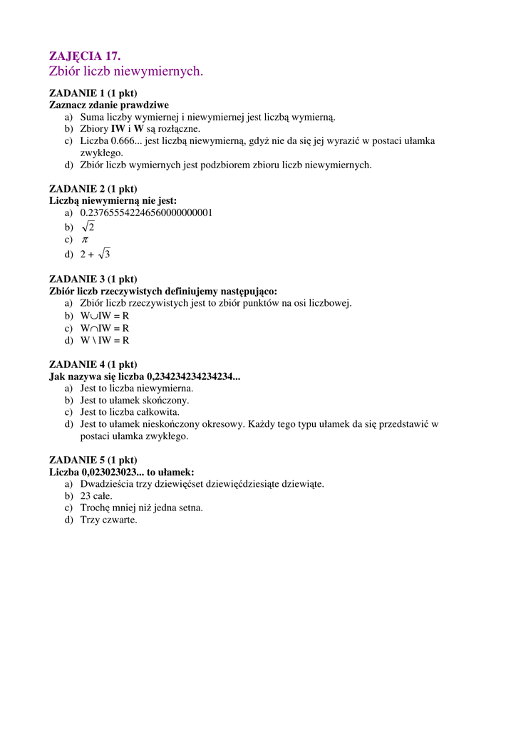 ZAJĘCIA 17. Zbiór liczb niewymiernych. ZADANIE 1 (1 pkt) Zaznacz zdanie prawdziwe a) Suma liczby wymiernej i niewymiernej jest liczbą wymierną. b) Zbiory IW i W są rozłączne. c) Liczba 0.666... jest liczbą niewymierną, gdyŜ nie da się jej wyrazić w postaci ułamka zwykłego. d) Zbiór liczb wymiernych jest podzbiorem zbioru liczb niewymiernych. ZADANIE 2 (1 pkt) Liczbą niewymierną nie jest: a) 0.237655542246560000000001 b) 2 c) π d) 2 + 3 ZADANIE 3 (1 pkt) Zbiór liczb rzeczywistych definiujemy następująco: a) Zbiór liczb rzeczywistych jest to zbiór punktów na osi liczbowej. b) W∪IW = R c) W∩IW = R d) W \ IW = R ZADANIE 4 (1 pkt) Jak nazywa się liczba 0,234234234234234... a) Jest to liczba niewymierna. b) Jest to ułamek skończony. c) Jest to liczba całkowita. d) Jest to ułamek nieskończony okresowy. KaŜdy tego typu ułamek da się przedstawić w postaci ułamka zwykłego. ZADANIE 5 (1 pkt) Liczba 0,023023023... to ułamek: a) Dwadzieścia trzy dziewięćset dziewięćdziesiąte dziewiąte. b) 23 całe. c) Trochę mniej niŜ jedna setna. d) Trzy czwarte.