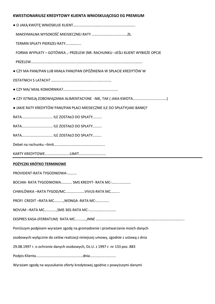 KWESTIONARIUSZ KREDYTOWY KLIENTA WNIOSKUJĄCEGO EG PREMIUM ● O JAKĄ KWOTĘ WNIOSKUJE KLIENT………………………………………………………….. MAKSYMALNA WYSOKOŚĆ MIEISIECZNEJ RATY …………………………………ZŁ. TERMIN SPŁATY PIERSZEJ RATY…………….. FORMA WYPŁATY – GOTÓWKA ,- PRZELEW (NR. RACHUNKU –JEŚLI KLIENT WYBIEŻE OPCJE PRZELEW………………………………………………………………………………………………………….. ● CZY MA PANI/PAN LUB MIAŁA PANI/PAN OPÓŹNIENIA W SPŁACIE KREDYTÓW W OSTATNICH 5 LATACH? ………………………………………………………… ● CZY MA/ MIAŁ KOMORNIKA?…………………………………………………… ● CZY ISTNIEJĄ ZOBOWIĄZANIA ALIMENTACYJNE -NIE, TAK ( JAKA KWOTA……………………………….) ● JAKIE RATY KREDYTÓW PANI/PAN PŁACI MIESIECZNIE ILE DO SPŁATY(JAKI BANK)? RATA............................... ILE ZOSTAŁO DO SPŁATY......... RATA............................... ILE ZOSTAŁO DO SPŁATY......... RATA............................... ILE ZOSTAŁO DO SPŁATY......... Debet na rachunku –limit……………………………………………….. KARTY KREDYTOWE.........................LIMIT........................... POŻYCZKI KRÓTKO TERMINOWE PROVIDENT-RATA TYGODNIOWA-………. BOCIAN- RATA TYGODNIOWA………… SMS KREDYT- RATA MC-………………… CHWILÓWKA –RATA TYGOD/MC…………………VIVUS-RATA MC………. PROFI CREDIT –RATA MC……….,WONGA -RATA MC-………….. NOVUM –RATA MC………….,SMS 365-RATA MC-………………………… EKSPRES KASA-(FERRATUM) RATA MC…………,INNE ……………………………………………………………………………………. Poniższym podpisem wyrażam zgodę na gromadzenie i przetwarzanie moich danych osobowych wyłącznie do celów realizacji niniejszej umowy, zgodnie z ustawą z dnia 29.08.1997 r. o ochronie danych osobowych, Dz.U. z 1997 r. nr 133 poz. 883 Podpis Klienta...............................................dnia.......................... Wyrażam zgodę na wyszukanie oferty kredytowej zgodnie z powyższymi danymi