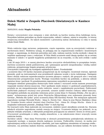 Aktualności Dzień Matki w Zespole Placówek Oświatowych w Kasince Małej 26/05/2010, dodał: Magda Polańska Święta i uroczystości oraz związane z nimi obchody są bardzo ważną sferą ludzkiego życia. Wszystkim ludziom potrzebne są chwile wypoczynku, radości i zabawy, zatem to wszystko, co tworzy świąteczną niezwykłość. Do takich momentów z pewnością należy obchodzony co roku w naszej szkole Dzień Matki. Wielu rodziców żyjąc nerwowo, pośpiesznie, często zapomina, czym są uroczystości rodzinne w wychowaniu dzieci. Niektórzy uznają, że polegają one na organizowaniu wielkich i kosztownych przyjęć, a zapominają, że dzieciom potrzebny jest miły, radosny nastrój, trochę swobody i okazji do wspólnie spędzonego czasu z rodzicami. W Dniu Matki uczniowie mieli okazję spotkać się ze swoimi mamami w szkole i w sposób wyjątkowy podziękować im za wszystko, co dla nich zrobiły i nadal robią. I tak 26 maja 2010 r. w naszej placówce bardzo uroczyście obchodziliśmy to przepiękne święto. Zarówno uczniowie szkoły podstawowej, jak i gimnazjum sprawili niespodziankę i wielką radość rodzicom, przygotowując bogate programy artystyczne. Uroczystości rozpoczęły się występem najmłodszych dzieci. Przedszkolaki i uczniowie klas I-III bardzo starannie przygotowali się do występów; recytowali wiersze, śpiewali piosenki, grali na instrumentach oraz przedstawili zabawne scenki z życia rodzinnego. Następnie dzieci złożyły rodzicom najserdeczniejsze życzenia płynące z małych, ale gorących serc i wręczyły własnoręcznie przygotowane laurki. Występy wszystkim bardzo się podobały, a aktorzy zebrali mnóstwo braw i pochwał. Po przedstawieniu zaproszono wszystkich na poczęstunek. Następnie młodzież gimnazjalna dostarczyła wiele radości i wzruszeń swoim mamom prezentując wspaniały montaż słowno-muzyczny. Choć spotkanie miało miejsce w godzinach popołudniowych, przybyło na nie niespodziewanie wielu rodziców, nawet z najmłodszymi pociechami. Publiczność wysłuchała pięknych recytacji oraz piosenek, uznanie zyskał również ciekawy układ taneczny. Szczególnie podobała się piosenka wykonana przez ucznia klasy Ic Daniama Klimka „Nie ma jak u mamy” wylansowana przed laty przez Wojciecha Młynarskiego oraz wykonanie piosenki Anny German „Melodia dla synka” przez uczennicę klasy IIIb Karolinę Nowak. Nie mniejszym aplauzem nagrodzono występy Weroniki Wydry – klasa Ic, Doroty Cież – klasa Ia oraz Marysi Skalskiej z klasy Ib. Gromkie brawa zebrał również duet Ewelina Cież – klasa Ib i Kinga Mucha - klasa Ic za oryginalne wykonanie piosenki „Dziękuję Tobie” w stylu hip hop. Na twarzach wielu Mam malowało się wzruszenie, niektóre nawet ukradkiem ocierały łzy. Starania młodych artystów nagrodzone zostały owacją na stojąco. Uczniowie kolejny raz pokazali, że są pełnymi wdzięku artystami, z olbrzymim przejęciem pracującymi na uśmiech i brawa ze strony gości. Uroczystość przebiegała w miłej, ciepłej atmosferze, a na zakończenie dzieci wręczyły swoim rodzicom kwiaty. Dyrektor szkoły – Pani Anna Piwowarska w słowach przemówienia podziękowała młodzieży za wspaniałe występy, a mamom złożyła najlepsze życzenia. Podkreśliła również, że matka jest najważniejszą osobą w życiu każdego człowieka, jest nam najbliższa niezależnie od naszego wieku nieważne, czy jesteśmy małymi dziećmi, nastolatkami, czy już całkiem dorosłymi ludźmi. Po tych ciepłych słowach wszyscy spotkali się na słodkim poczęstunku przy kawie i herbatce oraz wspaniałych wypiekach przygotowanych w większej części przez same uczennice gimnazjum. Zobacz zdjęcia Oprac. D. Borowiec