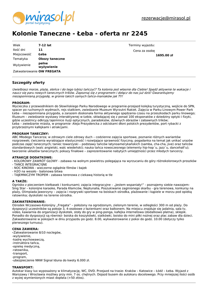 [email protected] Kolonie Taneczne - Łeba - oferta nr 2245 Wiek 7-12 lat Ilość dni 11 Miejscowość Łeba Tematyka Obozy taneczne Wyżywienie pełne wyżywienie Terminy wyjazdu: Cena za osobę 1695.00 zł Zakwaterowanie OW FREGATA Szczegóły oferty Uwielbiasz morze, plażę, słońce i do tego lubisz tańczyć? Ta kolonia jest własnie dla Ciebie! Spędź aktywnie te wakacje i naucz się paru nowych tanecznych trików. Zapoznaj się z programem i dołącz do nas już dziś! Gwarantujemy niezapomnianą przygodę, w gronie takich samych tańco-maniaków jak TY! PROGRAM: Wycieczka z przewodnikiem do Słowińskiego Parku Narodowego w programie-przejazd kolejką turystyczną, wejście do SPN, spacer po ruchomych wydmach, rejs statkiem, zwiedzanie Muzeum Wyrzutni Rakiet. Zajęcia w Parku Linowym Power Park Łeba – niezapomniana przygoda, a zarazem doskonała forma aktywnego spędzania czasu na przeszkodach parku linowego; Illuzeum – zwiedzanie wystawy interaktywnej w Łebie, składającej się z ponad 100 eksponatów z dziedziny optyki i fizyki, gdzie uczestnicy odkryją tajemnice iluzji optycznych, paradoksów, dziwnych obrazów i zabawnych trików; Łeba – zwiedzanie miasta, w programie- Aleja Prezydencka z odciskami dłoni polskich prezydentów, port rybacki z przybrzeżnymi kafejkami i atrakcjami. PROGRAM TANECZNY: ABC Młodego Tancerza; w zdrowym ciele zdrowy duch – codzienne zajęcia sportowe, poznanie różnych wariantów rozgrzewek; ćwiczenia wyrabiające elastyczność i rozwijające sprawność fizyczną; pogadanka na temat jak unikać urazów podczas zajęć tanecznych; taniec towarzyski – podstawy tańców latynoamerykańskich (samba, cha-cha, jive) oraz tańców standardowych (walc angielski, walc wiedeński); nauka tańca nowoczesnego (elementy hip-hop΄u, jazz΄u, dancehall’u); tworzenie układów tanecznych; pokazy finałowe – zaprezentowanie nabytych umiejętności przez młodych tancerzy. ATRAKCJE DODATKOWE: - KOLOROWY ZAWRÓT GŁOWY - zabawa na wolnym powietrzu polegająca na wyrzucaniu do góry różnokolorowych proszków - TAŃCE INTEGRACYJNE - NOC KINOWA - wieczorne oglądnie filmów i bajek - H2O na wesoło - balonowa bitwa - TAJEMNICZYM TROPEM - zabawa terenowa z ciekawą historią w tle A TAKŻE: Ognisko z pieczeniem kiełbasek i konkursami; zajęcia integracyjne – „Jestem wspaniały!” - poznajemy siebie nawzajemSing Star – kolonijne karaoke, Parada Kłamców, Neptunalia, Poszukiwanie zaginionego skarbu - gra terenowa, konkursy na plaży, Olimpiada Jaworzyny – zajęcia i rozgrywki sportowe na boiskach ośrodka, plażowanie i kąpiele w morzu pod opieką ratownika; dyskoteki na terenie ośrodka. ZAKWATEROWANIE: Ośrodek Wczasowo-Kolonijny „Fregata” – położony na ogrodzonym, zielonym terenie, w odległości 300 m od plaży. Do dyspozycji uczestników są pokoje 3, 4-osobowe z łazienkami oraz balkonem. Na miejscu znajduje się jadalnia, sala tv, video, kawiarnia do organizacji dyskotek, stoły do gry w ping-ponga, kafejka internetowa (dodatkowo płatna), sklepik. Ponadto do dyspozycji są również- boiska do koszykówki, siatkówki, boisko do mini piłki nożnej oraz plac zabaw dla dzieci. Zakwaterowanie w pokojach w dniu przyjazdu po godz. 8.00, wykwaterowanie z pokoi do godz. 10.00 (dotyczy tylko pierwszego turnusu). CENA ZAWIERA: -Zakwaterowanie 8/10 noclegów, -wyżywienie, -kadrę wychowawczą, -instruktora tańca, -opiekę medyczną, -ratownika, -transport, -program, -ubezpieczenie NNW Signal Iduna do kwoty 6.000 zł. TRANSPORT: Autokar klasy lux wyposażony w klimatyzację, WC, DVD. Przejazd na trasie- Kraków – Katowice – Łódź – Łeba. Wyjazd z Warszawy i Wrocławia możliwy przy min. 7 os. chętnych. Dojazd busem do autokaru docelowego. Przy mniejszej ilości osób z wyżej wymienionych miast dopłata (+50 zł/os). Jak rezerwować Aby wstępnie zarezerwować wyjazd, Klient powinien: -podać w wyszukiwarce parametry obozu/kolonii , którymi jest zainteresowany . (np. kraj, miasto, tematykę wyjazdu, wiek itp.) i kliknąć Wyszukaj oferty -po wyświetleniu wyników wyszukiwania przeczytać opisy wyjazdów, wybrać jeden z nich i kliknąć Przejdź do rezerwacji , gdzie znajduje się Formularz rezerwacyjny -wypełnić Formularz rezerwacyjny, w którym należy podać prawidłowe dane osobowe uczestników wyjazdu, niezbędne do dokonania rezerwacji -po wprowadzeniu danych zaakceptować Regulamin i Warunki uczestnictwa Organizatora imprezy turystycznej (znajdujące się przy opisie oferty) i kliknąć Wyślij Kolejne kroki: - po potwierdzeniu telefonicznym i mailowym przezKonsultanta mirasol.pl dostępności miejsc i otrzymaniu mailem Potwierdzenia rezerwacji, należy wpłacić wymaganą zaliczkę lub całą kwotę za wyjazd - w momencie dokonania wpłaty zawarta zostaje Umowa pomiędzy Klientem a Organizatorem imprezy za pośrednictwem Agenta (mirasol.pl) i jest to równoznaczne z akceptacją przez KlientaUmowy i Warunków Uczestnictwa Organizatora. - w ustalonym przez Organizatora terminie Klient zobowiązany jest dowpłacenia pełnej opłaty za wyjazd oraz do dostarczenia wymaganych przez Organizatora dokumentów -po przesłaniu pełnej wpłaty i dokumentów Klient otrzyma drogą mailową dokumenty podróżne (skierowanie), które zawierają wszystkie niezbędne informacje na temat imprezy turystycznej oraz dojazdu i są podstawą przyjęcia uczestnika na obóz / kolonię.