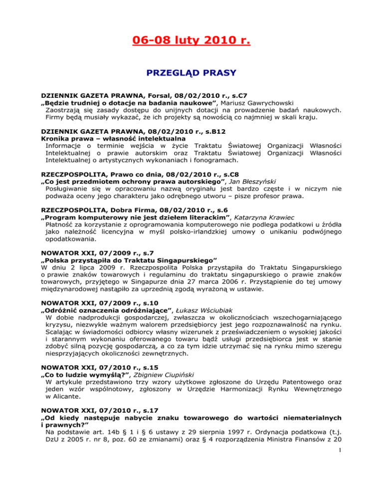 06-08 luty 2010 r. PRZEGLĄD PRASY DZIENNIK GAZETA PRAWNA, Forsal, 08/02/2010 r., s.C7 „Będzie trudniej o dotacje na badania naukowe”, Mariusz Gawrychowski Zaostrzają się zasady dostępu do unijnych dotacji na prowadzenie badań naukowych. Firmy będą musiały wykazać, że ich projekty są nowością co najmniej w skali kraju. DZIENNIK GAZETA PRAWNA, 08/02/2010 r., s.B12 Kronika prawa – własność intelektualna Informacje o terminie wejścia w życie Traktatu Światowej Organizacji Własności Intelektualnej o prawie autorskim oraz Traktatu Światowej Organizacji Własności Intelektualnej o artystycznych wykonaniach i fonogramach. RZECZPOSPOLITA, Prawo co dnia, 08/02/2010 r., s.C8 „Co jest przedmiotem ochrony prawa autorskiego”, Jan Błeszyński Posługiwanie się w opracowaniu nazwą oryginału jest bardzo częste i w niczym nie podważa oceny jego charakteru jako odrębnego utworu – pisze profesor prawa. RZECZPOSPOLITA, Dobra Firma, 08/02/2010 r., s.6 „Program komputerowy nie jest dziełem literackim”, Katarzyna Krawiec Płatność za korzystanie z oprogramowania komputerowego nie podlega podatkowi u źródła jako należność licencyjna w myśl polsko-irlandzkiej umowy o unikaniu podwójnego opodatkowania. NOWATOR XXI, 07/2009 r., s.7 „Polska przystąpiła do Traktatu Singapurskiego” W dniu 2 lipca 2009 r. Rzeczpospolita Polska przystąpiła do Traktatu Singapurskiego o prawie znaków towarowych i regulaminu do traktatu singapurskiego o prawie znaków towarowych, przyjętego w Singapurze dnia 27 marca 2006 r. Przystąpienie do tej umowy międzynarodowej nastąpiło za uprzednią zgodą wyrażoną w ustawie. NOWATOR XXI, 07/2009 r., s.10 „Odróżnić oznaczenia odróżniające”, Łukasz Wściubiak W dobie nadprodukcji gospodarczej, zwłaszcza w okolicznościach wszechogarniającego kryzysu, niezwykle ważnym walorem przedsiębiorcy jest jego rozpoznawalność na rynku. Scalając w świadomości odbiorcy własny wizerunek z przeświadczeniem o wysokiej jakości i starannym wykonaniu oferowanego towaru bądź usługi przedsiębiorca jest w stanie zdobyć silną pozycję gospodarczą, a co za tym idzie utrzymać się na rynku mimo szeregu niesprzyjających okoliczności zewnętrznych. NOWATOR XXI, 07/2010 r., s.15 „Co to ludzie wymyślą?”, Zbigniew Ciupiński W artykule przedstawiono trzy wzory użytkowe zgłoszone do Urzędu Patentowego oraz jeden wzór wspólnotowy, zgłoszony w Urzędzie Harmonizacji Rynku Wewnętrznego w Alicante. NOWATOR XXI, 07/2010 r., s.17 „Od kiedy następuje nabycie znaku towarowego do wartości niematerialnych i prawnych?” Na podstawie art. 14b § 1 i § 6 ustawy z 29 sierpnia 1997 r. Ordynacja podatkowa (t.j. DzU z 2005 r. nr 8, poz. 60 ze zmianami) oraz § 4 rozporządzenia Ministra Finansów z 20 1 czerwca 2007 r. w sprawie upoważnienia do wydawania interpretacji przepisów prawa podatkowego (DzU nr 112, poz. 770 ze zmianami) Dyrektor Izby Skarbowej w Bydgoszczy działając w imieniu Ministra Finansów stwierdza, że stanowisko Spółki przedstawione we wniosku z 9 marca 2009 r. o udzielenie pisemnej interpretacji przepisów prawa podatkowego dotyczącej podatku dochodowego od osób prawnych w zakresie kwalifikacji prawnej wydatków na nabycie prawa ochronnego znaku towarowego – jest nieprawidłowe. (Interpretacja indywidualna dyrektora Izby Skarbowej w Bydgoszczy). [Sygn. ITPB3/423139a/09/AW z 20.05/2009] NOWATOR XXI, 07/2010 r., s.4 „Dla kogo korzystne przystąpienie do Porozumienia Londyńskiego?”, Zbigniew Ciupiński Istota regulacji wynikającej z Porozumienia polega na tym, że państwa przystępujące do Porozumienia rezygnują z wymogu pełnego tłumaczenia patentu i dokumentacji patentowej na język urzędowy danego państwa przy procedurze walidacji patentu europejskiego. NOWATOR XXI, 06/2010 r., s.7 „Dziedziny wyłączone spod patentowania nie mogą przyczyniać się do postępu wynalazczego!”, Jerzy Grudzianka Wniosek o udzielenie patentu przedstawiony w Europejskim Urzędzie Patentowym zawierał zastrzeżenia odnoszące się do szczególnego porządku kroków nakierowanych na usprawnienie dostarczania poczty elektronicznej. Wydział Badań odmówił udzielenia patentu na tej podstawie, że materia do której odnosiło się zgłoszenie jest wyłączona spod możliwości patentowania. NOWATOR XXI, 06/2010 r., s.9 „Oprogramowania komputerowe naruszają patenty”, ZK Amerykański koncern Billa Gatesa – Microsoft jest koncernem, który regularnie płaci wysokie odszkodowania za naruszanie praw patentowych. Jest to firma, która chyba najczęściej płaci kary i do tego największe. NOWATOR XXI, 06/2010 r., s.11 „Unijne pieniądze na patenty”, Waldemar Gotowski We wprowadzaniu na rynek nowych produktów lub usług innowacyjnych pomysł to dopiero początek. Ważnym aspektem realizowania strategii rozwoju firmy jest prawo dotyczące własności przemysłowej, które chroni innowacyjne projekty przed kopiowaniem lub imitowaniem i daje przedsiębiorcom możliwość samodzielnego wdrożenia nowych produktów i usług w oparciu o najnowsze technologie. NOWATOR XXI, 06/2010 r., s.12 „Potrzeba tłumaczenia zastrzeżeń patentowych i opisu”, Zbigniew Ciupiński Koszty związane z walidacją tłumaczeń patentów największych światowych korporacji stanowią nieznaczny procent w budżetach przeznaczonych na ochronę własności intelektualnej. Jedynym beneficjentem tego Porozumienia mogą być mali i średni przedsiębiorcy, którzy zyskają możliwość: wskazywania większej liczby państw i utrzymywania na tych terytoriach ochrony; skierowania zaoszczędzonych środków na inne inicjatywy, w tym być może rozwijanie innych rozwiązań, chronionych patentami. NOWATOR XXI, 06/2010 r., s.18 „Formuła zastrzeżeń może wpływać na zdolność patentową”, Jerzy Grudzianka W artykule przedstawiono przykład ukazujący jak formuła zastrzeżeń może wpływać na zdolność patentową. 2 NOWA