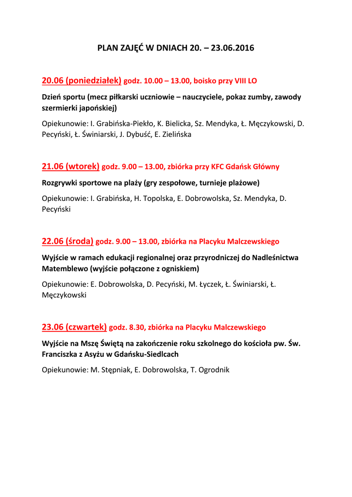 PLAN ZAJĘĆ W DNIACH 20. – 23.06.2016 20.06 (poniedziałek) godz. 10.00 – 13.00, boisko przy VIII LO Dzień sportu (mecz piłkarski uczniowie – nauczyciele, pokaz zumby, zawody szermierki japońskiej) Opiekunowie: I. Grabińska-Piekło, K. Bielicka, Sz. Mendyka, Ł. Męczykowski, D. Pecyński, Ł. Świniarski, J. Dybuść, E. Zielińska 21.06 (wtorek) godz. 9.00 – 13.00, zbiórka przy KFC Gdańsk Główny Rozgrywki sportowe na plaży (gry zespołowe, turnieje plażowe) Opiekunowie: I. Grabińska, H. Topolska, E. Dobrowolska, Sz. Mendyka, D. Pecyński 22.06 (środa) godz. 9.00 – 13.00, zbiórka na Placyku Malczewskiego Wyjście w ramach edukacji regionalnej oraz przyrodniczej do Nadleśnictwa Matemblewo (wyjście połączone z ogniskiem) Opiekunowie: E. Dobrowolska, D. Pecyński, M. Łyczek, Ł. Świniarski, Ł. Męczykowski 23.06 (czwartek) godz. 8.30, zbiórka na Placyku Malczewskiego Wyjście na Mszę Świętą na zakończenie roku szkolnego do kościoła pw. Św. Franciszka z Asyżu w Gdańsku-Siedlcach Opiekunowie: M. Stępniak, E. Dobrowolska, T. Ogrodnik