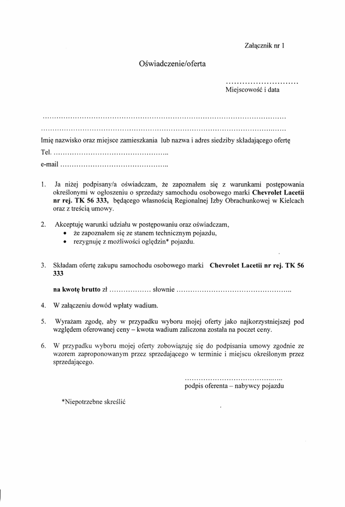 Załącznik nr 1 Oświadczenie/oferta Miejscowość i data Imię nazwisko oraz miejsce zamieszkania lub nazwa i adres siedziby składającego ofertę Tel. . e-mail . 1. Ja niżej podpisany/a oświadczam, że zapoznałem się z warunkami postępowania określonymi w ogłoszeniu o sprzedaży samochodu osobowego marki Chevrolet Lacetii nr rej. TK 56 333, będącego własnością Regionalnej Izby Obrachunkowej w Kielcach oraz z treścią umowy. 2. Akceptuję warunki udziału w postępowaniu oraz oświadczam, • że zapoznałem się ze stanem technicznym pojazdu, • rezygnuję z możliwości oględzin* pojazdu. 3. Składam ofertę zakupu samochodu osobowego marki 333 na kwotę brutto zł Chevrolet Lacetii nr rej. TK 56 słownie . 4. W załączeniu dowód wpłaty wadium. 5. Wyrażam zgodę, aby w przypadku wyboru mojej oferty jako najkorzystniejszej względem oferowanej ceny - kwota wadium zaliczona została na poczet ceny. 6. W przypadku wyboru mojej oferty zobowiązuję się do podpisania umowy zgodnie ze wzorem zaproponowanym przez sprzedającego w terminie i miejscu określonym przez sprzedającego. podpis oferenta - nabywcy pojazdu *Niepotrzebne skreślić pod