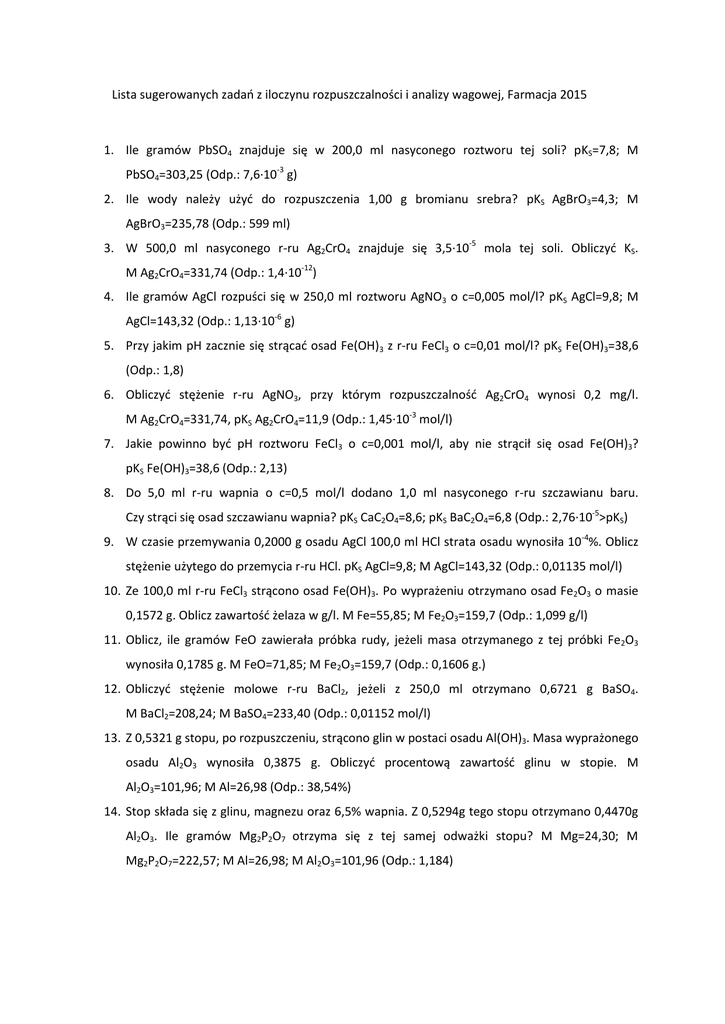 Lista sugerowanych zadań z iloczynu rozpuszczalności i analizy wagowej, Farmacja 2015 1. Ile gramów PbSO4 znajduje się w 200,0 ml nasyconego roztworu tej soli? pKS=7,8; M PbSO4=303,25 (Odp.: 7,6·10-3 g) 2. Ile wody należy użyć do rozpuszczenia 1,00 g bromianu srebra? pKS AgBrO3=4,3; M AgBrO3=235,78 (Odp.: 599 ml) 3. W 500,0 ml nasyconego r-ru Ag2CrO4 znajduje się 3,5·10-5 mola tej soli. Obliczyć KS. M Ag2CrO4=331,74 (Odp.: 1,4·10-12) 4. Ile gramów AgCl rozpuści się w 250,0 ml roztworu AgNO3 o c=0,005 mol/l? pKS AgCl=9,8; M AgCl=143,32 (Odp.: 1,13·10-6 g) 5. Przy jakim pH zacznie się strącać osad Fe(OH)3 z r-ru FeCl3 o c=0,01 mol/l? pKS Fe(OH)3=38,6 (Odp.: 1,8) 6. Obliczyć stężenie r-ru AgNO3, przy którym rozpuszczalność Ag2CrO4 wynosi 0,2 mg/l. M Ag2CrO4=331,74, pKS Ag2CrO4=11,9 (Odp.: 1,45·10-3 mol/l) 7. Jakie powinno być pH roztworu FeCl3 o c=0,001 mol/l, aby nie strącił się osad Fe(OH)3? pKS Fe(OH)3=38,6 (Odp.: 2,13) 8. Do 5,0 ml r-ru wapnia o c=0,5 mol/l dodano 1,0 ml nasyconego r-ru szczawianu baru. Czy strąci się osad szczawianu wapnia? pKS CaC2O4=8,6; pKS BaC2O4=6,8 (Odp.: 2,76·10-5>pKS) 9. W czasie przemywania 0,2000 g osadu AgCl 100,0 ml HCl strata osadu wynosiła 10 -4%. Oblicz stężenie użytego do przemycia r-ru HCl. pKS AgCl=9,8; M AgCl=143,32 (Odp.: 0,01135 mol/l) 10. Ze 100,0 ml r-ru FeCl3 strącono osad Fe(OH)3. Po wyprażeniu otrzymano osad Fe2O3 o masie 0,1572 g. Oblicz zawartość żelaza w g/l. M Fe=55,85; M Fe2O3=159,7 (Odp.: 1,099 g/l) 11. Oblicz, ile gramów FeO zawierała próbka rudy, jeżeli masa otrzymanego z tej próbki Fe2O3 wynosiła 0,1785 g. M FeO=71,85; M Fe2O3=159,7 (Odp.: 0,1606 g.) 12. Obliczyć stężenie molowe r-ru BaCl2, jeżeli z 250,0 ml otrzymano 0,6721 g BaSO4. M BaCl2=208,24; M BaSO4=233,40 (Odp.: 0,01152 mol/l) 13. Z 0,5321 g stopu, po rozpuszczeniu, strącono glin w postaci osadu Al(OH)3. Masa wyprażonego osadu Al2O3 wynosiła 0,3875 g. Obliczyć procentową zawartość glinu w stopie. M Al2O3=101,96; M Al=26,98 (Odp.: 38,54%) 14. Stop składa się z glinu, magnezu oraz 6,5% wapnia. Z 0,5294g tego stopu otrzymano 0,4470g Al2O3. Ile gramów Mg2P2O7 otrzyma się z tej samej odważki stopu? M Mg=24,30; M Mg2P2O7=222,57; M Al=26,98; M Al2O3=101,96 (Odp.: 1,184)