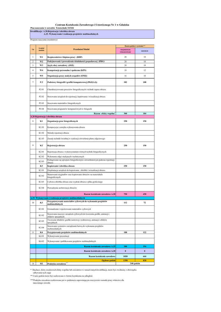 Centrum Kształcenia Zawodowego i Ustawicznego Nr 1 w Gdańsku Plan nauczania w zawodzie Fototechnik 343104 Kwalifikacje: A.20.Rejestracja i obróbka obrazu A.25. Wykonywanie i realizacja projektów multimedialnych Program nauczania (modułowy) Razem godzin w systemie/** Lp Symbol modułu 1 W1 2 3 Przedmiot/Moduł stacjonarnym (wieczorowym) zaocznym Bezpieczeństwo i higiena pracy (BHP) 28 18 W2 Podejmowanie i prowadzenie działalności gospodarczej (PDG) 28 18 W3 Język obcy zawodowy (JOZ) 28 18 4 W4 Kompetencje personalne i społeczne (KPS) 18 12 5 W5 Organizacja pracy małych zespołów (OMZ) 16 10 7 P.2 Podstawy fotografii i grafiki komputerowej (PKZ(A.l)) 182 108 300 184 250 150 250 150 250 150 750 450 112 72 188 122 Razem kształcenie zawodowe A.25 300 194 Razem kształcenie zawodowe A.20 0 0 Razem kształcenie zawodowe 1050 644 Ogółem godzin 1350 P2.01 Charakteryzowanie procesów fotograficznych i technik zapisu obrazu. P2.02 Stosowanie urządzeń do rejestracji, kopiowania i wizualizacji obrazu P2.03 Stosowanie materiałów fotograficznych P2.04 Stosowanie programów komputerowych w fotografii Razem efekty wspólne* A.20 Rejestracja i obróbka obrazu 8 9 K1 Organizacja prac fotograficznych K1.01 Kompozycja i estetyka wykonywania obrazu K1.02 Metody rejestracji obrazu K1.03 Zasady techniki świetlnej w realizacji oświetlenia planu zdjęciowego K2 Rejestracja obrazu K2.01 Rejestracja obrazu z wykorzystaniem różnych technik fotograficznych K2.02 Wykonanie zdjęć studyjnych i technicznych K2.03 Posługiwanie się sprzętem fotograficznym i oświetleniowym podczas rejestracji obrazu K3 Kopiowanie i obróbka obrazu K3.01 Eksploatacja urządzeń do kopiowania , obróbki i wizualizacji obrazu K3.02 Skanowanie oryginałów oraz kopiowanie obrazów na materiałach fotograficznych. K3.03 Cyfrowa obróbka obrazu oraz wydruk obrazu z pliku graficznego K3.04 Prowadzenie archiwizacji obrazów Razem kształcenie zawodowe A.20 A.25. Wykonywanie i realizacja projektów multimedialnych 10 K3 K3.01 K3.02 K3.03 K3.04 11 14 K4 Przygotowywanie materiałów cyfrowych do wykonania projektów multimedialnych Gromadzenie i rejestrowanie materiałów cyfrowych Stosowanie maszyn i urządzeń cyfrowych do tworzenia grafiki, animacji i efektów specjalnych Tworzenie obiektów grafiki rastrowej i wektorowej, animacji i efektów specjalnych Stosowanie systemów zarządzania barwą do wykonania projektów multimedialnych Przygotowanie projektów multimedialnych K4.01 Wykonywanie prezentacji K4.02 Wykonywanie i publikowanie projektów multimedialnych PZ Praktyka zawodowa*** 828 240 godzin * Słuchacz, który zrealizował efekty wspólne lub zawodowe w ramach innych kwalifikacji, może być zwolniony z obowiązku odbywania tych zajęć ** Część godzin może być realizowana w formie kształcenia na odległość. ***Praktyka zawodowa realizowana jest w podmiocie zapewniającym rzeczywiste warunki pracy właściwe dla nauczanego zawodu