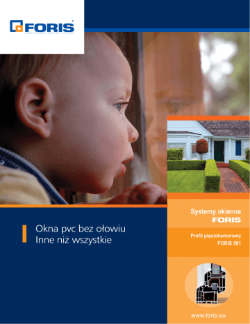 Systemy okienne Profil pięciokomorowy FORIS 501 Niemieckie systemy okienne FORIS 501 FORIS 501 - profil pięciokomorowy Klamka okienna FORIS Listwa przyszybowa FORIS RAMA OKIENNA WYSOKOSĆ RAMY 66 mm SZEROKOSĆ RAMY 72 mm SCIANKA ZEWNETRZNA SKRZYDŁO OKIENNE SZYBA ZESPOLONA WZMOCNIENIE STALOWE SCIANKA WEWNETRZNA SKOSNY WRAB RAMY LISTWA PRZYSZYBOWA USZCZELKA PRZYSZYBOWA USZCZELKA ODBOJOWA Jest to prawdziwie pieciokomorowy system. Bez wzgledu na miejsce, w którym dokonamy przekroju poziomego zawsze bedzie tam wystepować pieć komór. Głebokosć zabudowy systemu FORIS 501 wynosi 72 mm, co przy bardzo dobrze zaprojektowanym układzie komór wewnetrznych i optymalnym doborze grubosci scianek profili pozwala na osiagniecie doskonałych parametrów izolacyjnych. Wyniki badan przeprowadzonych w renomowanych laboratoriach potwierdzaja osiagniecie współczynnika izolacji termicznej profili okiennych Uf = 1,3 [W/(m2 x K)]. Równiez parametry izolacji akustycznej osiagaja doskonałe wartosci. Współczynnik tłumienia RW przy zastosowaniu standardowego pakietu szkła wynosi 34 dB. FORIS 501 to nie tylko parametry techniczne, również niepowtarzalna estetyka okien wykonanych z tych profili spełnia wymagania nowoczesnego wzornictwa. Charakterystyczny kształt profili okiennych doskonale sprawdza sie w kazdym rodzaju budownictwa. Niepowtarzalny i elegancki kształt okien sprawia, ze dom nabiera indywidualnego oblicza, a wnetrze staje sie wyjatkowe. Szczególnie atrakcyjnie prezentuja sie okna FORIS 501 w szerokiej gamie kolorystycznej. Okna pvc FORIS pozbawione saą toksycznych pierwiastków ołowiu i kadmu. Gwarantuja ochrone zdrowia ludzkiego i srodowiska naturalnego dzieki zastosowaniu technologii wapniowo-cynkowej. Potwierdza to Atest Higieniczny Panstwowego Zakładu Higieny. Okna pvc FORIS spełniaja normy Unii Europejskiej okreslone przez ekspertów w dyrektywie 67/588/EWG. Mieszkaj zdrowo Brak ołowiu pierwiastka wyjatkowo szkodliwego dla zdrowia, szczególnie ujemnie wpływajacego na rozwój dzieci. Ołów to kopalnie, huty, zakłady chemiczne, przetwórstwo i recykling - emisja oparów, dymów, odpady poprodukcyjne, scieki, kwasne deszcze. Równiez podczas procesu utylizacji, w spalarniach odpadów i w miejscach ich składowania moga powstać trujace substancje grozne dla naszego zdrowia i zycia. Stabilizacja wapniowo-cynkowa wykorzystywana do produkcji profili pvc FORIS jako jedyna wymieniona jest w Zielonej Ksiedze pvc. Bezołowiowe okna pvc FORIS przeznaczone sa dla budownictwa jednorodzinnego i wielorodzinnego, słuzby zdrowia, uzytecznosci publicznej i obiektów oswiatowo-wychowawczych. Energooszczędność Stolarka wykonana przy zastosowaniu wielokomorowych profili okiennych i drzwiowych rodziny FORIS gwarantuje znakomita izolacje termiczna. Zima skutecznie zatrzyma ciepło w domu, a latem ochroni wnetrze przed nadmiernym nagrzewaniem i zatrzyma w domu przyjemny chłód. Doskonała izolacja termiczna stolarki pvc FORIS przekłada sie na znaczne zredukowanie kosztów ogrzewania w okresie zimy i klimatyzacji pomieszczen w okresie upałów. Poprzez wymiane starych okien straty ciepła ulegna zmniejszeniu od 20 do 30 %, co przekłada sie na oszczednosci kilkuset złotych dla sredniej wielkosci mieszkania w sezonie grzewczym. Dyrektywa Unii Europejskiej Nr 2002/91/EC z 16.12.2002 w sprawie charakterystyki energetycznej budynków nakładajaca obowiazek uzyskiwania swiadectw energetycznych dla budynków nowo wznoszonych i juz istniejacych podkresla jak duza wage przykłada sie obecnie do izolacji termicznej wszystkich elementów budynku w tym stolarki okiennej. Projektujac okna i drzwi pvc FORIS jest mozliwe w pełni wykorzystanie mozliwosci konstrukcyjnych systemu bez najmniejszych obaw o izolacje termiczna tych elementów. Kolorowy zawrót głowy! Indywidualność w domu Kolorowe pomysły na własny dom Garbalinski Polska Sp z o.o. ul. Ostrowska 388 61-312 Poznan tel. +48 61 87 44 100 fax +48 61 87 44 299 e-mail: [email protected] Garbalinski GmbH Dresdner Str. 55 33330 Gütersloh tel. +49 5241 3304 0 fax +49 5241 3304 49 e-mail: [email protected] Okna FORIS inspiruja szerokimi mozliwosciami konstrukcyjnymi, nowoczesnym wzornictwem i bogata kolorystyka. Mozesz wybrać dowolny kształt i kolor, zgodnie z indywidualnym wyobrazeniem o Twoim domu. Kolorystyka okien FORIS jest bardzo urozmaicona, a wybór prawie nieograniczony dzieki mozliwosciom, jakie stwarza najnowsza technologia w zakresie okleinowania profili pvc. Okna FORIS moga być wykonane w wersji jedno - lub dwustronnie kolorowej. Szczególnie ciekawa jest propozycja wykonania okna w wersji jednokolorowej od strony wewnetrznej, umozliwiajaca indywidualne projektowanie kazdego pomieszczenia w domu. Okna FORIS wykonywane w dwustronnej wersji barw drewnopodobnych standardowo realizowane sa na brazowym korpusie, co doskonale podnosi walory estetyczne stolarki. Okna FORIS dostepne sa w 14 kolorach standardowych i szerokim wachlarzu kolorów uzupełniajacych. FORIS-PROS07