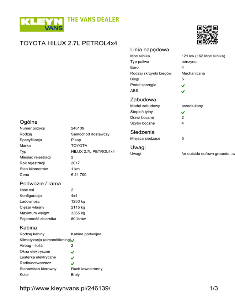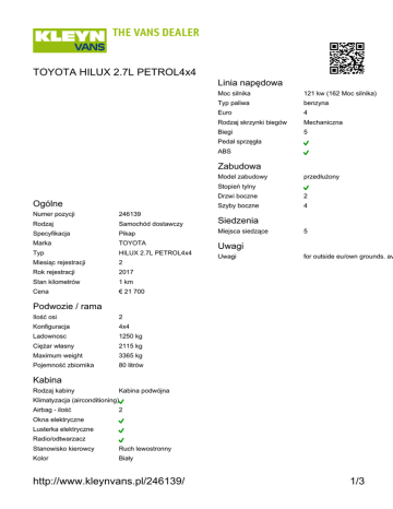 http://www.kleynvans.pl/246139/ 1/3 TOYOTA HILUX 2.7L PETROL4x4
