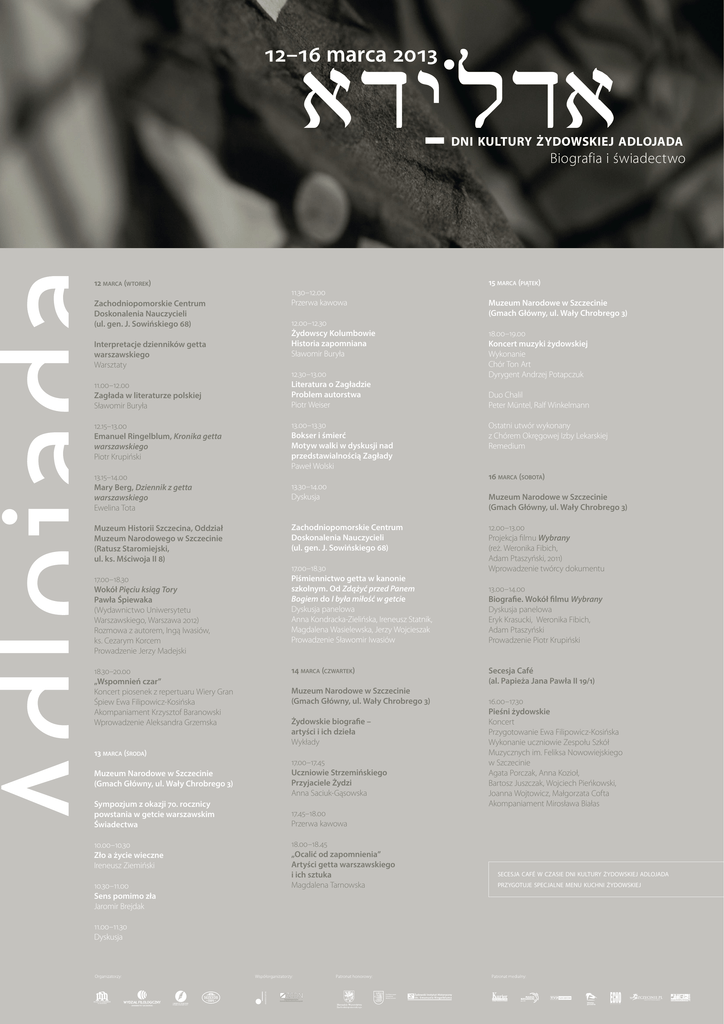 12–16 marca 2013 dni kultury żydowskiej adlojada Biografia i świadectwo 12 marca (wtorek) Zachodniopomorskie Centrum Doskonalenia Nauczycieli (ul. gen. J. Sowińskiego 68) Interpretacje dzienników getta warszawskiego Warsztaty 11.00–12.00 Zagłada w literaturze polskiej Sławomir Buryła 12.15–13.00 Emanuel Ringelblum, Kronika getta warszawskiego Piotr Krupiński 13.15–14.00 Mary Berg, Dziennik z getta warszawskiego Ewelina Tota Muzeum Historii Szczecina, Oddział Muzeum Narodowego w Szczecinie (Ratusz Staromiejski, ul. ks. Mściwoja II 8) 17.00–18.30 Wokół Pięciu ksiąg Tory Pawła Śpiewaka (Wydawnictwo Uniwersytetu Warszawskiego, Warszawa 2012) Rozmowa z autorem, Ingą Iwasiów, ks. Cezarym Korcem Prowadzenie Jerzy Madejski 18.30–20.00 „Wspomnień czar” Koncert piosenek z repertuaru Wiery Gran Śpiew Ewa Filipowicz-Kosińska Akompaniament Krzysztof Baranowski Wprowadzenie Aleksandra Grzemska 13 marca (środa) Muzeum Narodowe w Szczecinie (Gmach Główny, ul. Wały Chrobrego 3) Sympozjum z okazji 70. rocznicy powstania w getcie warszawskim Świadectwa 10.00–10.30 Zło a życie wieczne Ireneusz Ziemiński 10.30–11.00 Sens pomimo zła Jaromir Brejdak 15 marca (piątek) 11.30–12.00 Przerwa kawowa Muzeum Narodowe w Szczecinie (Gmach Główny, ul. Wały Chrobrego 3) 12.00–12.30 Żydowscy Kolumbowie Historia zapomniana Sławomir Buryła 18.00–19.00 Koncert muzyki żydowskiej Wykonanie Chór Ton Art Dyrygent Andrzej Potapczuk 12.30–13.00 Literatura o Zagładzie Problem autorstwa Piotr Weiser Duo Chalil Peter Müntel, Ralf Winkelmann 13.00–13.30 Bokser i śmierć Motyw walki w dyskusji nad przedstawialnością Zagłady Paweł Wolski Ostatni utwór wykonany z Chórem Okręgowej Izby Lekarskiej Remedium 16 marca (sobota) 13.30–14.00 Dyskusja Muzeum Narodowe w Szczecinie (Gmach Główny, ul. Wały Chrobrego 3) Zachodniopomorskie Centrum Doskonalenia Nauczycieli (ul. gen. J. Sowińskiego 68) 17.00–18.30 Piśmiennictwo getta w kanonie szkolnym. Od Zdążyć przed Panem Bogiem do I była miłość w getcie Dyskusja panelowa Anna Kondracka-Zielińska, Ireneusz Statnik, Magdalena Wasielewska, Jerzy Wojcieszak Prowadzenie Sławomir Iwasiów 14 marca (czwartek) Muzeum Narodowe w Szczecinie (Gmach Główny, ul. Wały Chrobrego 3) Żydowskie biografie – artyści i ich dzieła Wykłady 17.00–17.45 Uczniowie Strzemińskiego Przyjaciele Żydzi Anna Saciuk-Gąsowska 17.45–18.00 Przerwa kawowa 18.00–18.45 „Ocalić od zapomnienia” Artyści getta warszawskiego i ich sztuka Magdalena Tarnowska 12.00–13.00 Projekcja filmu Wybrany (reż. Weronika Fibich, Adam Ptaszyński, 2011) Wprowadzenie twórcy dokumentu 13.00–14.00 Biografie. Wokół filmu Wybrany Dyskusja panelowa Eryk Krasucki, Weronika Fibich, Adam Ptaszyński Prowadzenie Piotr Krupiński Secesja Café (al. Papieża Jana Pawła II 19/1) 16.00–17.30 Pieśni żydowskie Koncert Przygotowanie Ewa Filipowicz-Kosińska Wykonanie uczniowie Zespołu Szkół Muzycznych im. Feliksa Nowowiejskiego w Szczecinie Agata Porczak, Anna Kozioł, Bartosz Juszczak, Wojciech Pieńkowski, Joanna Wojtowicz, Małgorzata Cofta Akompaniament Mirosława Białas secesja café w czasie dni kultury żydowskiej adlojada przygotuje specjalne menu kuchni żydowskiej 11.00–11.30 Dyskusja ydowski Instytut Historyczny im. Emanuela Ringelbluma