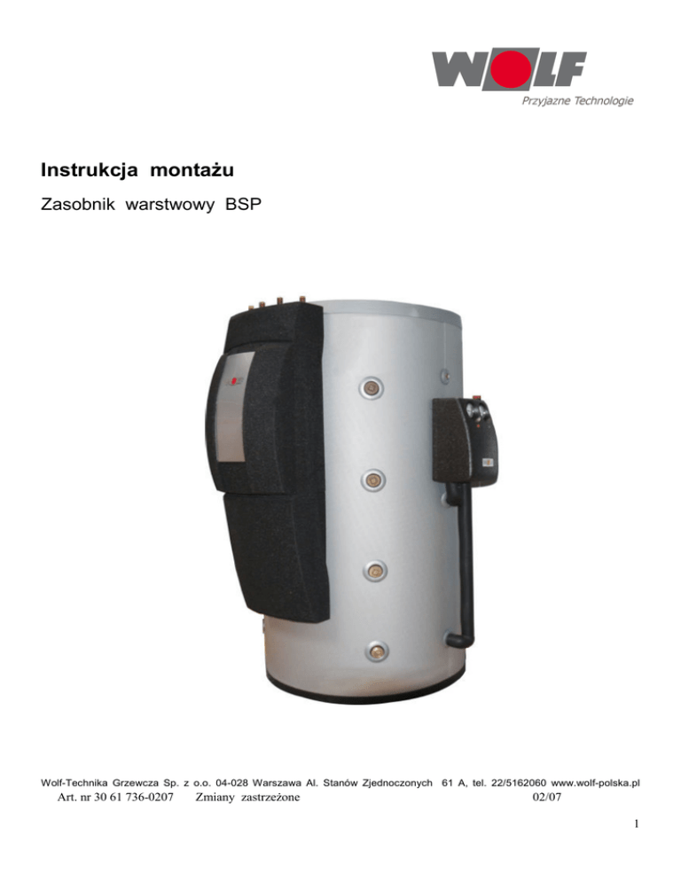 Instrukcja montaŜu Zasobnik warstwowy BSP Wolf-Technika Grzewcza Sp. z o.o. 04-028 Warszawa Al. Stanów Zjednoczonych 61 A, tel. 22/5162060 www.wolf-polska.pl Art. nr 30 61 736-0207 Zmiany zastrzeŜone 02/07 1 Zasobnik warstwowy BSP 800 / 100 Wytyczne bezpieczeństwa Przed uruchomieniem urządzenia prosimy o staranne przeczytanie poniŜszych wytycznych do montaŜu i uruchomienia. W ten sposób zmniejszy się ryzyko uszkodzeń wynikłych z nieodpowiedniego postępowania. Niewłaściwe postępowanie jak równieŜ niedopuszczalne zmiany przy montaŜu i w konstrukcji prowadzą do wykluczenia gwarancji .Obok specyficznych lokalnych wytycznych i przepisów naleŜy szczególnie przestrzegać następujących uregulowań technicznych: DIN 1988 Reguły techniczne dla instalacji wody pitnej. DIN 4751 Wodne instalacje grzewcze DIN 4757 Solarne instalacje grzewcze DIN18380 Instalacje grzewcze i podgrzewania ciepłej wody DIN 18381 Roboty na instalacjach gazu, wody i kanalizacji Zamieszczone fotografie są fotografiami symbolicznymi. Z powodu moŜliwych błędów składu i druku, ale równieŜ z powodu konieczności wprowadzania bieŜących zmian technicznych, prosimy o wyrozumiałość, Ŝe nie moŜemy wziąć odpowiedzialności za ich aktualność. RównieŜ waŜność Ogólnych Warunków Handlowych dotyczy aktualnego wydania. MontaŜ Ustawienie i montaŜ musi być wykonana przez firmę z odpowiednimi kwalifikacjami. W razie potrzeby zdjąć fabrycznie zmontowaną izolację w celu zmniejszenia wymiarów podczas transportu. Wymiennik moŜe być zamontowany tylko w pomieszczeniu zabezpieczonym przed mrozem. Podane na tabliczce znamionowej wartości ciśnień nie mogą być przekroczone. 2 Zasobnik warstwowy BSP 800 / 100 Izolacja Kolejność montaŜu izolacji z płaszczem z polistyrolu: 1. Uszczelnienia z miękkiej pianki przełoŜyć przez mufy ewentualnie nałoŜyć na zasobnik. 2. Połówki łupin izolacyjnych nałoŜyć na zasobnik i płaską taśmą ściągnąć lekko w środku izolacji. 3. Na połówki łupin nałoŜyć kopułę izolacyjną. 4. Zamocowaną na środku płaską taśmę przesunąć do podłogi i ostatecznie dociągnąć. OstroŜnie : zbyt silne dociągnięcie uszkodzi elementy z tworzywa sztucznego. 5. NałoŜyć rozety. NaleŜy zwracać uwagę , aby elementy izolacji przylegały szczelnie do zasobnika, co zapewni minimalne straty ciepła. Uruchomienie Napełnianie i uruchomienie musi być wykonane przez firmę z odpowiednimi kwalifikacjami. Teraz naleŜy sprawdzić funkcjonowanie i szczelność całej instalacji , łącznie z częściami montowanymi w fabryce. NaleŜy okresowo sprawdzać funkcjonowanie zabezpieczeń i działanie zaworów bezpieczeństwa. Zalecamy wykonywanie corocznych przeglądów przez wyspecjalizowaną firmę. Nie podgrzewać zasobnika ponad 95oC. Dane techniczne BSP Typ Pojemność zasobnika Wysokość całkowita bez izolacji Wysokość całkowita z izolacją Średnica zewnętrzna bez izolacji Średnica zewnętrzna z izolacją Wymiar montaŜowy bez izolacji Max ciśnienie pracy zbiornika Max ciśnienie pracy wymiennika ciepła Max temperatura pracy zbiornika CięŜar Powierzchnia wymiennika ciepła solarna Pojemność wymiennika ciepła BSP-800 785 l 1725 mm 1810 mm 796 mm 960 mm 1780 mm 3 bar 10 bar 95⁰ C. 155 kg 2,5 m2 16,5 l BSP-1000 915 l 2010 mm 2090 mm 796 mm 960 mm 2050 mm 3 bar 10 bar 95⁰ C. 175 kg 3 m2 19,8 l 3 Przyłącza Przyłącze BSP- FW 2 * G1” (płaskie uszcz.) Odpowietrznik 8 * Rp 1/2” (IG) 8 * Rp 1/2” (IG) Czujnik ciepłej wody Mocowanie grupy solarnej (M8) Mocowanie BSP – FW (M8) Czujnik ogrzewania Mocowanie obiegu grzewczego BSP – HK (M8) Czujnik solarny Przyłącze grupy solarnej 2 x G1 Przyłącze BSP – HK niskotemperaturowe (ogrzewanie podłogowe) 2 * G1” (płaskie uszcz.) Przyłącze BSP – HK wysokotemperaturowe (obieg grzewczy) 2 * G1” (płaskie uszcz.) Przekrój BSP 4