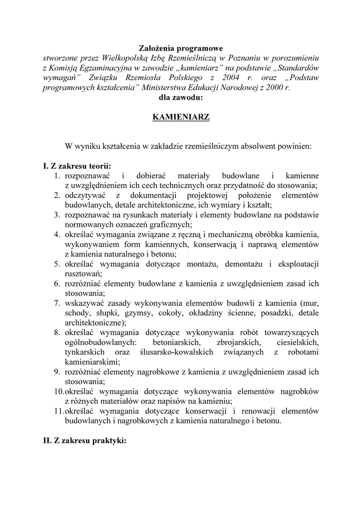 Założenia programowe stworzone przez Wielkopolską Izbę Rzemieślniczą w Poznaniu w porozumieniu z K omisj ą E g zaminacy j na w zawod zie „ kamieniarz” na pod stawie „ S tand ard ó w wy mag ań ” Z wiązku Rzemiosł a Polskieg o z 2 0 0 4 r. oraz „ Pod staw prog ramowy ch kształ cenia” M inisterstwa E d ukacj i N arod owej z 2 0 0 0 r. d l a z awod u : K A M IE N IA R Z W w y n ik u k s z ta łc e n ia w z a k ła d z ie rz e m ie ś ln ic z y m a b s o lw e n t p o w in ie n : I . Z z ak res u t eorii: 1 . ro z p o z n a w a ć i d o b ie ra ć m a te ria ły b u d o w la n e i k a m ie n n e z u w z g lę d n ie n ie m ic h c e c h te c h n ic z n y c h o ra z p rz y d a tn o ś ć d o s to s o w a n ia ; 2 . o d c z y ty w a ć z d o k u m e n ta c ji p ro je k to w e j p o ło ż e n ie e le m e n tó w b u d o w la n y c h , d e ta le a rc h ite k to n ic z n e , ic h w y m ia ry i k s z ta łt; 3 . ro z p o z n a w a ć n a ry s u n k a c h m a te ria ły i e le m e n ty b u d o w la n e n a p o d s ta w ie n o rm o w a n y c h o z n a c z e ń g ra fic z n y c h ; 4 . o k re ś la ć w y m a g a n ia z w ią z a n e z rę c z n ą i m e c h a n ic z n ą o b ró b k a k a m ie n ia , w y k o n y w a n ie m fo rm k a m ie n n y c h , k o n s e rw a c ją i n a p ra w ą e le m e n tó w z k a m ie n ia n a tu ra ln e g o i b e to n u ; 5 . o k re ś la ć w y m a g a n ia d o ty c z ą c e m o n ta ż u , d e m o n ta ż u i e k s p lo a ta c ji ru s z to w a ń ; 6 . ro z ró ż n ia ć e le m e n ty b u d o w la n e z k a m ie n ia z u w z g lę d n ie n ie m z a s a d ic h s to s o w a n ia ; 7 . w s k a z y w a ć z a s a d y w y k o n y w a n ia e le m e n tó w b u d o w li z k a m ie n ia (m u r, s c h o d y , s łu p k i, g z y m s y , c o k o ły , o k ła d z in y ś c ie n n e , p o s a d z k i, d e ta le a rc h ite k to n ic z n e ); 8 . o k re ś la ć w y m a g a n ia d o ty c z ą c e w y k o n y w a n ia ro b ó t to w a rz y s z ą c y c h o g ó ln o b u d o w la n y c h : b e to n ia rs k ic h , z b ro ja rs k ic h , c ie s ie ls k ic h , ty n k a rs k ic h o ra z ś l u s a r s k o -k o w a l s k i c h z w ią z a n y c h z ro b o ta m i k a m ie n ia rs k im i; 9 . ro z ró ż n ia ć e le m e n ty n a g ro b k o w e z k a m ie n ia z u w z g lę d n ie n ie m z a s a d ic h s to s o w a n ia ; 1 0 .o k re ś la ć w y m a g a n ia d o ty c z ą c e w y k o n y w a n ia e le m e n tó w n a g ro b k ó w z ró ż n y c h m a te ria łó w o ra z n a p is ó w n a k a m ie n iu ; 1 1 .o k re ś la ć w y m a g a n ia d o ty c z ą c e k o n s e rw a c ji i re n o w a c ji e le m e n tó w b u d o w la n y c h i n a g ro b k o w y c h z k a m ie n ia n a tu ra ln e g o i b e to n u . I I . Z z ak res u prak t y k i: 1 . o rg a n iz o w a ć i u ż y tk o w a ć s ta n o w is k o p ra c y d la ro b ó t k a m ie n ia rs k ic i p o m o c n ic z y c h , z g o d n ie z z a s a d a m i o rg a n iz a c ji p ra c y o ra z w y m o g a m te c h n o lo g ic z n y m i; 2 . s p o rz ą d z a ć p ro s te ry s u n k i i s z k ic e ro b o c z e ; 3 . w y k o n y w a ć p rz e d m ia ry , p o m ia ry in w e n ta ry z a c y jn e o ra z o b m ia ry ro b ó t; 4 . z a m a w ia ć i ro z lic z a ć m a te ria ły p o trz e b n e d o w y k o n a n ia z a d a n ia ; 5 . o b lic z a ć ilo ś ć p o s z c z e g ó ln y c h s k ła d n ik ó w z a p ra w y lu b b e to n u n p o d s ta w ie re c e p tu ry ; 6 . w s k a z y w a ć m a te ria ły , n a rz ę d z ia i s p rz ę t o ra z p rz y rz ą d y p o m ia ro w e d w y k o n y w a n ia p ra c k a m ie n ia rs k ic h b u d o w la n y c h i n a g ro b k o w y c h ; 7 . p rz y g o to w y w a ć o ra z k o n s e rw o w a ć n a rz ę d z ia d o ro b ó t k a m ie n ia rs k ic h ; 8 . p o s łu g iw a ć s ię n a rz ę d z ia m i rę c z n y m i, e le k tro n a rz ę d z ia m i i m a s z y n a m b u d o w la n y m i s to s o w a n y m i p rz y w y k o n a n iu ro b ó t, n ie w y m a g a ją c y m d o d a tk o w y c h u p ra w n ie ń ; 9 . p rz e n o s ić p u n k ty z m o d e lu n a k a m ie ń ; 1 0 .ro z w a rs tw ia ć b lo k i s k a ln e n a fo rm a ty b u d o w la n e (k lin o w a n ie , c ie c ie ); 1 1 .o b ra b ia ć rę c z n ie i m e c h a n ic z n ie p o w ie rz c h n ie k a m ie n ia n a tu ra ln e g i b e to n u (s z lifo w a n ie , p o le ro w a n ie ); 1 2 .w ie rc ić o tw o ry w k a m ie n iu ; 1 3 .o s a d z a ć e le m e n ty k a m ie n n e i b e to n o w e ; 1 4 .w y k o n y w a ć ró ż n e fo rm y k a m ie n n e ; 1 5 .k a lk u lo w a ć k o s z ty o ra z o b lic z a ć n a le ż n o ś ć z a w y k o n a n ą p ra c ę ; 1 6 .o c e n ia ć p o p ra w n o ś ć w y k o n a n e j p rz e z s ie b ie p ra c y . I I I . P onad t o: 1 . s to s o w a ć z a sa d y b e z p ie c z e ń s tw a i h ig ie n y p rz e c iw p o ż a ro w e j, p rz e c iw p o ra ż e n io w e i o c h ro n y e k s p lo a ta c ji, p o m ia ra c h , m o n ta ż u , n a p ra w ie o ra z k o n m a s z y n i u rz ą d z e ń e le k try c z n y c h ; 2 . s p ra w n ie k o m u n ik o w a ć s ię , 3 . w y s z u k iw a ć i p rz e tw a rz a ć in fo rm a c ję ; 4 . k o rz y s ta ć z lite ra tu ry o ra z in n y c h ź ró d e ł w ie d z y fa c h o a k tu a liz o w a n ia s w o je j w ie d z y o ra z u m ie ję tn o ś c i; 5 . k o rz y s ta ć z e ź ró d e ł w ie d z y e k o n o m ic z n e j i p ra w n e j; 6 . z n a ć p o d s ta w o w e w ia d o m o ś c i z z a k re s u p ra w g o s p o d a rc z e g o i z a rz ą d z a n ia p rz e d s ię b io rs tw e m o d z ia ła ln o ś c i g o s p o d a rc z e j; 7 . z n a ć m o ż liw o ś c i p o d n o s z e n ia s w o ic h k w a lifik a c ji z a w o h i a o i i o p ra c y , o c h ro n y ś ro d o w is k a p rz y s e rw a c ji in s ta la c ji, w e j w c e lu s ta łe g o a p ra c y , p ra w a ra z d o k u m e n ta c ji d o w y c h .