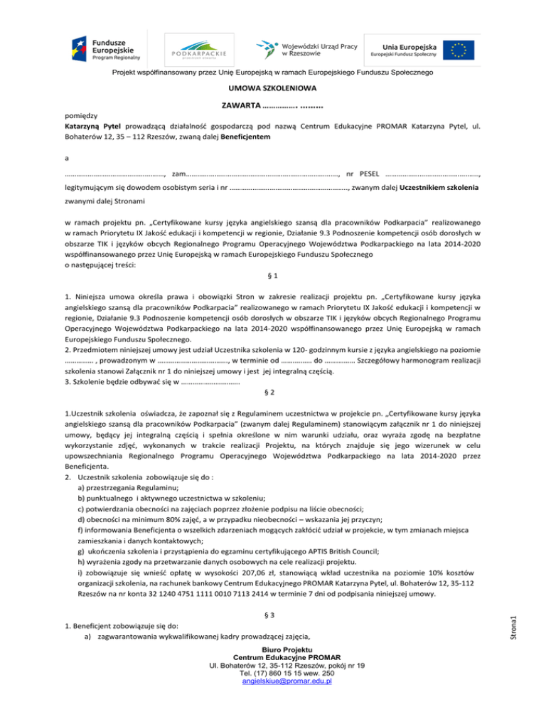 Projekt współfinansowany przez Unię Europejską w ramach Europejskiego Funduszu Społecznego UMOWA SZKOLENIOWA ZAWARTA ……………. ……… pomiędzy Katarzyną Pytel prowadzącą działalność gospodarczą pod nazwą Centrum Edukacyjne PROMAR Katarzyna Pytel, ul. Bohaterów 12, 35 – 112 Rzeszów, zwaną dalej Beneficjentem a ………………………………………….…, zam…………………………………………………….………………., nr PESEL …………………………………….……, legitymującym się dowodem osobistym seria i nr …………………………………………………….., zwanym dalej Uczestnikiem szkolenia zwanymi dalej Stronami w ramach projektu pn. „Certyfikowane kursy języka angielskiego szansą dla pracowników Podkarpacia” realizowanego w ramach Priorytetu IX Jakość edukacji i kompetencji w regionie, Działanie 9.3 Podnoszenie kompetencji osób dorosłych w obszarze TIK i języków obcych Regionalnego Programu Operacyjnego Województwa Podkarpackiego na lata 2014-2020 współfinansowanego przez Unię Europejską w ramach Europejskiego Funduszu Społecznego o następującej treści: §1 1. Niniejsza umowa określa prawa i obowiązki Stron w zakresie realizacji projektu pn. „Certyfikowane kursy języka angielskiego szansą dla pracowników Podkarpacia” realizowanego w ramach Priorytetu IX Jakość edukacji i kompetencji w regionie, Działanie 9.3 Podnoszenie kompetencji osób dorosłych w obszarze TIK i języków obcych Regionalnego Programu Operacyjnego Województwa Podkarpackiego na lata 2014-2020 współfinansowanego przez Unię Europejską w ramach Europejskiego Funduszu Społecznego. 2. Przedmiotem niniejszej umowy jest udział Uczestnika szkolenia w 120- godzinnym kursie z języka angielskiego na poziomie …………… , prowadzonym w ………………………………., w terminie od …….……… do …….……… Szczegółowy harmonogram realizacji szkolenia stanowi Załącznik nr 1 do niniejszej umowy i jest jej integralną częścią. 3. Szkolenie będzie odbywać się w …………………………. §2 §3 1. Beneficjent zobowiązuje się do: a) zagwarantowania wykwalifikowanej kadry prowadzącej zajęcia, Biuro Projektu Centrum Edukacyjne PROMAR Ul. Bohaterów 12, 35-112 Rzeszów, pokój nr 19 Tel. (17) 860 15 15 wew. 250 [email protected] Strona1 1.Uczestnik szkolenia oświadcza, że zapoznał się z Regulaminem uczestnictwa w projekcie pn. „Certyfikowane kursy języka angielskiego szansą dla pracowników Podkarpacia” (zwanym dalej Regulaminem) stanowiącym załącznik nr 1 do niniejszej umowy, będący jej integralną częścią i spełnia określone w nim warunki udziału, oraz wyraża zgodę na bezpłatne wykorzystanie zdjęć, wykonanych w trakcie realizacji Projektu, na których znajduje się jego wizerunek w celu upowszechniania Regionalnego Programu Operacyjnego Województwa Podkarpackiego na lata 2014-2020 przez Beneficjenta. 2. Uczestnik szkolenia zobowiązuje się do : a) przestrzegania Regulaminu; b) punktualnego i aktywnego uczestnictwa w szkoleniu; c) potwierdzania obecności na zajęciach poprzez złożenie podpisu na liście obecności; d) obecności na minimum 80% zajęć, a w przypadku nieobecności – wskazania jej przyczyn; f) informowania Beneficjenta o wszelkich zdarzeniach mogących zakłócić udział w projekcie, w tym zmianach miejsca zamieszkania i danych kontaktowych; g) ukończenia szkolenia i przystąpienia do egzaminu certyfikującego APTIS British Council; h) wyrażenia zgody na przetwarzanie danych osobowych na cele realizacji projektu. i) zobowiązuje się wnieść opłatę w wysokości 207,06 zł, stanowiącą wkład uczestnika na poziomie 10% kosztów organizacji szkolenia, na rachunek bankowy Centrum Edukacyjnego PROMAR Katarzyna Pytel, ul. Bohaterów 12, 35-112 Rzeszów na nr konta 32 1240 4751 1111 0010 7113 2414 w terminie 7 dni od podpisania niniejszej umowy. Projekt współfinansowany przez Unię Europejską w ramach Europejskiego Funduszu Społecznego b) c) d) e) f) zagwarantowania bezpłatnych materiałów szkoleniowych, tj. podręcznika i ćwiczeń informowania drogą telefoniczną i/lub emailową o zmianach harmonogramu realizacji szkolenia. przeprowadzenia egzaminu certyfikującego APTIS British Conuncil; wydania zaświadczenia o ukończeniu szkolenia; sprawowania nadzoru prawnego i organizacyjnego nad prowadzonymi szkoleniami. §4 1. W przypadku naruszenia przez Uczestnika szkolenia postanowień niniejszej umowy i/lub Regulaminu, w szczególności: nieukończenia przez Uczestnika projektu szkolenia lub nieprzystąpienia do egzaminu Certyfikującego APTIS British Council Beneficjent może rozwiązać niniejszą umowę w trybie natychmiastowym. 2. W przypadku rozwiązania Umowy z przyczyn wskazanych ust. 1 przez Beneficjenta, Uczestnik szkolenia zobowiązany będzie do zwrotu na rzecz Beneficjenta poniesionych kosztów w wysokości 100%, związanych z udziałem Uczestnika w projekcie oraz do zwrotu materiałów szkoleniowych, które otrzymał, w terminie 14 dni od otrzymaniu pisemnego wezwania przesłanego listem poleconym na wskazany w umowie adres. Koszty będą zwracane na wskazany w piśmie numer rachunku bankowego. 3. Realizator może odstąpić od żądania zwrotu kosztów, o których mowa w ust. 2, w przypadku zaistnienia nadzwyczajnych i niezawinionych przyczyn losowych i życiowych, z powodu których Uczestnik szkolenia nie jest w stanie kontynuować udziału w projekcie. 4. Za nadzwyczajne i niezawinione przyczyny losowe i życiowe uniemożliwiające kontynuację uczestnictwa w projekcie przyjmuje się w szczególności: chorobę Uczestnika szkolenia, której charakter uniemożliwia osobiste stawiennictwo na zajęciach lub chorobę dziecka Uczestnika powodującą przekroczenie liczby dopuszczalnych nieobecności. Uczestnik zobowiązany jest do przedstawienia wiarygodnych dokumentów potwierdzających wystąpienie t