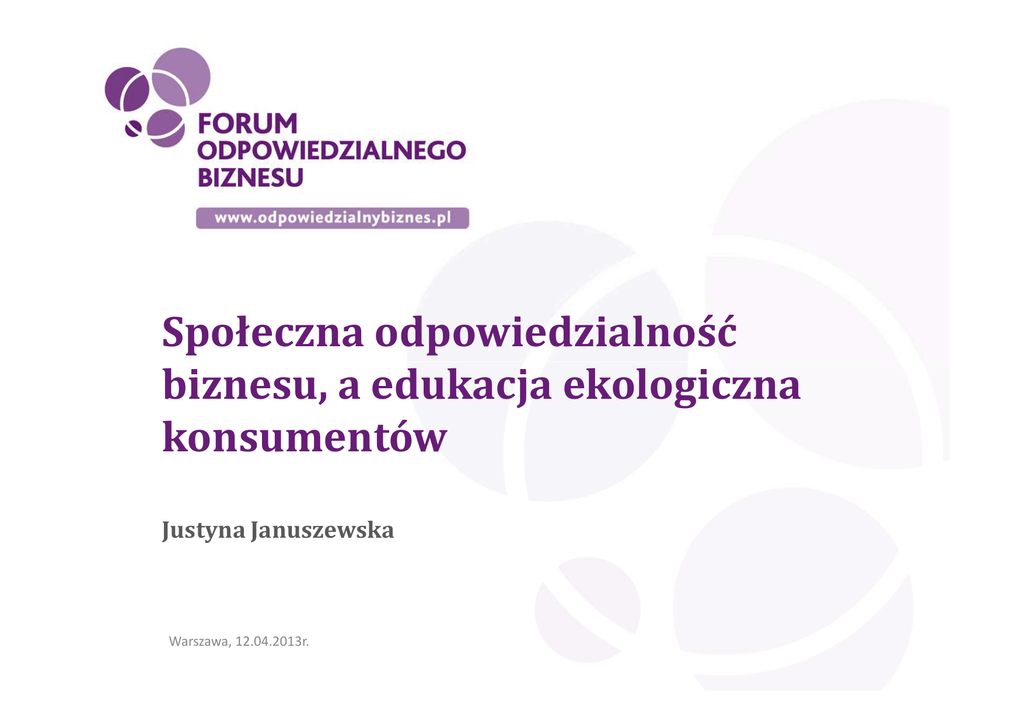 Społeczna odpowiedzialność biznesu, a edukacja ekologiczna konsumentów Justyna Januszewska Warszawa, 12.04.2013r. Edukacja konsumentów elementem społecznej odpowiedzialności wg ISO 26 000 „Edukacja konsumencka, w tym edukacja na temat skutków środowiskowych, społecznych i ekonomicznych wyborów konsumenckich, umożliwia konsumentom podejmowanie świadomych, niezależnych decyzji dot. wyboru produktów i usług ze świadomością swoich praw i obowiązków oraz związanych z nimi działań” ISO 26 000 Prawa człowieka Zaangażowa nie i rozwój lokalnej społeczności Praktyki z zakresu pracy Ład organizacyjny Zagadnienia konsumenckie Środowisko naturalne Uczciwe praktyki rynkowe Zielony konsumeryzm w USA 77% konsumentów wierzy w to, że kupowanie eko-produktów to sposób na etyczne i zgodne z wartościami zakupy (wzrost o 9 punktów procentowych w porównaniu z sytuacją w 2009 roku). 68% zbadanych twierdzi, że warto zapłacić więcej za zielony produkt lub usługę, jeżeli oferuje go marka, której ufają (wzrost o 8 punktów procentowych). Konsumenci uważają, że również firmy powinny być odpowiedzialne za swoje działania. Dziewięć na dziesięciu zbadanych uważa, że firmy mają zobowiązanie do ochrony środowiska, a 77% w lepszy sposób postrzega firmy wspierające ekologiczne działania. Wzrósł również odsetek osób, które zbojkotowały firmę lub produkt z powodu nieodpowiedzialnych ekologicznie działań – 27% zbadanych, co oznacza wzrost o 8 punktów procentowych w stosunku do roku 2009. Badanie Green in the Economy II, grupy medialnej NBC Universal, 2011 Czy polscy konsumenci potrzebują edukacji? Od 2008 do 2011 roku procent Polaków, deklarujących, że unika kupowania produktów szkodliwych dla środowiska wzrósł o 30% (do ponad 70%) Świadomość ekologiczna Polaków analiza wyników badań ilościowych z lat 1992-2011, Instytut na rzecz Ekorozwoju 27% badanych konsumentów z Polski odpowiedziało twierdząco na pytanie, czy przy podejmowaniu decyzji o zakupie biorą pod uwagę, jak zakupiony przez nich produkt wpływa na środowisko. Tablica wyników dla rynków, KE, 2011 r. 39% Polaków wie, jaki wpływ na środowisko mają używane przez nich produkty, a tylko 8% nic nie wie na ten temat. Badanie Eurobarometru z kwietnia 2009 dot. zrównoważonej konsumpcji i produkcji Sondaż Grupy IQS przeprowadzony dla „Pulsu Biznesu” Co mogą zrobić firmy? Diagnoza: Rośnie świadomość ekologiczna i prośrodowiskowe deklaracje, ale sfera realnych działań pozostaje na relatywnie niskim poziomie. Działania edukacyjne firm w ramach społecznej odpowiedzialności mogą sprzyjać zwiększeniu konsumenckich działań prośrodowiskowych. Różnorodność narzędzi: kampanie edukacyjne wykorzystywanie miejsc dystrybucji produktów/realizacji usług eventy i wydarzenia materiały edukacyjne konkursy, testy, projekty angażujące działania online PRZYKŁADOWE INICJATYWY FIRM ProjektGospodarni.pl Unilever w partnerstwie z Fundacją Nasza Ziemia IKEA zrównoważone życie w domu Przyszło świeże w IKEA Targówek Orange Recykling PRZYKŁADOWE INICJATYWY FIRM Kręć kilometry, zaparkuj klimatycznie Fundacja Allegro Ekologia się opłaca Kompania Piwowarska Jedz smacznie i zdrowo Nestlé Kwestie wrażliwe Greenwashing Edukacja konsumentów, a promocja własnych produktów Pomiar skuteczności działań Zapraszamy do zapoznania się z broszurą „Edukowanie konsumentów. Doświadczenia polskiego rynku” Zapraszamy do włączenia się do dyskusji w ramach internetowych Rozmów o odpowiedzialnym biznesie, szczególnie przy wątku „Zagadnienia konsumenckie” Dziękuję za uwagę! Warszawa, 12.04.2013r.