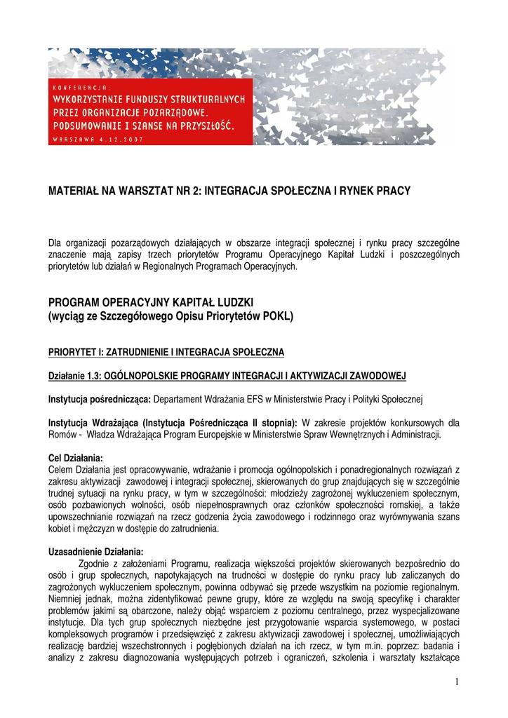 MATERIAŁ NA WARSZTAT NR 2: INTEGRACJA SPOŁECZNA I RYNEK PRACY Dla organizacji pozarządowych działających w obszarze integracji społecznej i rynku pracy szczególne znaczenie mają zapisy trzech priorytetów Programu Operacyjnego Kapitał Ludzki i poszczególnych priorytetów lub działań w Regionalnych Programach Operacyjnych. PROGRAM OPERACYJNY KAPITAŁ LUDZKI (wyciąg ze Szczegółowego Opisu Priorytetów POKL) PRIORYTET I: ZATRUDNIENIE I INTEGRACJA SPOŁECZNA Działanie 1.3: OGÓLNOPOLSKIE PROGRAMY INTEGRACJI I AKTYWIZACJI ZAWODOWEJ Instytucja pośrednicząca: Departament Wdrażania EFS w Ministerstwie Pracy i Polityki Społecznej Instytucja Wdrażająca (Instytucja Pośrednicząca II stopnia): W zakresie projektów konkursowych dla Romów - Władza Wdrażająca Program Europejskie w Ministerstwie Spraw Wewnętrznych i Administracji. Cel Działania: Celem Działania jest opracowywanie, wdrażanie i promocja ogólnopolskich i ponadregionalnych rozwiązań z zakresu aktywizacji zawodowej i integracji społecznej, skierowanych do grup znajdujących się w szczególnie trudnej sytuacji na rynku pracy, w tym w szczególności: młodzieży zagrożonej wykluczeniem społecznym, osób pozbawionych wolności, osób niepełnosprawnych oraz członków społeczności romskiej, a także upowszechnianie rozwiązań na rzecz godzenia życia zawodowego i rodzinnego oraz wyrównywania szans kobiet i mężczyzn w dostępie do zatrudnienia. Uzasadnienie Działania: Zgodnie z założeniami Programu, realizacja większości projektów skierowanych bezpośrednio do osób i grup społecznych, napotykających na trudności w dostępie do rynku pracy lub zaliczanych do zagrożonych wykluczeniem społecznym, powinna odbywać się przede wszystkim na poziomie regionalnym. Niemniej jednak, można zidentyfikować pewne grupy, które ze względu na swoją specyfikę i charakter problemów jakimi są obarczone, należy objąć wsparciem z poziomu centralnego, przez wyspecjalizowane instytucje. Dla tych grup społecznych niezbędne jest przygotowanie wsparcia systemowego, w postaci kompleksowych programów i przedsięwzięć z zakresu aktywizacji zawodowej i społecznej, umożliwiających realizację bardziej wszechstronnych i pogłębionych działań na ich rzecz, w tym m.in. poprzez: badania i analizy z zakresu diagnozowania występujących potrzeb i ograniczeń, szkolenia i warsztaty kształcące 1 umiejętności niezbędne na rynku pracy i niwelujące indywidualne bariery w dostępie do zatrudnienia czy integracji społecznej. Jedną z podstawowych barier utrudniających zwłaszcza kobietom powrót na rynek pracy oraz aktywne uczestnictwo w życiu zawodowym jest obowiązek zapewnienia opieki nad dziećmi. Dlatego też w ramach Działania wspierane będą również inicjatywy sprzyjające godzeniu życia zawodowego i rodzinnego oraz wyrównywaniu szans kobiet i mężczyzn w dostępie do zatrudnienia, m.in. poprzez pilotażową realizację kompleksowych projektów powrotu do pracy po przerwie związanej z urodzeniem i wychowaniem dzieci, a także promocję elastycznych i alternatywnych metod organizacji pracy oraz form zatrudnienia - przy równoczesnym zachowaniu bezpieczeństwa socjalnego pracowników. Realizacja powyższego typu wsparcia pozwoli na włączenie w główny nurt programowania pozytywnych doświadczeń i dobrych praktyk zdobytych w trakcie wdrażania w latach 2004 – 2006 Programu Inicjatywy Wspólnotowej EQUAL, a także na upowszechnianie na poziomie ogólnopolskim rozwiązań na rzecz wyrównywania szans kobiet i mężczyzn w dostępie do zatrudnienia oraz na włączenie perspektywy płci do realizowanych działań (gender mainstreaming). W trybie konkursowym będzie można realizować projekty tylko w poddziałaniu 1.3.1 Projekty na rzecz społeczności romskiej. Typy projektów1: - projekty obejmujące działania z zakresu zatrudnienia, edukacji, integracji społecznej i zdrowia, przyczyniające się do aktywizacji społeczno - zawodowej społeczności romskiej. Grupy docelowe: − członkowie społeczności romskiej − osoby, instytucje i podmioty działające na rzecz społeczności romskiej w Polsce Projektodawcy: wszystkie podmioty Priorytet VI: RYNEK PRACY OTWARTY DLA WSZYSTKICH Opis Priorytetu VI Aktywizacja zawodowa osób pozostających bez zatrudnienia, w tym osób biernych zawodowo stanowi podstawowe wyzwanie dla polityki zatrudnieniowej państwa, szczególnie w kontekście dokonujących się przemian społecznych, gospodarczych i demograficznych, które wpływają na strukturę rynku pracy. Jednocześnie, ze względu na terytorialne zróżnicowanie poziomu bezrobocia, a także lepszą możliwość rozpoznania specyficznych problemów występujących w wymiarze lokalnym i regionalnym, pomoc kierowana do osób bezrobotnych i biernych zawodowo będzie realizowana przede wszystkim na poziomie regionu, przy jednoczesnej współpracy i zaangażowaniu szerokiego grona podmiotów działających na rzecz aktywizacji zawodowej w skali regionalnej. Wsparcie w ramach Priorytetu będzie koncentrowało się przede wszystkim na wybranych grupach docelowych, które doświadczają największych trudności związanych z wejściem i utrzymaniem się na rynku pracy. Grupy te obejmują m.in. osoby młode (do dwudziestego piątego roku życia), które nie posiadają doświadczeń zawodowych oraz kwalifikacji koniecznych do znalezienia zatrudnienia, kobiet (w tym zwłaszcza matek samotnie wychowujących dzieci), osób starszych (po czterdziestym piątym roku życia), mających trudności z dostosowaniem się do wymogów modernizującej się gospodarki, a także osób niepełnosprawnych, poszukujących zatrudnienia na otwartym rynku pracy. Ponadto, wsparcie w ramach Priorytetu będzie adresowane do osób długotrwale bezrobotnych, których reintegracja z rynkiem pracy jest z reguły najbardziej czasochłonna i wymaga zastosowania różnorodnych instrumentów aktywizacyjnych. 1 We wszystkich opisanych