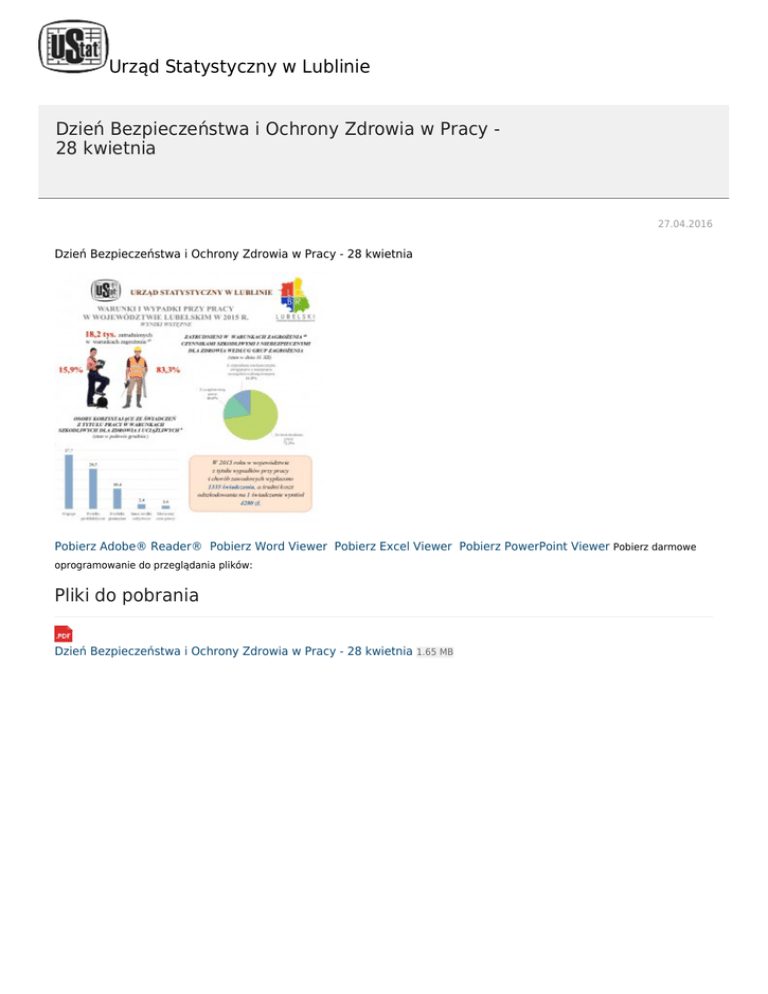 Urząd Statystyczny w Lublinie Dzień Bezpieczeństwa i Ochrony Zdrowia w Pracy 28 kwietnia 27.04.2016 Dzień Bezpieczeństwa i Ochrony Zdrowia w Pracy - 28 kwietnia Pobierz Adobe® Reader® Pobierz Word Viewer Pobierz Excel Viewer Pobierz PowerPoint Viewer Pobierz darmowe oprogramowanie do przeglądania plików: Pliki do pobrania Dzień Bezpieczeństwa i Ochrony Zdrowia w Pracy - 28 kwietnia 1.65 MB