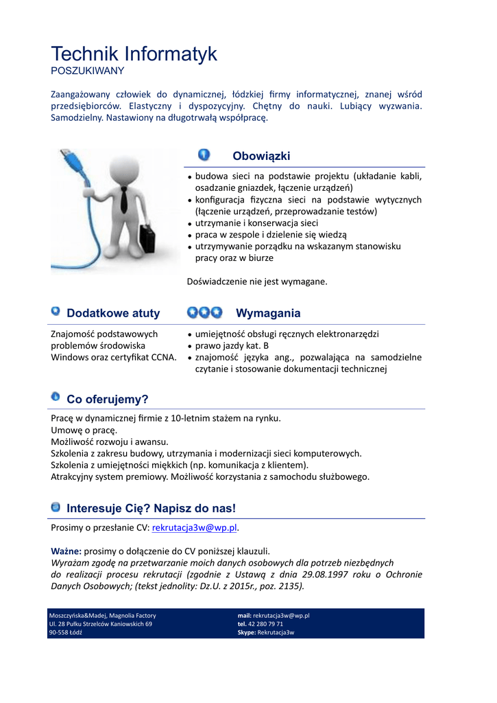 Technik Informatyk POSZUKIWANY Zaangażowany człowiek do dynamicznej, łódzkiej firmy informatycznej, znanej wśród przedsiębiorców. Elastyczny i dyspozycyjny. Chętny do nauki. Lubiący wyzwania. Samodzielny.Nastawionynadługotrwałąwspółpracę. Obowiązki ! • budowa sieci na podstawie projektu (układanie kabli, osadzaniegniazdek,łączenieurządzeń) • konfiguracja fizyczna sieci na podstawie wytycznych (łączenieurządzeń,przeprowadzanietestów) • utrzymanieikonserwacjasieci • pracawzespoleidzieleniesięwiedzą • utrzymywanieporządkunawskazanymstanowisku pracyorazwbiurze ! Doświadczenieniejestwymagane. Dodatkowe atuty ! ! ! ! Wymagania Znajomośćpodstawowych • umiejętnośćobsługiręcznychelektronarzędzi problemówśrodowiska • prawojazdykat.B WindowsorazcertyfikatCCNA. • znajomość języka ang., pozwalająca na samodzielne czytanieistosowaniedokumentacjitechnicznej Co oferujemy? ! Pracęwdynamicznejfirmiez10-letnimstażemnarynku. Umowęopracę. Możliwośćrozwojuiawansu. Szkoleniazzakresubudowy,utrzymaniaimodernizacjisiecikomputerowych. Szkoleniazumiejętnościmiękkich(np.komunikacjazklientem). Atrakcyjnysystempremiowy.Możliwośćkorzystaniazsamochodusłużbowego. Interesuje Cię? Napisz do nas! ! ProsimyoprzesłanieCV:[email protected]. Ważne:prosimyodołączeniedoCVponiższejklauzuli. Wyrażamzgodęnaprzetwarzaniemoichdanychosobowychdlapotrzebniezbędnych do realizacji procesu rekrutacji (zgodnie z Ustawą z dnia 29.08.1997 roku o Ochronie DanychOsobowych;(tekstjednolity:Dz.U.z2015r.,poz.2135). Moszczyńska&Madej,MagnoliaFactory Ul.28PułkuStrzelcówKaniowskich69 90-558Łódź mail:[email protected] tel.422807971 Skype:Rekrutacja3w