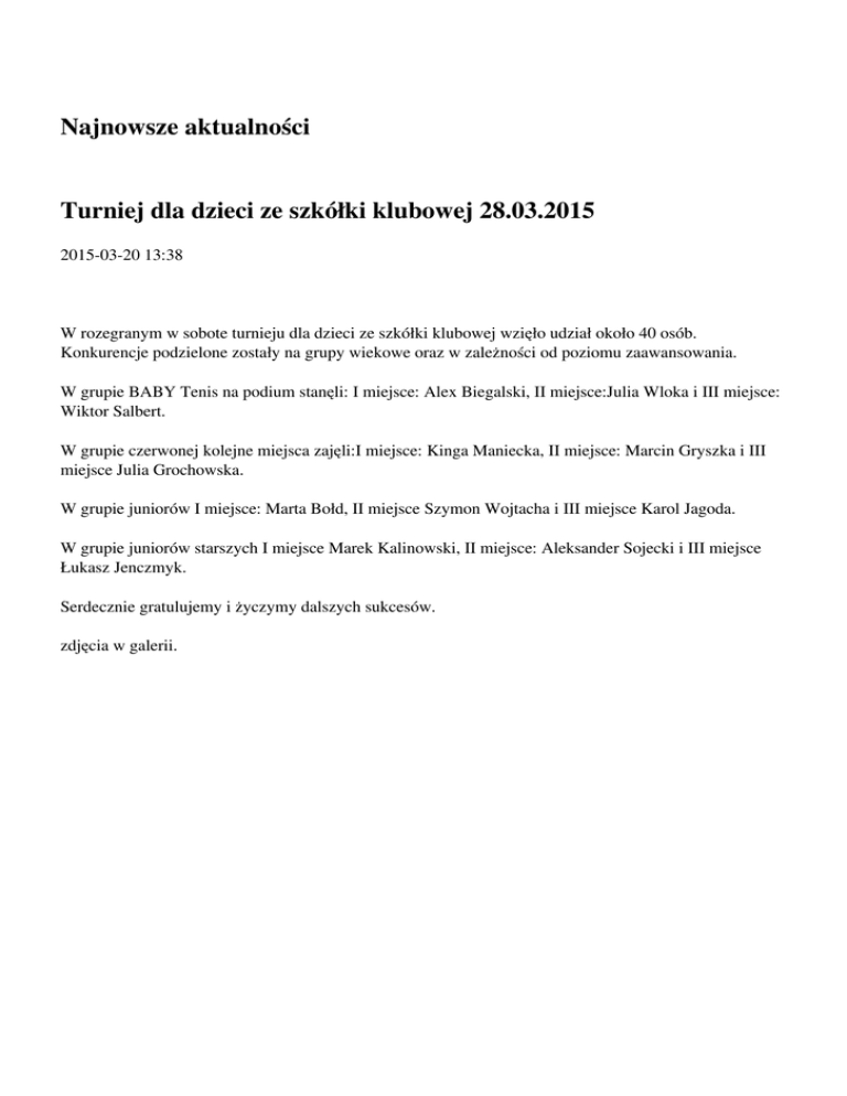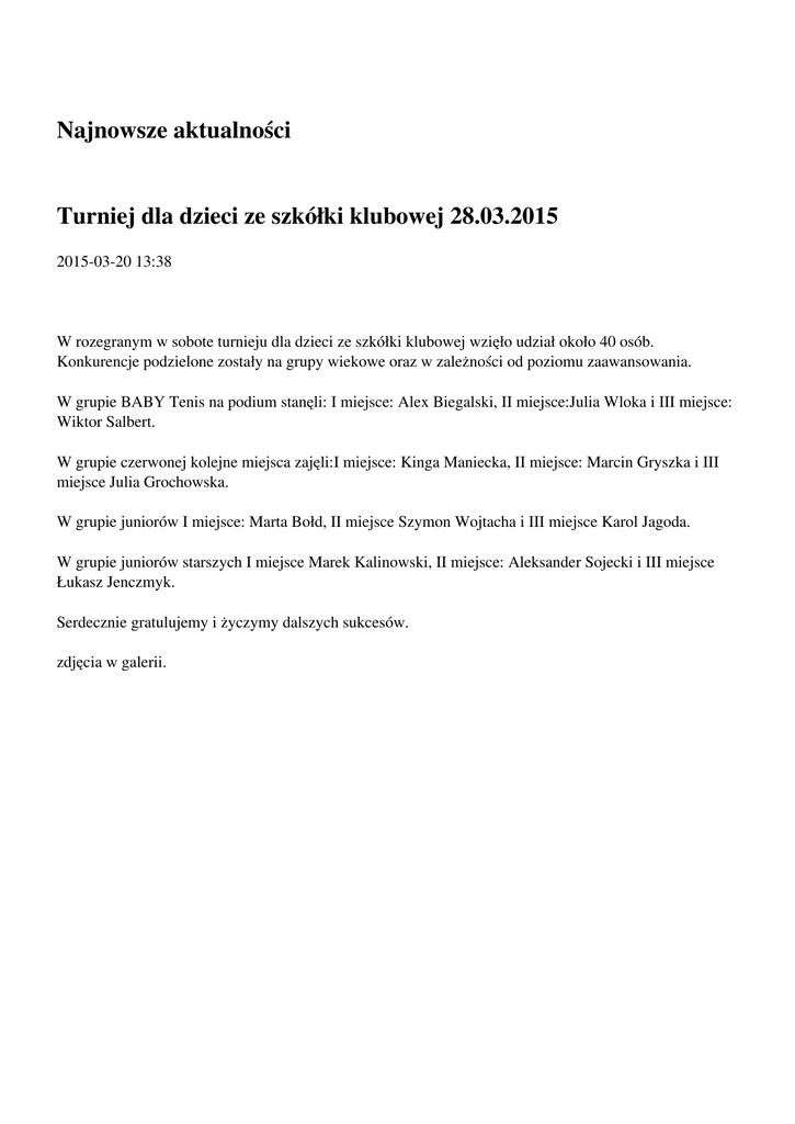 Najnowsze aktualności Turniej dla dzieci ze szkółki klubowej 28.03.2015 2015-03-20 13:38 W rozegranym w sobote turnieju dla dzieci ze szkółki klubowej wzięło udział około 40 osób. Konkurencje podzielone zostały na grupy wiekowe oraz w zależności od poziomu zaawansowania. W grupie BABY Tenis na podium stanęli: I miejsce: Alex Biegalski, II miejsce:Julia Wloka i III miejsce: Wiktor Salbert. W grupie czerwonej kolejne miejsca zajęli:I miejsce: Kinga Maniecka, II miejsce: Marcin Gryszka i III miejsce Julia Grochowska. W grupie juniorów I miejsce: Marta Bołd, II miejsce Szymon Wojtacha i III miejsce Karol Jagoda. W grupie juniorów starszych I miejsce Marek Kalinowski, II miejsce: Aleksander Sojecki i III miejsce Łukasz Jenczmyk. Serdecznie gratulujemy i życzymy dalszych sukcesów. zdjęcia w galerii. Powered by TCPDF (www.tcpdf.org)