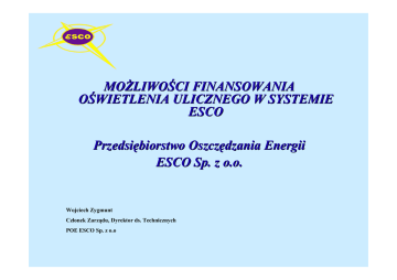 MOŻLIWOŚCI FINANSOWANIA OŚWIETLENIA ULICZNEGO W SYSTEMIE ESCO Przedsiębiorstwo Oszczędzania Energii ESCO Sp. z o.o. Wojciech Zygmunt Członek Zarządu, Dyrektor ds. Technicznych POE ESCO Sp. z o.o STATUS PRZEDSIĘBIORSTWA Przedsiębiorstwo Oszczędzania Energii ESCO Sp. o.o.z siedziba w Krakowie os. Handlowe 9 zostało założone jako Spółka prawa handlowego przy 100% wkładzie kapitałowym MPEC S.A. w Krakowie. Władzie Spółki: Zgromadzenie Wspólników, Rada Nadzorcza, Dwuosobowy Zarząd Kapitały: Kapitał podstawowy 525 000,00 zł Kapitał zapasowy 2 557 280,27 zł Zysk netto za rok 2010 63 569,55 zł Razem: 3 145 849,82 zł Spółka wdrożyła system w 2003r zapewnienia jakości ISO 9001:2000 HISTORIA POE „ESCO” Sp. z o.o. 16.09.1991r. Podpisanie umowy kredytowej z BŚ na realizację przedsięwzięcia „Modernizacja i Restrukturyzacja Systemu Ciepłowniczego w Krakowie” 29.06.1998r. Uchwała NR 78/17/MPEC/98 Zgoda WZA MPEC S.A. na podjęcie w oparciu o kredyt Banku Światowego działalności ESCO. 15.07.1999r. Uchwała nr 24 Zarządu MPEC S.A. – akceptacja Biznes Planu ESCO. lipiec 1999r. Projekty pilotażowe: (1) Szkoła Podstawowa nr 97 im. Dr Judyma 10, (2) AGH Wydział Zarządzania, budynek przy ul. Gramatyka10 w Krakowie 10.11.1999r. Uchwała NR 155/30/MPEC/99 Zgoda Nadzwyczajnego WZA MPEC S.A. na powołanie samodzielnego podmiotu gospodarczego, którego celem będzie prowadzenie działalności typu ESCO. 8.03.2000r. Podpisanie aktu założycielskiego spółki z ograniczoną odpowiedzialnością pod nazwą „Przedsiębiorstwo Oszczędzania Energii ESCO” 1.04.2000r. Rozpoczęcie działalności POE ESCO Sp. z o.o. 16.04.2002r. Podpisanie Umowy Pożyczki pomiędzy Międzynarodowym Bankiem Odbudowy i Rozwoju (BŚ) a MPEC S.A. Część środków kredytowych przeznaczono na realizację projektów ESCO przez POE ESCO Sp. z o.o 16.09.2004r. Pierwsze przedsięwzięcie termomodernizacyjne z wykorzystaniem środków X-XII 2004r. VII Liceum Ogólnokształcące ul. Skarbińskiego 08.08.2005r. podpisanie umowy Grantu z Funduszu Powierniczego GEF (Global Environmental Facility PROFIL DZIAŁALNOŚCI DZIAŁALNOŚĆ SPÓŁKI modernizacja energooszczędność ekologia PROJEKTOWANIE -sieci cieplne -węzły cieplne -kotłownie grzewcze -instalacje c.o. -instalacje c.w.u. -solarne systemy grzewcze -projekty architektoniczne -projekt ocieplenia ścian -oświetlenie PROJEKTY MODERNIZACYJNE W FORMULE ESCO (finansowane z uzyskanych oszczędności energii) OPRACOWANIA STUDIALNE I KONSULTING -modernizacja budynków -modernizacja sieci cieplnych i węzłów -cieplnych -modernizacja oświetlenia -redukcja zużycie energii elektrycznego kompensacja mocy biernej -modernizacja kotłowni grzewczych i technologicznych -budowa źródeł skojarzonych - odzysk biogazów -audyty energetyczne -studia wykonalności -wnioski do funduszy - (NWOŚ,WFOŚ, premia termo) -wnioski o środki Unijne -audyty termowizyjne -doradztwo STRUKTURA DZIAŁALNOŚCI Struktura przychodów 40% projekty modernizacyjne z finansowaniem /esco/ opracowania projektowe i studialne projekty modernizacyjne 37% 23% „ESCO” Energy Saving Company lub Energy Service Company oznaczają w firmę oferującą kompleksowe usługi eksperckie w zakresie energetyki gwarantującą potencjalnym klientom oszczędności energii i zmniejszenie ponoszonych z jej tytułu kosztów tytułu kosztów SKRÓTY ESCO BOOT TPF EPC Energy Saving Company, przedsiębiorstwo oferujące usługę modernizacji obiektu ze spłatą nakładów z oszczędności Build, own, operate, transfer – realizacja termomodernizacji poprzez budowę, własność, eksploatację i przekazanie Third party financing – finansowanie przez trzecią stronę Energy performance contracting – umowa z gwarancjami oszczędności CECHY PROJEKTÓW „ESCO” • • • • uzyskanie oszczędności energii jako mierzalny i weryfikowalny element przedsięwzięcia stanowiący jeden z podstawowych celów jego realizacji, kompleksowość usługi wyrażająca się wykonaniem w ramach jednego przedsięwzięcia /umowy/ całości niezbędnych działań zmierzających do uzyskania celu tj. przygotowanie koncepcji i założeń, wykonanie audytu energetycznego, wykonanie dokumentacji budowlanej, uzyskanie stosownych decyzji administracyjnych, wykonanie poszczególnych, przewidzianych do wykonania robót budowlanych, zagwarantowanie finansowania, prowadzenie eksploatacji, konserwacji, prowadzenie cyklicznego rozliczania uzyskanych oszczędności, podpisana umowa ma charakter „umowy o efekt”. Firma esco gwarantuje uzyskanie efektu energetycznego lub innego parametru przewidzianego umową, działalność esco traktowana jako działalność usługowa , nie inwestycyjna, gdzie wszelkie wykonywane modernizacje są traktowane jako środek do realizacji usługi /uzyskania oszczędności energii/. IDEA ESCO Neutralność 100% spodziewanych oszczędności + Koszty energii Przed projektem oszczędnościi + = Koszty energii Zapłata ESCO = 80% oszczęd ności W trakcie i po projekcie Zapłata ESCO Koszty energii W TRAKCIE PRZYGOTOWAŃ DO PROJEKTU FIRMA ESCO STARA ZNALEŚĆ ODPOWIEDŹ NA PYTANIE: Jak wysokie byłyby koszty ponoszone z tytułu wytwarzania lub/i zakupu energii gdyby nie wykonano projektu modernizacyjnego ? Finansowanie w formule ESCO Oszczędności Koszty ogrzewania przed projektem Koszty ogrzewania po projekcie Przed wdrożeniem projektu Po wdrożeniu projektu Cykl usługi w formule ESCO Przygotowanie wstępnej koncepcji modernizacji (Audyt Wstępny), Podpisanie kontraktu, Wykonanie audytu energetycznego, studium wykonalności, akceptacja klienta, Wykonanie dokumentacji technicznych i projektów, akceptacja klienta, Przeprowadzenie pełnego procesu inwestycyjnego, Przeprowadzenie szkoleń (gdy jest to istotne), Rozliczanie kosztów energii przez okres trwania kontraktu, Raportowanie uzyskanych oszczędności, akceptacje klienta dla przesyłanych raportów dokonanie rozliczeń końcowych, 