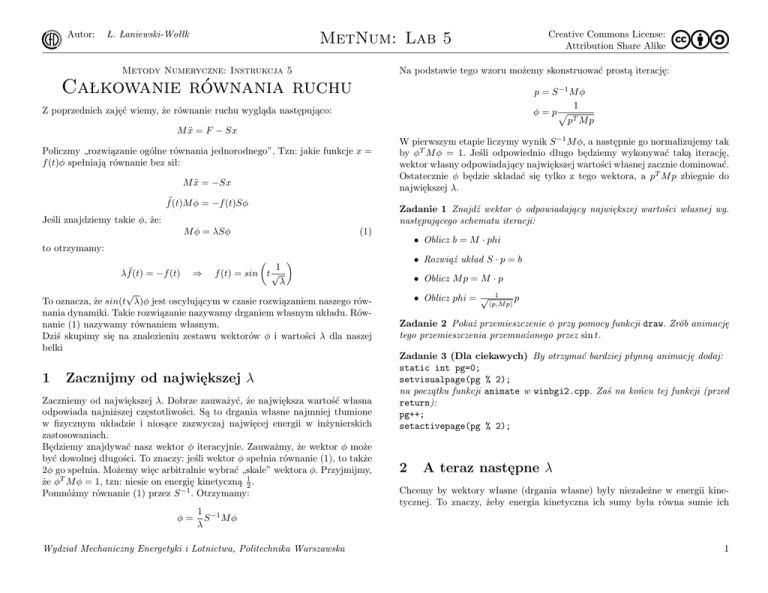 Autor: Ł. Łaniewski-Wołłk Creative Commons License: Attribution Share Alike MetNum: Lab 5 Na podstawie tego wzoru możemy skonstruować prostą iterację: Metody Numeryczne: Instrukcja 5 Całkowanie równania ruchu p = S −1 M φ 1 φ = pp pT M p Z poprzednich zajęć wiemy, że równanie ruchu wygląda następująco: M ẍ = F − Sx Policzmy „rozwiązanie ogólne równania jednorodnego”. Tzn: jakie funkcje x = f (t)φ spełniają równanie bez sił: M ẍ = −Sx f¨(t)M φ = −f (t)Sφ W pierwszym etapie liczymy wynik S −1 M φ, a następnie go normalizujemy tak by φT M φ = 1. Jeśli odpowiednio długo będziemy wykonywać taką iterację, wektor własny odpowiadający największej wartości własnej zacznie dominować. Ostatecznie φ będzie składać się tylko z tego wektora, a pT M p zbiegnie do największej λ. Zadanie 1 Znajdź wektor φ odpowiadający największej wartości własnej wg. następującego schematu iteracji: Jeśli znajdziemy takie φ, że: M φ = λSφ (1) • Oblicz b = M · phi to otrzymamy: λf¨(t) = −f (t) ⇒ 1 f (t) = sin t √ λ √ To oznacza, że sin(t λ)φ jest oscylującym w czasie rozwiązaniem naszego równania dynamiki. Takie rozwiązanie nazywamy drganiem własnym układu. Równanie (1) nazywamy równaniem własnym. Dziś skupimy się na znalezieniu zestawu wektorów φ i wartości λ dla naszej belki 1 Zacznijmy od największej λ Zaczniemy od największej λ. Dobrze zauważyć, że największa wartość własna odpowiada najniższej częstotliwości. Są to drgania własne najmniej tłumione w fizycznym układzie i niosące zazwyczaj najwięcej energii w inżynierskich zastosowaniach. Będziemy znajdywać nasz wektor φ iteracyjnie. Zauważmy, że wektor φ może być dowolnej długości. To znaczy: jeśli wektor φ spełnia równanie (1), to także 2φ go spełnia. Możemy więc arbitralnie wybrać „skale” wektora φ. Przyjmijmy, że φT M φ = 1, tzn: niesie on energię kinetyczną 12 . Pomnóżmy równanie (1) przez S −1 . Otrzymamy: φ= • Rozwiąż układ S · p = b • Oblicz M p = M · p • Oblicz phi = √ 1 p hp,M pi Zadanie 2 Pokaż przemieszczenie φ przy pomocy funkcji draw. Zrób animację tego przemieszczenia przemnożonego przez sin t. Zadanie 3 (Dla ciekawych) By otrzymać bardziej płynną animację dodaj: static int pg=0; setvisualpage(pg % 2); na początku funkcji animate w winbgi2.cpp. Zaś na końcu tej funkcji (przed return): pg++; setactivepage(pg % 2); 2 A teraz następne λ Chcemy by wektory własne (drgania własne) były niezależne w energii kinetycznej. To znaczy, żeby energia kinetyczna ich sumy była równa sumie ich 1 −1 S Mφ λ Wydział Mechaniczny Energetyki i Lotnictwa, Politechnika Warszawska 1 Autor: Ł. Łaniewski-Wołłk MetNum: Lab 5 Creative Commons License: Attribution Share Alike energii kinetycznych („Ek (φ0 + φ1 ) = Ek (φ0 ) + Ek (φ1 )”). To w połączeniu z naszą „skalą” daje nam bardzo ważny warunek: ( φTi M φj = 0 dla i 6= j φTi M φj = 1 dla i = j Mówiąc językiem numeryki: wektory te są do siebie ortonormalne względem macierzy M . Takiej ortonormalizacji możemy dokonać znaną z Analizy Matematycznej metodą Grama-Schmidta: Ortonormalizacja Grama-Schmidta Dla każdego i od 1 do n wykonaj: • dla każdego i od 1 do i − 1 wykonaj (dla i = 1 nic nie rób): – Oblicz φi = φi − φj hφj , M φi i • Oblicz φi = √ 1 φi hφi ,M φi i Po tej procedurze wszystkie wektory φ są ortogonalne i długości 1 względem macierzy M . Zadanie 4 Znajdź wektory φi odpowiadające 10ciu największym wartościom własnym wg. następującego schematu iteracji: • Oblicz b = M · phij • Rozwiąż układ S · pj = b • Przepisz phii = pi • Wykonaj ortonormalizację G-S wektorów phi Zadanie 5 Zrób animację dla kolejnych przemieszczeń φi przemnożonych przez sin t. Zadanie 6 Wyznacz odpowiednie λi Wydział Mechaniczny Energetyki i Lotnictwa, Politechnika Warszawska 2