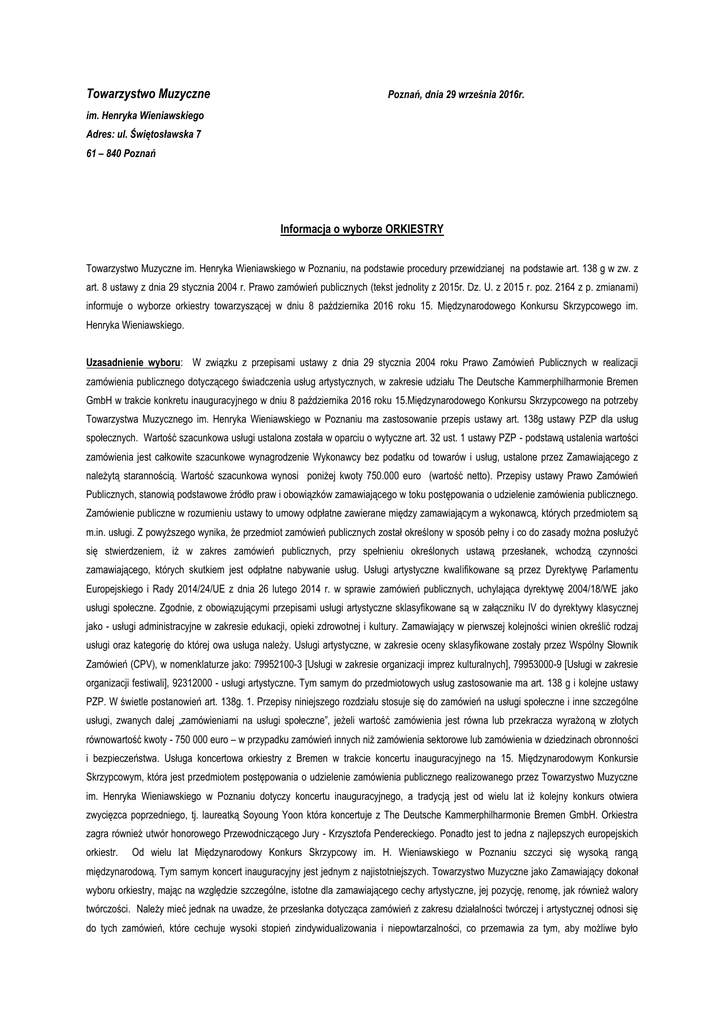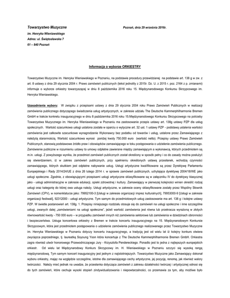 Towarzystwo Muzyczne Poznań, dnia 29 września 2016r. im. Henryka Wieniawskiego Adres: ul. Świętosławska 7 61 – 840 Poznań Informacja o wyborze ORKIESTRY Towarzystwo Muzyczne im. Henryka Wieniawskiego w Poznaniu, na podstawie procedury przewidzianej na podstawie art. 138 g w zw. z art. 8 ustawy z dnia 29 stycznia 2004 r. Prawo zamówień publicznych (tekst jednolity z 2015r. Dz. U. z 2015 r. poz. 2164 z p. zmianami) informuje o wyborze orkiestry towarzyszącej w dniu 8 października 2016 roku 15. Międzynarodowego Konkursu Skrzypcowego im. Henryka Wieniawskiego. Uzasadnienie wyboru: W związku z przepisami ustawy z dnia 29 stycznia 2004 roku Prawo Zamówień Publicznych w realizacji zamówienia publicznego dotyczącego świadczenia usług artystycznych, w zakresie udziału The Deutsche Kammerphilharmonie Bremen GmbH w trakcie konkretu inauguracyjnego w dniu 8 października 2016 roku 15.Międzynarodowego Konkursu Skrzypcowego na potrzeby Towarzystwa Muzycznego im. Henryka Wieniawskiego w Poznaniu ma zastosowanie przepis ustawy art. 138g ustawy PZP dla usług społecznych. Wartość szacunkowa usługi ustalona została w oparciu o wytyczne art. 32 ust. 1 ustawy PZP - podstawą ustalenia wartości zamówienia jest całkowite szacunkowe wynagrodzenie Wykonawcy bez podatku od towarów i usług, ustalone przez Zamawiającego z należytą starannością. Wartość szacunkowa wynosi poniżej kwoty 750.000 euro (wartość netto). Przepisy ustawy Prawo Zamówień Publicznych, stanowią podstawowe źródło praw i obowiązków zamawiającego w toku postępowania o udzielenie zamówienia publicznego. Zamówienie publiczne w rozumieniu ustawy to umowy odpłatne zawierane między zamawiającym a wykonawcą, których przedmiotem są m.in. usługi. Z powyższego wynika, że przedmiot zamówień publicznych został określony w sposób pełny i co do zasady można posłużyć się stwierdzeniem, iż w zakres zamówień publicznych, przy spełnieniu określonych ustawą przesłanek, wchodzą czynności zamawiającego, których skutkiem jest odpłatne nabywanie usług. Usługi artystyczne kwalifikowane są przez Dyrektywę Parlamentu Europejskiego i Rady 2014/24/UE z dnia 26 lutego 2014 r. w sprawie zamówień publicznych, uchylająca dyrektywę 2004/18/WE jako usługi społeczne. Zgodnie, z obowiązującymi przepisami usługi artystyczne sklasyfikowane są w załączniku IV do dyrektywy klasycznej jako - usługi administracyjne w zakresie edukacji, opieki zdrowotnej i kultury. Zamawiający w pierwszej kolejności winien określić rodzaj usługi oraz kategorię do której owa usługa należy. Usługi artystyczne, w zakresie oceny sklasyfikowane zostały przez Wspólny Słownik Zamówień (CPV), w nomenklaturze jako: 79952100-3 [Usługi w zakresie organizacji imprez kulturalnych], 79953000-9 [Usługi w zakresie organizacji festiwali], 92312000 - usługi artystyczne. Tym samym do przedmiotowych usług zastosowanie ma art. 138 g i kolejne ustawy PZP. W świetle postanowień art. 138g. 1. Przepisy niniejszego rozdziału stosuje się do zamówień na usługi społeczne i inne szczególne usługi, zwanych dalej „zamówieniami na usługi społeczne”, jeżeli wartość zamówienia jest równa lub przekracza wyrażoną w złotych równowartość kwoty - 750 000 euro – w przypadku zamówień innych niż zamówienia sektorowe lub zamówienia w dziedzinach obronności i bezpieczeństwa. Usługa koncertowa orkiestry z Bremen w trakcie koncertu inauguracyjnego na 15. Międzynarodowym Konkursie Skrzypcowym, która jest przedmiotem postępowania o udzielenie zamówienia publicznego realizowanego przez Towarzystwo Muzyczne im. Henryka Wieniawskiego w Poznaniu dotyczy koncertu inauguracyjnego, a tradycją jest od wielu lat iż kolejny konkurs otwiera zwycięzca poprzedniego, tj. laureatką Soyoung Yoon która koncertuje z The Deutsche Kammerphilharmonie Bremen GmbH. Orkiestra zagra również utwór honorowego Przewodniczącego Jury - Krzysztofa Pendereckiego. Ponadto jest to jedna z najlepszych europejskich orkiestr. Od wielu lat Międzynarodowy Konkurs Skrzypcowy im. H. Wieniawskiego w Poznaniu szczyci się wysoką rangą międzynarodową. Tym samym koncert inauguracyjny jest jednym z najistotniejszych. Towarzystwo Muzyczne jako Zamawiający dokonał wyboru orkiestry, mając na względzie szczególne, istotne dla zamawiającego cechy artystyczne, jej pozycję, renomę, jak również walory twórczości. Należy mieć jednak na uwadze, że przesłanka dotycząca zamówień z zakresu działalności twórczej i artystycznej odnosi się do tych zamówień, które cechuje wysoki stopień zindywidualizowania i niepowtarzalności, co przemawia za tym, aby możliwe było udzielenie ich tylko jednemu, konkretnemu wykonawcy. O możliwości zastosowania trybu niekonkurencyjnego decydują więc szczególne, istotne dla zamawiającego cechy artysty lub twórcy, jego pozycja, renoma, czy też walory jego twórczości (dzieł). Podobne stanowisko zajął Naczelny Sąd Administracyjny w swoim orzeczeniu z dnia 17 lipca 2003 r. (sygn. akt II SA 3944/02), twierdząc - chodzi tu w szczególności o sytuację istnienia swoistego monopolu na rynku z zakresu danej dziedziny kultury i sztuki, a więc gdy wykonanie określonego dzieła przez innego autora nie przyniosłoby zamierzonego rezultatu. Zamawiający dokonał wyboru na wykonanie wyżej opisanego zamówienia na rzecz: The Deutsche Kammerphilharmonie Bremen GmbH z siedzibą Landenstrafe 13, Brema, Niemcy o wartości szacunkowej nie przekraczającej 50.000 EURO. Prowadzący sprawę merytorycznie – Ewa Mikołajczak. Podstawa prawna: art. 138 g ustawy z dnia 29 stycznia 2004r. Prawo Zamówień Publicznych (opracowanym na podstawie ustawy z dnia 29 stycznia 2004 r. Prawo Zamówień Publicznych). Z poważaniem Bartosz Bryła Prezes