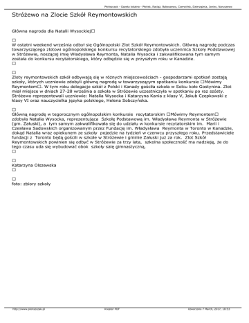Płońszczak - Gazeta lokalna - Płońsk, Raciąż, Baboszewo, Czerwińsk, Dzierzążnia, Joniec, Naruszewo Stróżewo na Zlocie Szkół Reymontowskich Główna nagroda dla Natalii Wysockiej W ostatni weekend września odbył się Ogólnopolski Zlot Szkół Reymontowskich. Główną nagrodę podczas towarzyszącego zlotowi ogólnopolskiego konkursu recytatorskiego zdobyła uczennica Szkoły Podstawowej w Stróżewie, noszącej imię Władysława Reymonta, Natalia Wysocka i zakwalifikowana tym samym została do konkursu recytatorskiego, który odbędzie się w przyszłym roku w Kanadzie. Zloty reymontowskich szkół odbywają się w różnych miejscowościach - gospodarzami spotkań zostają szkoły, których uczniowie zdobyli główną nagrodę w towarzyszącym spotkaniu konkursie Mówimy Reymontem. W tym roku delegacje szkół z Polski i Kanady gościła szkoła w Solcu koło Gostynina. Zlot miał miejsce w dniach 27-28 września a szkoła w Stróżewie uczestniczyła w spotkaniu po raz szósty. Stróżewo reprezentowali uczniowie: Natalia Wysocka i Katarzyna Kania z klasy V, Jakub Czepkowski z klasy VI oraz nauczycielka języka polskiego, Helena Sobczyńska. Główną nagrodę w tegorocznym ogólnopolskim konkursie recytatorskim Mówimy Reymontem zdobyła Natalia Wysocka, reprezentująca Szkołę Podstawową im. Władysława Reymonta w Stróżewie (gm. Załuski), a tym samym zakwalifikowała się do udziału w konkursie recytatorskim im. Marii i Czesława Sadowskich organizowanym przez Fundację im. Władysława Reymonta w Toronto w Kanadzie, dokąd Natalia wraz opiekunem ze szkoły pojedzie na tydzień w czerwcu przyszłego roku. Przedstawiciele fundacji z Toronto będą gościli w szkole w Stróżewie i gminie Załuski już za rok. Zlot Szkół Reymontowskich powinien się odbyć w Stróżewie za trzy lata, szkolna społeczność ma nadzieję, że do tego czasu uda się wybudować obok szkoły salę gimnastyczną. Katarzyna Olszewska foto: zbiory szkoły http://www.plonszczak.pl Kreator PDF Utworzono 7 March, 2017, 18:53