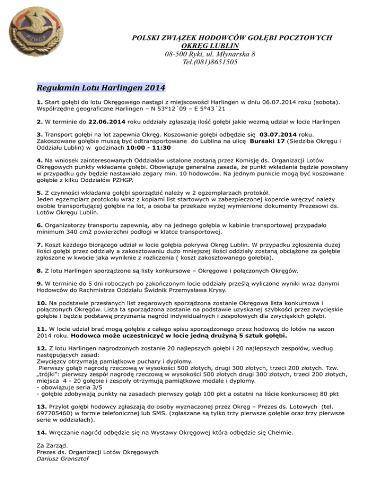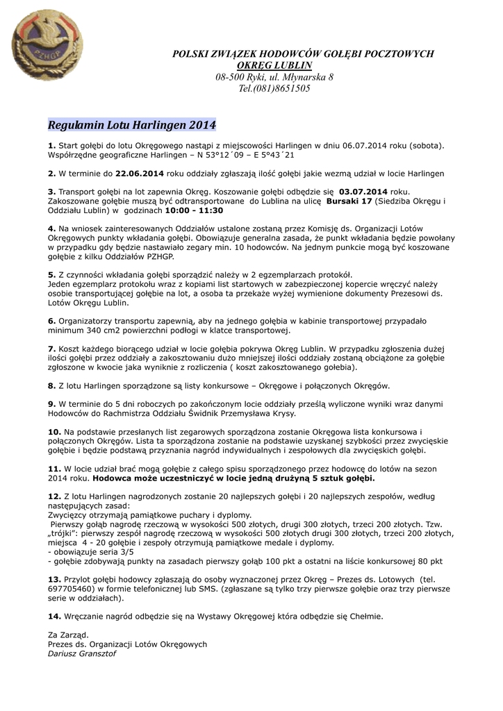 POLSKI ZWIĄZEK HODOWCÓW GOŁĘBI POCZTOWYCH OKRĘG LUBLIN 08-500 Ryki, ul. Młynarska 8 Tel.(081)8651505 Regulamin Lotu Harlingen 2014 1. Start gołębi do lotu Okręgowego nastąpi z miejscowości Harlingen w dniu 06.07.2014 roku (sobota). Współrzędne geograficzne Harlingen – N 53°12´09 – E 5°43´21 2. W terminie do 22.06.2014 roku oddziały zgłaszają ilość gołębi jakie wezmą udział w locie Harlingen 3. Transport gołębi na lot zapewnia Okręg. Koszowanie gołębi odbędzie się 03.07.2014 roku. Zakoszowane gołębie muszą być odtransportowane do Lublina na ulicę Bursaki 17 (Siedziba Okręgu i Oddziału Lublin) w godzinach 10:00 - 11:30 4. Na wniosek zainteresowanych Oddziałów ustalone zostaną przez Komisję ds. Organizacji Lotów Okręgowych punkty wkładania gołębi. Obowiązuje generalna zasada, że punkt wkładania będzie powołany w przypadku gdy będzie nastawiało zegary min. 10 hodowców. Na jednym punkcie mogą być koszowane gołębie z kilku Oddziałów PZHGP. 5. Z czynności wkładania gołębi sporządzić należy w 2 egzemplarzach protokół. Jeden egzemplarz protokołu wraz z kopiami list startowych w zabezpieczonej kopercie wręczyć należy osobie transportującej gołębie na lot, a osoba ta przekaże wyżej wymienione dokumenty Prezesowi ds. Lotów Okręgu Lublin. 6. Organizatorzy transportu zapewnią, aby na jednego gołębia w kabinie transportowej przypadało minimum 340 cm2 powierzchni podłogi w klatce transportowej. 7. Koszt każdego biorącego udział w locie gołębia pokrywa Okręg Lublin. W przypadku zgłoszenia dużej ilości gołębi przez oddziały a zakosztowaniu dużo mniejszej ilości oddziały zostaną obciążone za gołębie zgłoszone w kwocie jaka wyniknie z rozliczenia ( koszt zakosztowanego gołebia). 8. Z lotu Harlingen sporządzone są listy konkursowe – Okręgowe i połączonych Okręgów. 9. W terminie do 5 dni roboczych po zakończonym locie oddziały prześlą wyliczone wyniki wraz danymi Hodowców do Rachmistrza Oddziału Świdnik Przemysława Krysy. 10. Na podstawie przesłanych list zegarowych sporządzona zostanie Okręgowa lista konkursowa i połączonych Okręgów. Lista ta sporządzona zostanie na podstawie uzyskanej szybkości przez zwycięskie gołębie i będzie podstawą przyznania nagród indywidualnych i zespołowych dla zwycięskich gołębi. 11. W locie udział brać mogą gołębie z całego spisu sporządzonego przez hodowcę do lotów na sezon 2014 roku. Hodowca może uczestniczyć w locie jedną drużyną 5 sztuk gołębi. 12. Z lotu Harlingen nagrodzonych zostanie 20 najlepszych gołębi i 20 najlepszych zespołów, według następujących zasad: Zwycięzcy otrzymają pamiątkowe puchary i dyplomy. Pierwszy gołąb nagrodę rzeczową w wysokości 500 złotych, drugi 300 złotych, trzeci 200 złotych. Tzw. „trójki”: pierwszy zespół nagrodę rzeczową w wysokości 500 złotych drugi 300 złotych, trzeci 200 złotych, miejsca 4 - 20 gołębie i zespoły otrzymują pamiątkowe medale i dyplomy. - obowiązuje seria 3/5 - gołębie zdobywają punkty na zasadach pierwszy gołąb 100 pkt a ostatni na liście konkursowej 80 pkt 13. Przylot gołębi hodowcy zgłaszają do osoby wyznaczonej przez Okręg – Prezes ds. Lotowych (tel. 697705460) w formie telefonicznej lub SMS. (zgłaszane są tylko trzy pierwsze gołębie oraz trzy pierwsze serie w oddziałach). 14. Wręczanie nagród odbędzie się na Wystawy Okręgowej która odbędzie się Chełmie. Za Zarząd. Prezes ds. Organizacji Lotów Okręgowych Dariusz Gransztof