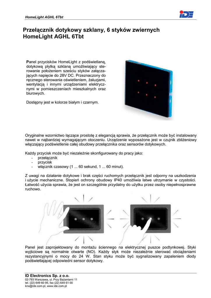 HomeLight AGHL 6Tbt Przełącznik dotykowy szklany, 6 styków zwiernych HomeLight AGHL 6Tbt Panel przycisków HomeLight z podświetlaną, dotykową płytką szklaną umoŜliwiający sterowanie połoŜeniem sześciu styków załączających napięcie do 28V DC. Przeznaczony do ręcznego sterowania oświetleniem, Ŝaluzjami, wentylacją i innymi urządzeniami elektrycznymi w pomieszczeniach mieszkalnych oraz biurowych. Dostępny jest w kolorze białym i czarnym. Oryginalne wzornictwo łączące prostotę z elegancją sprawia, Ŝe przełącznik moŜe być instalowany nawet w najbardziej wymagającym otoczeniu. Urządzenie wyposaŜone jest w czujnik zbliŜeniowy włączający podświetlenie całej obudowy przełącznika oraz sensorów dotykowych. KaŜdy przycisk moŜe być niezaleŜnie skonfigurowany do pracy jako: - przełącznik - przycisk - włącznik czasowy (1 ... 60 sekund, 1 ... 60 minut). Z uwagi na działanie dotykowe i brak części ruchomych przełącznik jest odporny na uszkodzenia i uŜycie mechaniczne. Stopień ochrony obudowy IP40 umoŜliwia łatwe utrzymanie w czystości. Łatwość uŜycia sprawia, Ŝe jest on szczególnie przydatny do uŜytku przez osoby niepełnosprawne ruchowo. Panel jest zaprojektowany do montaŜu ściennego na elektrycznej puszce podtynkowej. Styki wyjściowe są normalnie otwarte (NO). KaŜdy styk moŜe niezaleŜnie sterować obciąŜeniami rezystancyjnymi o mocy do 24 W. Stan styku moŜe być sygnalizowany zapaleniem diody podświetlającej odpowiedni sensor dotykowy. ID Electronics Sp. z o.o. 02-793 Warszawa, ul. Przy BaŜantarni 11 tel. (22) 649 60 95, fax (22) 649 61 00 [email protected], www.ide.com.pl HomeLight AGHL 6Tbt Wyjścia: Wymiary (bez płytki szklanej): Parametry techniczne: Urządzenie HomeLight AGHL 6Tbt Zasilanie 10 - 31 V DC Pobór mocy maks. 2,5 W Przyciski 6 dotykowych Wyjścia 6 przekaźnikowych, zwiernych (NO), do 2A kaŜde Temperatura pracy -20 - +45 ºC Wymiary obudowy 118x83x31 mm, nad tynkiem 118x83x10 mm Stopień ochrony IP40 MontaŜ na puszce standard włoski 3M np. Vimar V71303 Uwagi montaŜowe: W trakcie wykonywania instalacji i uruchomienia naleŜy przestrzegać wszystkich przepisów bezpieczeństwa i zasad wykonywania prac elektrycznych. Obwód zasilający powinien być zabezpieczony bezpiecznikiem 2A. Przed podłączeniem kabli zaleŜy wyłączyć zasilanie. Urządzenie nie przeznaczone do sterowania urządzeniami mechanicznymi (windy, wyciągarki, dźwigi) ani sprzętem medycznym. Szczególną ostroŜność naleŜy zachować przy montaŜu i demontaŜu wierzchniej płytki szklanej – w przypadku pęknięcia jest bardzo ostra i moŜe spowodować skaleczenia. Do czyszczenia panelu naleŜy uŜywać wyłącznie wilgotnej szmatki. Nie naleŜy stosować rozpuszczalników ani środków chemicznych. ID Electronics Sp. z o.o. 02-793 Warszawa, ul. Przy BaŜantarni 11 tel. (22) 649 60 95, fax (22) 649 61 00 [email protected], www.ide.com.pl