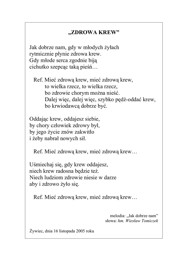 „ZDROWA KREW” Jak dobrze nam, gdy w młodych żyłach rytmicznie płynie zdrowa krew. Gdy młode serca zgodnie biją cichutko szepcąc taką pieśń… Ref. Mieć zdrową krew, mieć zdrową krew, to wielka rzecz, to wielka rzecz, bo zdrowie chorym można nieść. Dalej więc, dalej więc, szybko pędź-oddać krew, bo krwiodawcą dobrze być. Oddając krew, oddajesz siebie, by chory człowiek zdrowy był, by jego życie znów zakwitło i żeby nabrał nowych sił. Ref. Mieć zdrową krew, mieć zdrową krew… Uśmiechaj się, gdy krew oddajesz, niech krew radosna będzie też. Niech ludziom zdrowie niesie w darze aby i zdrowo żyło się. Ref. Mieć zdrową krew, mieć zdrową krew… melodia: „Jak dobrze nam” słowa: hm. Wiesław Tomiczek Żywiec, dnia 16 listopada 2005 roku
