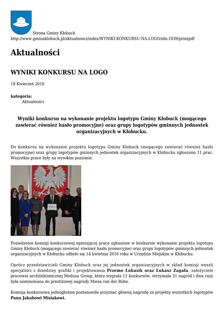 Strona Gminy Kłobuck http://www.gminaklobuck.pl/aktualnosci/index/WYNIKI-KONKURSU-NA-LOGO/idn:1039/printpdf Aktualności WYNIKI KONKURSU NA LOGO 18 Kwiecień 2016 kategoria: Aktualności Wyniki konkursu na wykonanie projektu logotypu Gminy Kłobuck (mogącego zawierać również hasło promocyjne) oraz grupy logotypów gminnych jednostek organizacyjnych w Kłobucku. Do konkursu na wykonanie projektu logotypu Gminy Kłobuck (mogącego zawierać również hasło promocyjne) oraz grupy logotypów gminnych jednostek organizacyjnych w Kłobucku zgłoszono 11 prac. Wszystkie prace były na wysokim poziomie. Posiedzenie komisji konkursowej opiniującej prace zgłoszone w konkursie wykonanie projektu logotypu Gminy Kłobuck (mogącego zawierać również hasło promocyjne) oraz grupy logotypów gminnych jednostek organizacyjnych w Kłobucku odbyło się 14 kwietnia 2016 roku w Urzędzie Miejskim w Kłobucku. Oprócz przedstawicieli Gminy Kłobuck oraz jej jednostek organizacyjnych w skład komisji weszli specjaliści z dziedziny grafiki i projektowania Przemo Łukasik oraz Łukasz Zagała, założyciele pracowni architektonicznej Medusa Group, która wygrała 11 konkursów, otrzymała 31 nagród i dwa razy była nominowana do prestiżowej nagrody Miesa van der Rohe. Komisja konkursowa jednogłośnie postanowiła przyznać główną nagrodę za projekty wszystkich logotypów Panu Jakubowi Misiakowi. Wybór nagrodzonej pracy uzasadniono profesjonalnym podejściem do zadanego tematu, jasnym i prostym przekazem oraz spełnieniem wymogów określonych w regulaminie konkursu. Forma graficzna jednoznacznie identyfikuje się z określoną jednostką oraz spełnia rolę promocyjną i informacyjną. Z uwagi na wysoki poziom prac konkursowych Komisja przyznała również trzy wyróżnienia. Wszystkim autorom dziękujemy za udział w konkursie. Nagrodzone logotypy autorstwa Jakuba Misiaka WYNIKI KONKURSU NA LOGO WYNIKI KONKURSU NA LOGO 6 zdjęć 15 kwiecień 2016 powrót do listy aktualności poprzednia następna
