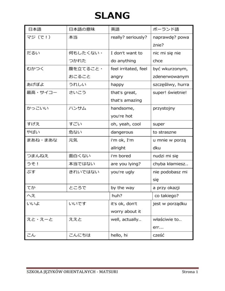 SLANG 日本語 マジ(で!) 日本語の意味 英語 ポーランド語 本当 really? seriously? naprawdę? powa żnie? だるい 何もしたくない・ I don’t want to nic mi się nie つかれた do anything chce 腹を立てること・ feel irritated, feel być wkurzonym, おこること angry zdenerwowanym あげぽよ うれしい happy szczęśliwy, hurra 最高・サイコー さいこう that’s great, super! świetnie! むかつく that’s amazing かっこいい ハンサム handsome, przystojny you’re hot すげえ すごい oh, yeah, cool super やばい 危ない dangerous to straszne まあね・まあな 元気 i’m ok, I’m u mnie w porzą allright dku つまんねえ 面白くない i’m bored nudzi mi się うそ! 本当ではない are you lying? chyba kłamiesz.. ぶす きれいではない you’re ugly nie podobasz mi się てか ところで へえ いいよ by the way huh? いいです it’s ok, don’t a przy okazji co takiego? jest w porządku worry about it えと・えーと ええと well, actually.. właściwie to.. err... こん こんにちは hello, hi SZKOŁA JĘZYKÓW ORIENTALNYCH - MATSURI cześć Strona 1