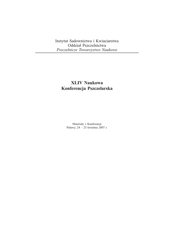 Instytut Sadownictwa i Kwiaciarstwa Oddzia³ Pszczelnictwa Pszczelnicze Towarzystwo Naukowe XLIV Naukowa Konferencja Pszczelarska Materia³y z Konferencji Pu³awy, 24 – 25 kwietnia 2007 r. INDEKS AUTORÓW Abdulov Talgat ............................... 17 Avdeev N. .................................... 122 Baj Tomasz ................................... 148 Bakier S³awomir .................. 112, 114 B¹k Beata ................................. 61, 82 Banaszak-Cibicka Weronika ........ 105 Bieñkowska Ma³gorzata ......... 18, 26, ................................................. 59, 133 Biliñski Mieczys³aw ............ 106, 110 Bogdanov G. ........................ 115, 128 Borsuk Grzegorz ........... 5, 11, 13, 14 Bo¿ek Ma³gorzata ...........................86 Brandorf A. .................................... 21 Bratkowski Janusz ................... 47, 61 Buczek Krzysztof ........................... 62 Buranbaev Ilnur ........................... 121 Burzyñski R.S. ......................... 13, 14 Cegliñska Katarzyna .................... 117 Èeksteryte V. .................................. 41 Chmielewski Marek W. ................. 63 Chmielewski Wit ........................... 65 Chorbiñski Pawe³ .................... 22, 66 Chuda-Mickiewicz Bo¿ena .... 24, 47, ....................................................68, 72 Chudzik Jadwiga ..................... 37, 38 Chwil Miros³awa .. 87, 89, 90, 91, 99 Cio³ek Aneta .................................... 7 Czekoñska Krystyna ................ 24, 25 Dmitruk Marta ............................... 93 Fliszkiewicz Monika .................... 107 Fr¹czek Rafa³ ................................. 46 Gajda Anna .................................. 130 Gerula Dariusz ......................... 18, 26 Giejdasz Karol ..................... 107, 108 G³owniak Kazimierz ........... 145, 148 Góra Magdalena ............................. 43 Gruszczyñska Aleksandra ................ 8 Grzelak Jakub .............................. 105 Grzywnowicz Krzysztof .................. 7 Hoffman Marian ............................. 56 Ilyasov R.A. ................................... 29 Ishakov Junir .................................. 17 Ishemgulov Amir .......... 17, 121, 137 Ishemgulova Zuhra ...................... 137 Ishemgulova Nazira ..................... 121 Jasicka-Misiak Izabela ................. 119 Jasiñski Zygmunt ....................... 8, 47 Jojczyk A. ...................................... 47 Junusbaev Azamat ....................... 121 Kaba³a-Dzik Agata ............. 138, 139, ............................................... 140, 144 Kafarski Pawe³ ............................. 119 Kaipkulov Ruslan .......................... 17 Kamler František ............................ 50 Kasperek K. ............................. 13, 14 Kasprzak Marcin ................. 140, 144 Kasztelewicz Janusz ................ 33, 70 Kasztelewicz Krzysztof ................. 35 Khismatullin R. ............................ 122 Kolbina Lidia ........................... 30, 93 Ko³towski Zbigniew .................95, 96 Komissar Alexander .................... 109 Krieg Pavel .................................... 32 Kruk Cezary ................ 33. 35, 37, 38 Kuzyaev R. ................................... 122 Kwiatkowski Stanis³aw ....... 145, 148 Legotkina G. ................................ 122 Lipiñski Zbigniew .......................... 70 Lokutova O. ......................... 115, 128 Londzin Wies³aw ................... 72, 127 Lyapunov Y. ................................. 122 Madras-Majewska Beata ........... 8, 47 Marquardt Wojciech ............ 138, 139 Martynyuk O. ............................... 128 Michoñska Magdalena ................... 98 Mitrowska Kamila ....................... 130 Nepeivoda Sofia ...................... 30, 93 Nepeivoda Antonida ...................... 30 Nikolenko A.G. .............................. 29 Nowaczyk Magdalena ................... 56 Okniañski Piotr .............................. 10 Oleksa Andrzej .............................. 39 Olszewski Krzysztof ..... 5, 11, 13, 14 Paleolog Jerzy ................5, 11, 13, 14 Panasiuk Beata ........................ 18, 26 Paplauskiene V. .............................. 41 Pašakinskiene I. ............................. 41 Pasieka Magdalena ........................ 52 Paszek Grzegorz .......................... 127 Pietruszka Katarzyna ................... 130 Materia³y z Naukowej Konferencji Pszczelarskiej, Pu³awy 2007 151 Piletskaya Irina .............................. 74 Piotrowska Krystyna ...................... 97 Pogrebnyak Svyatoslav .................. 74 Pohorecka Krystyna ....................... 72 Polaczek Benedikt ......................... 76 Poskryakov A.V. ............................ 29 Posyniak Andrzej ......................... 130 Prabucki Jaros³aw .................... 47, 68 Psyanchin Marat .......................... 137 Raèys Jurgis ............................. 41, 50 Rogoziñski Tomasz ........................ 56 Roman Adam ........................... 43, 52 Romaniuk Konstanty ..................... 79 Romaniuk Dorota ................ 140, 144 Rostecki Piotr ................................. 68 Rukšënas Algimantas ..................... 14 Rybak-Chmielewska Helena ...... 131, ............................................... 133, 135 Rzepecka-Stojko Anna ........ 140, 144 Sager M. ....................................... 115 Samborski Jerzy ................ 47, 54, 68 Schricker Burkhard ........................ 76 Semkiw Piotr ................................ 134 Shangaraeva Guzel ................ 17, 121 Shibanova Nazira ......................... 122 Shumakova Irina .......................... 109 Siuda Maciej ............................ 47, 82 Skirkevièius Algirdas ..................... 14 Skowronek Wojciech ................... 134 Skubida Piotr ....................... 134, 135 Smagacz Olga ...................... 138, 139 Sokó³ Rajmund .............................. 78 S