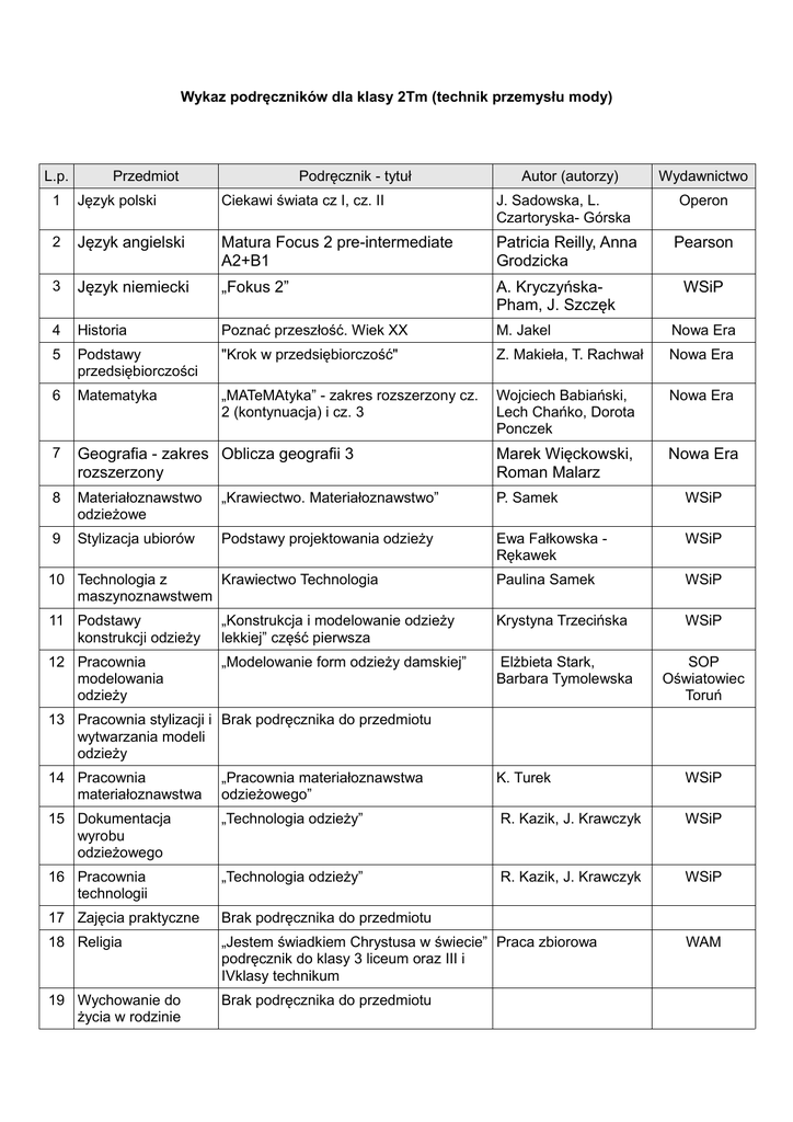 Wykaz podręczników dla klasy 2Tm (technik przemysłu mody) L.p. Przedmiot Podręcznik - tytuł Autor (autorzy) Wydawnictwo 1 Język polski Ciekawi świata cz I, cz. II J. Sadowska, L. Czartoryska- Górska Operon 2 Język angielski Matura Focus 2 pre-intermediate A2+B1 Patricia Reilly, Anna Grodzicka Pearson 3 Język niemiecki „Fokus 2” A. KryczyńskaPham, J. Szczęk 4 Historia Poznać przeszłość. Wiek XX M. Jakel Nowa Era 5 Podstawy przedsiębiorczości "Krok w przedsiębiorczość" Z. Makieła, T. Rachwał Nowa Era 6 Matematyka „MATeMAtyka” - zakres rozszerzony cz. 2 (kontynuacja) i cz. 3 Wojciech Babiański, Lech Chańko, Dorota Ponczek Nowa Era 7 Geografia - zakres Oblicza geografii 3 rozszerzony Marek Więckowski, Roman Malarz Nowa Era 8 Materiałoznawstwo odzieżowe „Krawiectwo. Materiałoznawstwo” P. Samek WSiP 9 Stylizacja ubiorów Podstawy projektowania odzieży Ewa Fałkowska Rękawek WSiP 10 Technologia z Krawiectwo Technologia maszynoznawstwem Paulina Samek WSiP 11 Podstawy konstrukcji odzieży „Konstrukcja i modelowanie odzieży lekkiej” część pierwsza Krystyna Trzecińska WSiP 12 Pracownia modelowania odzieży „Modelowanie form odzieży damskiej” Elżbieta Stark, Barbara Tymolewska SOP Oświatowiec Toruń WSiP 13 Pracownia stylizacji i Brak podręcznika do przedmiotu wytwarzania modeli odzieży 14 Pracownia materiałoznawstwa „Pracownia materiałoznawstwa odzieżowego” K. Turek WSiP 15 Dokumentacja wyrobu odzieżowego „Technologia odzieży” R. Kazik, J. Krawczyk WSiP 16 Pracownia technologii „Technologia odzieży” R. Kazik, J. Krawczyk WSiP 17 Zajęcia praktyczne Brak podręcznika do przedmiotu 18 Religia „Jestem świadkiem Chrystusa w świecie” Praca zbiorowa podręcznik do klasy 3 liceum oraz III i IVklasy technikum 19 Wychowanie do życia w rodzinie Brak podręcznika do przedmiotu WAM