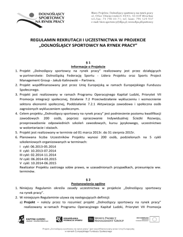 REGULAMIN REKRUTACJI I UCZESTNICTWA W PROJEKCIE „DOLNOŚLĄSCY SPORTOWCY NA RYNEK PRACY” 1. 2. 3. 4. 5. 6. §1 Informacje o Projekcie Projekt „Dolnośląscy sportowcy na rynek pracy” realizowany jest przez działających w partnerstwie: Dolnośląską Federację Sportu - Lidera Projektu oraz Sports Project Management Group - Jakub Kalinowski – Partnera. Projekt współfinansowany jest przez Unię Europejską w ramach Europejskiego Funduszu Społecznego. Projekt jest realizowany w ramach Programu Operacyjnego Kapitał Ludzki, Priorytet VII Promocja integracji społecznej, Działanie 7.2 Przeciwdziałanie wykluczeniu i wzmocnienie sektora ekonomii społecznej, Poddziałanie 7.2.1 Aktywizacja zawodowa i społeczna osób zagrożonych wykluczeniem społecznym. Celem projektu „Dolnośląscy sportowcy na rynek pracy” jest podniesienie poziomu kwalifikacji zawodowych 200 osób, poprzez opracowanie Indywidualnej Ścieżki Rozwoju, przeprowadzenie odpowiednich szkoleń zawodowych, kursu językowego, uczestnictwo w wolontariacie i stażach. Projekt jest realizowany w terminie od 01 marca 2013r. do 31 sierpnia 2015r. Planowana liczba Uczestników Projektu wynosi 200 osób, podzielonych na 5 cykli szkoleniowych organizowanych w terminach: I cykl: 06.2013-05.2014 II cykl: 10.2013-07.2014 III cykl: 02.2014-11.2014 IV cykl: 06.2014-03.2015 V cykl: 10.2014-06.2015 Realizator Projektu zastrzega sobie prawo, w uzasadnionych przypadkach, przesunięcia ww. terminów. §2 Postanowienia ogólne 1. Niniejszy Regulamin określa zasady uczestnictwa w projekcie „Dolnośląscy sportowcy na rynek pracy”. 2. W niniejszym Regulaminie używa się następujących definicji: a) Projekt – należy przez to rozumieć projekt „Dolnośląscy sportowcy na rynek pracy” realizowany w ramach Programu Operacyjnego Kapitał Ludzki, Priorytet VII Promocja b) c) d) e) f) g) h) i) j) integracji społecznej, Poddziałanie 7.2.1 Aktywizacja zawodowa i społeczna osób zagrożonych wykluczeniem społecznym, Regulamin – należy przez to rozumieć regulamin uczestnictwa i rekrutacji w projekcie „Dolnośląscy sportowcy na rynek pracy”, Uczestnik Projektu – należy przez to rozumieć osobę, która pomyślnie przeszła proces rekrutacji, została zakwalifikowana do jednej z grup szkoleniowych, zaakceptowała Regulamin, podpisała Deklarację Uczestnictwa i Kontrakt oraz przystąpiła do form wsparcia oferowanych w ramach Projektu, Realizator Projektu – należy przez to rozumieć Dolnośląską Federację Sportu we Wrocławiu (50-529), przy ul. Borowskiej 1-3, Uczestnictwo w Projekcie – należy przez to rozumieć aktywny i zgodny z harmonogramem udział w szkoleniach/kursach/stażach/wolontariacie realizowanych w ramach Projektu, Ukończenie Projektu – należy przez to rozumieć udział w odpowiednim wymiarze czasowym w formach wsparcia realizowanych w ramach Projektu, Osoba bezrobotna – należy przez to rozumieć osobę, która na dzień przystąpienia do Projektu jest zarejestrowana w Powiatowym Urzędzie Pracy jako bezrobotna, Osoba nieaktywna zawodowo – należy przez to rozumieć osobę, która na dzień przystąpienia do Projektu pozostaje bez zatrudnienia: osoba niezatrudniona, niewykonująca innej pracy zarobkowej, zdolna i gotowa do podjęcia zatrudnienia lub innej pracy zarobkowej w co najmniej połowie wymiaru czasu pracy, która jednocześnie nie zalicza się do kategorii osoby bezrobotnej; do katalogu osób nieaktywnych zawodowo nie należy wliczać osób, które zawiesiły działalność gospodarczą (ale jej nie wyrejestrowały) osoby te funkcjonują jako podmioty gospodarcze i w związku z powyższym nie mogą być traktowane jako osoby nieaktywne zawodowo, Osoba zatrudniona – należy przez to rozumieć osobę, której dochód nie jest wyższy niż dwukrotność kryteriów dochodowych, o których mowa w art. 8 ustawy o pomocy społecznej (Dz. U. 2004 nr 64 poz. 593 ze zm.) i która jest pracownikiem w rozumieniu Kodeksu pracy, tj. osobą zatrudnioną na podstawie umowy o pracę, powołania, wyboru, mianowania oraz spółdzielczej umowy o pracę lub osobą wykonującą pracę na podstawie Kodeksu cywilnego, w szczególności w zakresie umów cywilnoprawnych (umowa zlecenia, umowa o dzieło). Przychód osoby zatrudnionej pomniejszony o: miesięczne obciążenie podatkiem dochodowym od osób fizycznych, składki na ubezpieczenie zdrowotne oraz ubezpieczenia społeczne, kwotę alimentów świadczonych na rzecz innych osób, nie może być wyższy niż 1084,00 zł dla osoby samotnie gospodarującej lub 912,00 zł na członka rodziny dla osoby w rodzinie. Instruktor – należy przez to rozumieć osobę, która posiada uprawnienia instruktora sportu w danej dyscyplinie sportu lub instruktor rekreacji, k) Trener – należy przez to rozumieć osobę, która posiada uprawnienia trenera sportu (trener klasy mistrzowskiej, trener I klasy, trener II klasy) w danej dyscyplinie sportu, l) Zawodnik sportowy – należy przez to rozumieć osobę, która czynnie uprawia lub uprawiała w przeszłości dyscyplinę sportową, wymagającą wysiłku fizycznego, precyzji lub zaangażowania umysłu, m) Instytucja Przyjmująca Wolontariuszy – należy przez to rozumieć organizacje i instytucje prowadzącą projekty i imprezy sportowe, dolnośląskie kluby i związki sportowe, a także organizacje sportowe jednostek samorządu terytorialnego na Dolnym Śląsku, które będą przyjmowały Uczestników Projektu na wolontariat, n) Instytucja Przyjmująca Stażystów – należy przez to rozumieć przedsiębiorstwa z branż strategicznych dla rozwoju Dolnego Śląska: informatyka, turystyka i działalność uzdrowiskowa, hotele i restauracje, a także dolnośląskie kluby sportowe, związki sportowe lub organizacje sportowe jednostek samorządu terytorialnego na Dolnym Śląsku, które będą przyjmowały Uczestników Projektu na staż, o) Wolontariat – należy przez to rozumieć bezpłatne, dobrowolne, świ