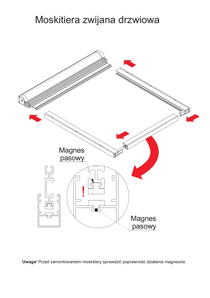 Moskitiera zwijana drzwiowa Magnes pasowy ! Magnes pasowy Uwaga! Przed zamontowaniem moskitiery sprawdziæ poprawnoœæ dzia³ania magnesów. 1 1,8 mm dla wkrêta 4,2 mm dla nita 1.8 90° 1 1.8 1,8 mm 90° *) elementy moskitiery zabezpieczyæ przed rozsuwaniem siê wkrêtami lub nitami 8 w zale¿noœci od wielkoœci wkrêta ( 3,5) 11. 12. 2 mm ! Nr.1,5 Nr.1,5 Obs³uga moskitiery Instrukcja u¿ytkowania Moskitiery rolowanej Pomiar i monta¿ · Pomiaru oraz monta¿u powinien dokonywaæ przeszkolony monta¿ysta · Producent nie ponosi odpowiedzialnoœci za wadliwy pomiar lub monta¿ U¿ytkowanie · Do otwierania moskitiery s³u¿y listwa wyposa¿ona w uchwyt · U¿ytkowaæ moskitierê tylko wtedy gdy w zasiêgu pracy produktu nie znajduj¹ siê ¿adne przeszkody. · W przypadku b³êdnego dzia³ania moskitiery fakt ten nale¿y zg³osiæ sprzedawcy. Pielêgnacja produktu · Moskitierê nale¿y przynajmniej raz w miesi¹cu czyœciæ. · Podczas remontów oraz du¿ego zapylenia pomieszczenia nale¿y zwin¹æ siatkê Producent nie ponosi odpowiedzialnoœci za: · Z³y naci¹g siatki w wyniku niew³aœciwego u¿ytkowania · Niezgodny z przeznaczeniem monta¿ tj. w pomieszczeniach o du¿ej wilgotnoœci, w pobli¿u Ÿróde³ ciep³a gdzie nastêpuje deformacja siatki · Za utratê estetyki w wyniku zabrudzenia, uszkodzenia œrodkami chemicznymi itp. · Przerabianie oraz naprawianie dokonywane przez klienta w wyniku, których nast¹pi³o uszkodzenie moskitiery · Zadrapania powierzchni lakierniczej oraz uszkodzenia siatki moskitiery w czasie rozpakowywania produktu · Uszkodzenia mechaniczne oraz uszkodzenia powsta³e w wyniku: - niew³aœciwego u¿ytkowania produktu, - niedba³ego przechowywania oraz nadmiernego przeci¹¿enia, - nie zastosowania siê do zaleceñ instrukcji monta¿u producenta. - zdarzeñ losowych jak np.: zalanie mieszkania, oddzia³ywanie zwierz¹t, przed silnym wiatrem mrozem i œniegiem Aby ochroniæ moskitierê nale¿y pozostawiæ j¹ w pozycji zwiniêtej