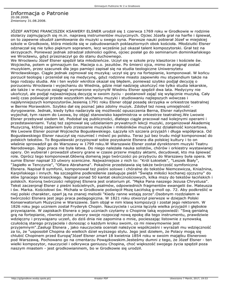 Gimnazjum Publiczne Nr 2 w Grodkowie Informacja o Patronie 20.08.2008. Zmieniony 31.08.2008. JÓZEF ANTONI FRANCISZEK KSAWERY ELSNER urodził się 1 czerwca 1769 roku w Grodkowie w rodzinie stolarzy zajmujących się m.in. naprawą instrumentów muzycznych. Ojciec Józefa grał na harfie i śpiewał, on to zapewne obudził zamiłowanie do muzyki u swego syna. Pierwsze nauki pobierał Józef w miejskiej szkole w Grodkowie, która mieściła się w zabudowaniach poklasztornych obok kościoła. Młodziutki Elsner odznaczał się nie tylko pięknym sopranem, lecz wcześnie już okazał talent kompozytorski. Grał też na skrzypcach. Ponieważ jednak zdradzał zdolności ogólne, ojciec posłał go do seminarium dominikańskiego we Wrocławiu, gdyż przeznaczył go do stanu duchownego. We Wrocławiu Józef Elsner spędził lata młodzieńcze. Uczył się w szkole przy klasztorze i kościele św. Wojciecha, potem w gimnazjum św. Macieja o.o. jezuitów. Po śmierci ojca, mimo że pragnął zostać muzykiem, przez szacunek dla jego pamięci zapisał się na studia teologiczne Uniwersytetu Wrocławskiego. Ciągle jednak zajmował się muzyką: uczył się gry na fortepianie, komponował. W końcu porzucił teologię i przeniósł się na medycynę, gdyż rodzinne miasto zapewniło mu stypendium także na tego rodzaju studia. Ale i ten wybór wkrótce okazał się błędem, ponieważ szybko podjął decyzję o porzuceniu Wrocławia i wyjechaniu do Wiednia, gdzie miał nadzieję ukończyć nie tylko studia lekarskie, ale także i w muzyce osiągnąć wymarzone wyżynyW Wiedniu Elsner spędził dwa lata. Medycyny nie ukończył, ale podjął najważniejszą decyzję w swoim życiu - postanowił zająć się wyłącznie muzyką. Cały swój czas poświęcał przede wszystkim słuchaniu muzyki i studiowaniu najlepszych wówczas i najsłynniejszych kompozytorów.Jesienią 1791 roku Elsner objął posadę skrzypka w orkiestrze teatralnej w Bernie Morawskim. Szybko dał się poznać jako zdolny muzyk. Zdobył też nową umiejętność dyrygowanie. Jednak, kiedy tylko nadarzyła się możliwość opuszczenia Berna, Elsner natychmiast wyjechał, tym razem do Lwowa, by objąć stanowisko kapelmistrza w orkiestrze teatralnej.We Lwowie Elsner przebywał siedem lat. Podobał się publiczności, dlatego ciągle pracował nad kolejnymi operami i przedstawieniami. Tutaj też zajmował się udzielaniem prywatnych lekcji muzyki, zorganizował Akademię Muzyczną, której zadaniem było zrzeszanie muzyków i miłośników muzyki oraz działalność koncertowa. We Lwowie Elsner poznał Wojciecha Bogusławskiego. Łączyła ich szczera przyjaźń i długa współpraca. Od Bogusławskiego Elsner nauczył się rozumieć i mówić po polsku. Teraz już bez trudu mógł komponować do polskich tekstów. To Bogusławski przypisywał sobie pozyskanie Elsnera dla polskiej kultury i to on właśnie sprowadził go do Warszawy w 1799 roku.W Warszawie Elsner został dyrektorem muzyki Teatru Narodowego. Jego praca nie była łatwa. Do niego należała nauka solistów, chórów i orkiestry wystawianej opery. On wybierał i prowadził utwory grane w czasie przerw między aktami, decydował, kto ma śpiewać role. Oprócz tego komponował.Główną domeną jego twórczości po przybyciu do Warszawy była opera. W sumie Elsner napisał 33 utwory sceniczne. Najważniejsze z nich to: "Król Łokietek", "Leszek Biały", "Jagiełło w Tenczynie", "Ofiara Abrahama". Pokaźnie przedstawia się także twórczość symfoniczna Elsnera. Napisał 8 symfonii, komponował też pieśni solowe i chóralne do tekstów Niemcewicza, Kniaźnina, Karpińskiego i innych. Na szczególne podkreślenie zasługuje pieśń "Święta miłości kochanej ojczyzny" do słów Ignacego Krasickiego. Napisał ponad 50 kantat okolicznościowych, kilka mszy do tekstów łacińskich i polskich. Koroną twórczości religijnej Elsnera jest oratorium pt. "Męka Pana naszego Jezusa Chrystusa". Tekst zaczerpnął Elsner z pieśni kościelnych, psalmów, odpowiednich fragmentów ewangelii św. Mateusza i św. Marka. Kościołowi św. Michała w Grodkowie poświęcił Mszę Łacińską g-moll op. 72. Aby podkreślić w niej polski charakter, oparł ją na znanej melodii "Kiedy ranne wstają zorze".Osobnym rozdziałem w twórczości Elsnera jest jego praca pedagogiczna. W 1821 roku otworzył pierwsze w dziejach Polski Konserwatorium Muzyczne w Warszawie. Sam objął w nim klasę kompozycji i został jego rektorem. W 1826 roku jego uczniem został Fryderyk Chopin. Nauczyciela i ucznia łączyła wielka przyjaźń i głębokie przywiązanie. W zapiskach Elsnera o jego uczniach czytamy o Chopinie taką wypowiedź: "Swą genialną grą na fortepianie, również przez utwory swoje rozpoczął nową epokę dla tego instrumentu, prawdziwie wdzięczny i przywiązany uczeń, do dziś dnia nie zapomina o mnie, pocieszając listownie z synowską czułością starego przyjaciela i donosząc o każdym kroku swoim, co mi niewymownie jest przyjemnym".Zasługi Elsnera , jako nauczyciela oceniali należycie współcześni i wyrażali mu wdzięczność za to, że "usposobił Chopina do wielkich dzieł wyższego stylu. Jego jest dziełem, że Polacy mogą się chlubić Chopinem przed Europą"Józef Elsner zmarł 18 kwietnia 1854 roku w swoim majątku Elsnerowo pod Warszawą. Pochowano go na cmentarzu Powązkowskim.Jesteśmy dumni z tego, że Józef Elsner - ten wielki kompozytor, nauczyciel i odkrywca geniuszu Chopina, choć większość swojego życia spędził poza naszym miastem - jest grodkowianinem, bo w Grodkowie się urodził. http://g2grodkow.wodip.opole.pl/j Kreator PDF Utworzono 7 March, 2017, 19:53
