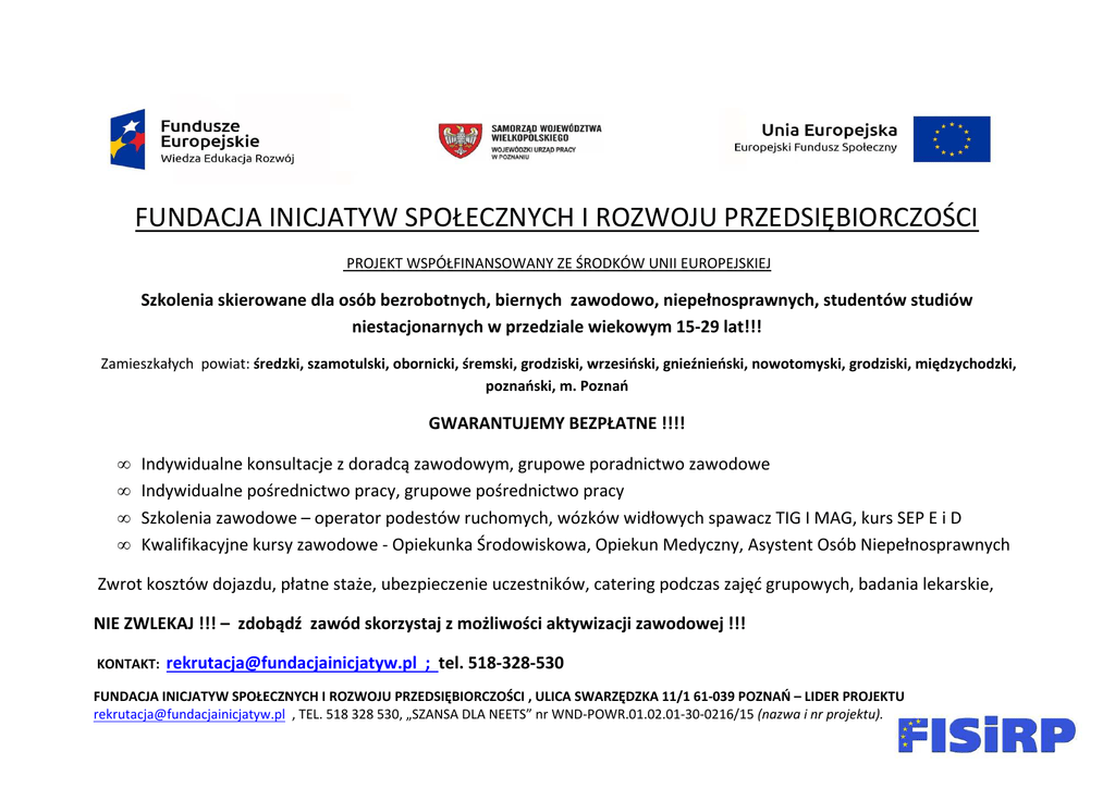 FUNDACJA INICJATYW SPOŁECZNYCH I ROZWOJU PRZEDSIĘBIORCZOŚCI PROJEKT WSPÓŁFINANSOWANY ZE ŚRODKÓW UNII EUROPEJSKIEJ Szkolenia skierowane dla osób bezrobotnych, biernych zawodowo, niepełnosprawnych, studentów studiów niestacjonarnych w przedziale wiekowym 15-29 lat!!! Zamieszkałych powiat: średzki, szamotulski, obornicki, śremski, grodziski, wrzesiński, gnieźnieński, nowotomyski, grodziski, międzychodzki, poznański, m. Poznań GWARANTUJEMY BEZPŁATNE !!!! • • • • Indywidualne konsultacje z doradcą zawodowym, grupowe poradnictwo zawodowe Indywidualne pośrednictwo pracy, grupowe pośrednictwo pracy Szkolenia zawodowe – operator podestów ruchomych, wózków widłowych spawacz TIG I MAG, kurs SEP E i D Kwalifikacyjne kursy zawodowe - Opiekunka Środowiskowa, Opiekun Medyczny, Asystent Osób Niepełnosprawnych Zwrot kosztów dojazdu, płatne staże, ubezpieczenie uczestników, catering podczas zajęć grupowych, badania lekarskie, NIE ZWLEKAJ !!! – zdobądź zawód skorzystaj z możliwości aktywizacji zawodowej !!! KONTAKT: [email protected] ; tel. 518-328-530 FUNDACJA INICJATYW SPOŁECZNYCH I ROZWOJU PRZEDSIĘBIORCZOŚCI , ULICA SWARZĘDZKA 11/1 61-039 POZNAŃ – LIDER PROJEKTU [email protected] , TEL. 518 328 530, „SZANSA DLA NEETS” nr WND-POWR.01.02.01-30-0216/15 (nazwa i nr projektu). FUNDACJA INICJATYW SPOŁECZNYCH I ROZWOJU PRZEDSIĘBIORCZOŚCI , ULICA SWARZĘDZKA 11/1 61-039 POZNAŃ – LIDER PROJEKTU [email protected] , TEL. 518 328 530, „SZANSA DLA NEETS” nr WND-POWR.01.02.01-30-0216/15 (nazwa i nr projektu).