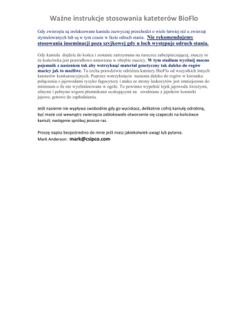 Ważne instrukcje stosowania kateterów BioFlo Gdy zwierzęta są zrelaksowane kaniula zazwyczaj przechodzi o wiele łatwiej niż u zwierząt stymulowanych lub są w tym czasie w fazie odruch stania. Nie rekomendujemy stosowania inseminacji poza szyjkowej gdy u loch występuje odruch stania. Gdy kaniula dojdzie do końca i zostanie zatrzymana na rureczce zabezpieczającej, znaczy to że końcówka jest prawidłowo ustawiona w obrębie macicy. W tym stadium wyciśnij mocno pojemnik z nasieniem tak aby wstrzyknąć materiał genetyczny tak daleko do rogów macicy jak to możliwe. Ta cecha prawdziwie odróżnia katetery BioFlo od wszystkich innych kateterów konkurencyjnych. Poprzez wstrzyknięcie nasienia daleko do rogów w kierunku połączenia z jajowodami ryzyko fagocytozy i ataku ze strony leukocytów jest zmniejszone do minimum o ile nie wyeliminowane w ogóle. To powinno wypełnić lejek jajowodu świeżymi, silnymi i pełnymi wigoru plemnikami oczkującymi na uwalniane z jajników komórki jajowe, gotowe do zapłodnienia. Jeśli nasienie nie wypływa swobodnie gdy go wyciskasz, delikatnie cofnij kaniulę odrobinę, być może coś wewnątrz zwierzęcia zablokowało otworzenie się czapeczki na końcówce kaniuli; następnie spróbuj jeszcze raz. Proszę napisz bezpośrednio do mnie jeśli masz jakiekolwiek uwagi lub pytania. Mark Anderson: [email protected] Ważne instrukcje stosowania kateterów BioFlo Teraz uchwyć delikatnie rurkę kateteru jedną ręką, a następnie delikatnie uchwyć kaniulę drugą (około 3 cm za końcówką) i wpychaj kaniulę do przodu aż poczujesz jak końcówka wychodzi z oliwki. Nie wpychaj kaniuli bez trzymania rurki kateteru na miejscu. Jeśli zrobisz to, i oliwka zaciśnie się na końcówce kaniuli, to zwierzę poczuje naciskającą oliwkę i da to taki sam efekt jak sprawdzanie zablokowania oliwki. Upewnij się, że trzymasz rurkę kateteru prawidłowo aż do momentu jak poczujesz, że końcówka już wyszła i znajduje się i kanale szyjki macicy. Najprawdopodobniej za pierwszym pchnięciem pokonasz jeden lub dwa fałdy szyjki macicy. Gdy poczujesz zdecydowany opór nie przepychaj kaniuli na siłę. Bądź cierpliwy, i delikatny jak to tylko możliwe. To nie konkurs szybkości, i nie rób niczego na siłę. Zawsze delikatnie lecz zdecydowanie naciskaj kaniule do przodu i wtedy poczujesz jak przechodzi kolejne fałdy szyjki (Nie wpychaj na siłę i ciągnij do tyłu, a potem do przodu). W przypadku tradycyjnych kateterów z wewnętrzną kaniulą widziałem inseminatorów, którzy wpychali kaniulę do momentu blokady o fałd szyjki, następnie wycofywali nieco kaniulę, skręcali ją tak aby ominąć przeszkodę na którą natrafili. Jeżeli zastosujesz tą sama metodę z kateterami BIOFLO, czynność ta spowoduje ponowną stymulację lochy i tym samym szyjka macicy zamknie się ponownie. Specjalna końcówka w kateterach BioFlo została zaprojektowana tak aby sama omijała kolejne fałdy i to co powinieneś robić to tylko wciskać kaniulę do przodu. Jeszcze raz, proszę pamiętaj, że BioFlo różni się od innych kateterów poza szyjkowych i działa inaczej. To jest to co przede wszystkim wzbudziło twoje zainteresowanie nasza technologią, dlatego proszę zrozum nasz produkt jest inny od tego co do tej pory stosowałeś … Jeśli czujesz zbytni opór, nie przepychaj kaniuli na siłę do przodu, po prostu poczekaj chwilę dłużej aż szyjka będzie zrelaksowana i wtedy kontynuuj. Wielokrotnie nie pójdzie do końca za pierwszym razem. Poczekaj 10-15 sekund pomiędzy kolejnymi próbami, a najlepiej to przejdź do następnej lochy w wróć do niej potem. Za każdym razem jak wciskasz kaniulę locha będzie to czuła i niekiedy będzie blokować dalszą penetrację. Jest to jednak chwilowe, aż locha się zrelaksuje i kontynuuj przepychanie kaniuli. Nie obracaj ani nie skręcaj kaniulą w czasie jej przepychania. Obracanie i skręcanie nie jest konieczne, a wręcz przeciwnie może zaszkodzić ponieważ giętka końcówka podąża już naturalną drogą pomiędzy fałdami szyjki i kieruje kateter we właściwym kierunku. Takie ruchy, a cofanie w szczególności, może spowodować to, że czapeczka końcówki ześlizgnie się. Wprowadzaj kaniulę pewnie, do przodu tak aby czapeczka na końcówce była bezpieczna i prawidłowo ustawiona. Ważne instrukcje stosowania kateterów BioFlo Wprawdzie BioFlo wygląda podobnie do innych kateterów do poza szyjkowej inseminacji opartych na wewnętrznej kaniuli to istnieją pewne podstawowe różnice w jego konstrukcji i będzie się czuć inaczej, inseminator będzie penetrował szyjkę macicy. Jest to prawidłowe, gdyż jest on inny. Aby prawidłowo stosować nasz kateter proszę ze szczególną uwagą zapoznać się z niniejszą instrukcją. GDY ZAMIERZASZ JE INSEMINOWAĆ KATETERAMI BIOFLOO TWOJE ZWIERZĘTA MUSZĄ BYĆ ZRELAKSOWANE I NALEŻY WYSTRZEGAĆ SIĘ ABY NIE POBUDZAĆ ICH W TRAKCIE ZABIEGU. Gdy odwiedzam fermy aby demonstrować jak należy używać katetery BIOFLO to obserwuję, że większość inseminatorów, przestrzega aby przed zabiegiem inseminacji zwierzęta były wstępnie zrelaksowane, ale potem, po zakleszczeniu kateteru w szyjce macicy i odczekaniu jakiegoś czasu, przed przeprowadzeniem kaniuli przez szyjkę macicy inseminator bezwiednie może re‐stymulować lochę poprzez sprawdzanie czy kateter jest osadzony prawidłowo, kładzenie rąk na grzbiecie lochy, dotykanie jej boków lub poruszaniem samego kateteru. Te, delikatne nawet czynności spowodują, że zwierzę zaciśnie oliwkę kateteru zamknie możliwość penetracji szyjki macicy przez kaniule, Proszę nie robić tego! Przeprowadzaj wykrywanie rui z knurem tak jak robiłeś to dotychczas, zaznacz lochy gotowe do unasienniania zgodnie z dotychczasowa rutyną, ale wyprowadź knura na 30 minut do 1 godziny przed wykonywaniem zabiegu inseminacji. Zanim wprowadzisz kateter do lochy, wysuń nieco wewnętrzna końcówkę z oliwki kat
