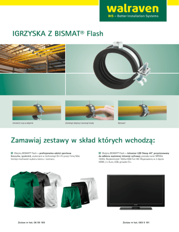 IGRZYSKA Z BISMAT® Flash Zamawiaj zestawy w skład których wchodzą: Obejmy BISMAT® Flash + profesjonalna odzież sportowa (koszulka, spodenki), wykonane w technologii Dri-Fit przez firmę Nike. Istnieje możliwość wyboru koloru i rozmiaru. Zestaw nr kat. 06 99 189 Obejmy BISMAT® Flash + telewizor LED Sharp 40”, przystosowany do odbioru naziemnej telewizji cyfrowej, posiada tuner MPEG4, 100Hz. Rozdzielczość 1920×1080 Full HD. Wyposażony w 2 złącza HDMI, 2 x Euro, USB, gniazdo CI+. Zestaw nr kat. 069 9 191 www.walraven.com www.walraven.com BISMAT® Flash Zestaw nr kat. 069 9 186 obejmy BISMAT® Flash + śruby dwugwintowe + dyble + koszulka i spodenki Nike Nazwa BISMAT® Flash Obejma z okładziną EPDM i szybkim zamknięciem BISMAT® Flash Obejma z okładziną EPDM i szybkim zamknięciem BISMAT® Flash Obejma z okładziną EPDM i szybkim zamknięciem BISMAT® Flash Obejma z okładziną EPDM i szybkim zamknięciem BIS Dybel Nylonowy BIS Śruby dwugwintowe Zestaw koszulka i spodenki Nike Cena zestawu 529 zł* Wymiar (“) Wymiar (mm) Ilość sztuk 3/8 1/2 3/4 1 - 15 - 18 20 - 23 25 - 28 32 - 35 ø 10 M8x80 - 50 50 50 50 200 200 1 Zestaw nr kat. 069 9 188 obejmy BISMAT® Flash + śruby dwugwintowe + dyble + telewizor LED Sharp 40” Nazwa BISMAT® Flash Obejma z okładziną EPDM i szybkim zamknięciem BISMAT® Flash Obejma z okładziną EPDM i szybkim zamknięciem BISMAT® Flash Obejma z okładziną EPDM i szybkim zamknięciem BISMAT® Flash Obejma z okładziną EPDM i szybkim zamknięciem BIS Dybel Nylonowy BIS Śruby dwugwintowe Telewizor LED Sharp 40” Cena zestawu 8464 zł* Wymiar (“) Wymiar (mm) Ilość sztuk 3/8 1/2 3/4 1 - 15 - 18 20 - 23 25 - 28 32 - 35 ø 10 M8x80 - 800 800 800 800 3200 3200 1 * sugerowana cena dla instalatora Ceny nie zawierają podatku VAT. Promocja ważna od 18.07.2012r. do wyczerpania zapasów. Dostawa towarów do 7 dni od daty zamówienia. Zastrzega się możliwość wprowadzania zmian. Powyższa informacja nie stanowi oferty w rozumieniu art. 66 i następnych Kodeksu Cywilnego. Szczegółowe informacje na www.walraven.com