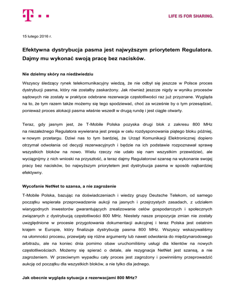 15 lutego 2016 r. Efektywna dystrybucja pasma jest najwyższym priorytetem Regulatora. Dajmy mu wykonać swoją pracę bez nacisków. Nie dzielmy skóry na niedźwiedziu Wszyscy śledzący rynek telekomunikacyjny wiedzą, że nie odbył się jeszcze w Polsce proces dystrybucji pasma, który nie zostałby zaskarżony. Jak również jeszcze nigdy w wyniku procesów sądowych nie zostały w praktyce odebrane rezerwacje częstotliwości raz już przyznane. Wygląda na to, że tym razem także możemy się tego spodziewać, choć za wcześnie by o tym przesądzać, ponieważ proces alokacji pasma właśnie wszedł w drugą rundę i jest ciągle otwarty. Teraz, gdy jasnym jest, że T-Mobile Polska pozyska drugi blok z zakresu 800 MHz na niezależnego Regulatora wywierana jest presja w celu rozdysponowania piątego bloku później, w nowym przetargu. Dziwi nas to tym bardziej, że Urząd Komunikacji Elektronicznej dopiero otrzymał odwołania od decyzji rezerwacyjnych i będzie na ich podstawie rozpoznawał sprawę wszystkich bloków na nowo. Wielu rzeczy nie udało się nam wszystkim przewidzieć, ale wyciągnijmy z nich wnioski na przyszłość, a teraz dajmy Regulatorowi szansę na wykonanie swojej pracy bez nacisków, bo najwyższym priorytetem jest dystrybucja pasma w sposób najbardziej efektywny. Wycofanie NetNet to szansa, a nie zagrożenie T-Mobile Polska, bazując na doświadczeniach i wiedzy grupy Deutsche Telekom, od samego początku wspierała przeprowadzenie aukcji na jasnych i przejrzystych zasadach, z udziałem wiarygodnych inwestorów gwarantujących zrealizowanie celów gospodarczych i społecznych związanych z dystrybucją częstotliwości 800 MHz. Niestety nasze propozycje zmian nie zostały uwzględnione w procesie przygotowania dokumentacji aukcyjnej i teraz Polska jest ostatnim krajem w Europie, który finalizuje dystrybucję pasma 800 MHz. Wszyscy wskazywaliśmy na ułomności procesu, przewijały się różne argumenty lub nawet odwołania do międzynarodowego arbitrażu, ale na koniec dnia pomimo obaw uruchomiliśmy usługi dla klientów na nowych częstotliwościach. Możemy się spierać o detale, ale rezygnacja NetNet jest szansą, a nie zagrożeniem. W przeciwnym wypadku cały proces jest zagrożony i powinniśmy przeprowadzić aukcję od początku dla wszystkich bloków, a nie tylko dla jednego. Jak obecnie wygląda sytuacja z rezerwacjami 800 MHz? Warto przez chwilę zatrzymać się i zrozumieć jak wygląda procedura przyznawania przez UKE rezerwacji częstotliwości podmiotom wyłonionym w wyniku aukcji. Jedynymi kryteriami decydującymi o fizycznym umiejscowieniu przez UKE bloków zwycięzców są zasady efektywności wykorzystywania częstotliwości i optymalizacji zarządzania widmem. Kryteria te są zapisane w Prawie Telekomunikacyjnym, regulacjach unijnych oraz Dokumentacji Aukcyjnej. Bazując na tych przesłankach, UKE 25 stycznia br. wydał w pierwszej instancji decyzje rezerwacyjne spółkom NetNet, P4, T-Mobile Polska oraz Orange Polska. Jak informuje UKE, NetNet przed otrzymaniem decyzji, którą odebrał 8 lutego br., skutecznie wycofał swój wniosek o rezerwacje. To oznacza, że z mocy prawa blok wylicytowany przez NetNet przypada T-Mobile Polska, którego oferta była drugą co do wartości w licytacji tego bloku. Każdej ze stron postępowania prowadzonego przez UKE w pierwszej instancji przysługuje prawo do odwołania od decyzji rezerwacyjnych w ciągu 14 dni od ich otrzymania. W związku ze złożeniem przez TMobile Polska i innych uczestników aukcji odwołania od decyzji rezerwacyjnych wydanych 25 stycznia br. pozostają one nieprawomocne. UKE, rozpoznając odwołania podmiotów w drugiej instancji, przyznaje nowe rezerwacje i alokuje pasmo na nowo z zachowaniem zasad efektywnego wykorzystania pasma. Zasady te są dla UKE wiążące. Jak powinna wyglądać najefektywniejsza alokacja pasma 800 MHz? To, jak musi wyglądać najbardziej efektywne rozdysponowanie pasma 800 MHz, jest bezdyskusyjne zarówno dla inżynierów, techników, jak i ekspertów rynku telekomunikacyjnego. W obecnych warunkach rozkład zapewniający maksymalizację korzyści dla klientów, umożliwiający wdrożenie innowacyjnych technologii oraz gwarantujący efektywne wykorzystanie zasobów wygląda następująco: Rezerwacja częstotliwości „A” – Orange Polska; Rezerwacja częstotliwości „B” – Orange Polska; Rezerwacja częstotliwości „C” – T-Mobile Polska; Rezerwacja częstotliwości „D” – T-Mobile Polska; Rezerwacja częstotliwości „E” – P4. Nie kwestionuje tego żaden z operatorów, którzy pozostali w procesie dystrybucji bloków z zakresu 800 MHz. Dodatkowo, jeden z naszych konkurentów wskazuje wprost, we wnioskach o ponowne rozpatrzenie decyzji rezerwacyjnych, na konieczność przyznania dwóch sąsiadujących bloków T-Mobile Polska. Jakakolwiek inna konfiguracja nie spełnia podstawowego kryterium związanego z efektywną dystrybucją pasma i będzie łatwym kąskiem dla prawników chcących podważyć decyzje rezerwacyjne. Nie szukajmy więc na siłę skomplikowanych rozwiązań, wydłużających 2 dystrybucję pasma w czasie, wysoce ryzykownych i możliwych do podważenia. Tylko jasne i przejrzyste zasady są podstawą dobrych inwestycji. Nie zmarnujmy historycznej szansy Dzisiaj rynek wygląda inaczej niż 10 lat temu i potrzebuje długofalowych inwestycji w infrastrukturę. Dla wielu mieszkańców Polski LTE będzie jedyną i podstawową technologią, która pozwoli im na szerokopasmowy dostęp do Internetu o parametrach oczekiwanych w XXI wieku. W interesie konsumentów, Rządu i Regulatora leży pełna dystrybucja pasma oraz jak najszybsze rozbudowanie infrastruktury, co zapewni społeczeństwu dostęp do szybkiego Internetu. Gwarancją sukcesu jest przyznanie częstotliwości solidnym i sprawdzonym inwestorom, rozbudowującym infrastrukturę i płacącym podatki w Polsce. Przedłużanie procesu dystrybucji pasma jest szkod
