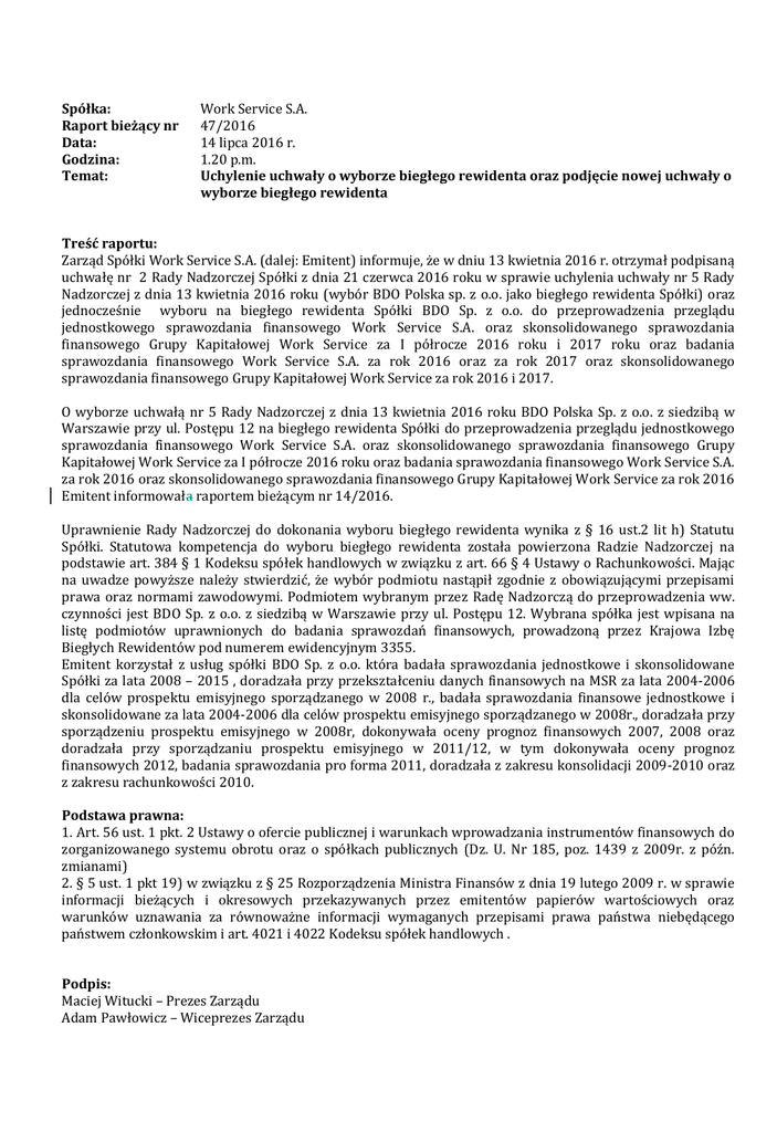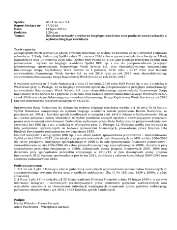 Spółka: Raport bieżący nr Data: Godzina: Temat: Work Service S.A. 47/2016 14 lipca 2016 r. 1.20 p.m. Uchylenie uchwały o wyborze biegłego rewidenta oraz podjęcie nowej uchwały o wyborze biegłego rewidenta Treść raportu: Zarząd Spółki Work Service S.A. (dalej: Emitent) informuje, że w dniu 13 kwietnia 2016 r. otrzymał podpisaną uchwałę nr 2 Rady Nadzorczej Spółki z dnia 21 czerwca 2016 roku w sprawie uchylenia uchwały nr 5 Rady Nadzorczej z dnia 13 kwietnia 2016 roku (wybór BDO Polska sp. z o.o. jako biegłego rewidenta Spółki) oraz jednocześnie wyboru na biegłego rewidenta Spółki BDO Sp. z o.o. do przeprowadzenia przeglądu jednostkowego sprawozdania finansowego Work Service S.A. oraz skonsolidowanego sprawozdania finansowego Grupy Kapitałowej Work Service za I półrocze 2016 roku i 2017 roku oraz badania sprawozdania finansowego Work Service S.A. za rok 2016 oraz za rok 2017 oraz skonsolidowanego sprawozdania finansowego Grupy Kapitałowej Work Service za rok 2016 i 2017. O wyborze uchwałą nr 5 Rady Nadzorczej z dnia 13 kwietnia 2016 roku BDO Polska Sp. z o.o. z siedzibą w Warszawie przy ul. Postępu 12 na biegłego rewidenta Spółki do przeprowadzenia przeglądu jednostkowego sprawozdania finansowego Work Service S.A. oraz skonsolidowanego sprawozdania finansowego Grupy Kapitałowej Work Service za I półrocze 2016 roku oraz badania sprawozdania finansowego Work Service S.A. za rok 2016 oraz skonsolidowanego sprawozdania finansowego Grupy Kapitałowej Work Service za rok 2016 Emitent informowała raportem bieżącym nr 14/2016. Uprawnienie Rady Nadzorczej do dokonania wyboru biegłego rewidenta wynika z § 16 ust.2 lit h) Statutu Spółki. Statutowa kompetencja do wyboru biegłego rewidenta została powierzona Radzie Nadzorczej na podstawie art. 384 § 1 Kodeksu spółek handlowych w związku z art. 66 § 4 Ustawy o Rachunkowości. Mając na uwadze powyższe należy stwierdzić, że wybór podmiotu nastąpił zgodnie z obowiązującymi przepisami prawa oraz normami zawodowymi. Podmiotem wybranym przez Radę Nadzorczą do przeprowadzenia ww. czynności jest BDO Sp. z o.o. z siedzibą w Warszawie przy ul. Postępu 12. Wybrana spółka jest wpisana na listę podmiotów uprawnionych do badania sprawozdań finansowych, prowadzoną przez Krajowa Izbę Biegłych Rewidentów pod numerem ewidencyjnym 3355. Emitent korzystał z usług spółki BDO Sp. z o.o. która badała sprawozdania jednostkowe i skonsolidowane Spółki za lata 2008 – 2015 , doradzała przy przekształceniu danych finansowych na MSR za lata 2004-2006 dla celów prospektu emisyjnego sporządzanego w 2008 r., badała sprawozdania finansowe jednostkowe i skonsolidowane za lata 2004-2006 dla celów prospektu emisyjnego sporządzanego w 2008r., doradzała przy sporządzeniu prospektu emisyjnego w 2008r, dokonywała oceny prognoz finansowych 2007, 2008 oraz doradzała przy sporządzaniu prospektu emisyjnego w 2011/12, w tym dokonywała oceny prognoz finansowych 2012, badania sprawozdania pro forma 2011, doradzała z zakresu konsolidacji 2009-2010 oraz z zakresu rachunkowości 2010. Podstawa prawna: 1. Art. 56 ust. 1 pkt. 2 Ustawy o ofercie publicznej i warunkach wprowadzania instrumentów finansowych do zorganizowanego systemu obrotu oraz o spółkach publicznych (Dz. U. Nr 185, poz. 1439 z 2009r. z późn. zmianami) 2. § 5 ust. 1 pkt 19) w związku z § 25 Rozporządzenia Ministra Finansów z dnia 19 lutego 2009 r. w sprawie informacji bieżących i okresowych przekazywanych przez emitentów papierów wartościowych oraz warunków uznawania za równoważne informacji wymaganych przepisami prawa państwa niebędącego państwem członkowskim i art. 4021 i 4022 Kodeksu spółek handlowych . Podpis: Maciej Witucki – Prezes Zarządu Adam Pawłowicz – Wiceprezes Zarządu