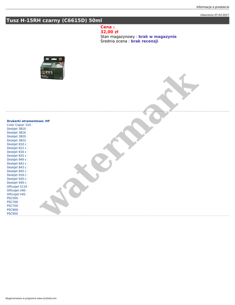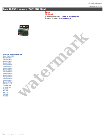 Informacje o produkcie Utworzono 07-03-2017 Tusz H-15RH czarny (C6615D) 50ml Cena : 32,00 zł w at Drukarki atramentowe: HP Color Copier 310 / DeskJet 3810 / DeskJet 3816 / DeskJet 3820 / DeskJet 3822 / DeskJet 810 c / DeskJet 812 c / DeskJet 816 c / DeskJet 825 c / DeskJet 840 c / DeskJet 842 c / DeskJet 843 c / DeskJet 845 c / DeskJet 916 c / DeskJet 920 c / DeskJet 940 c / OfficeJet 5110 / OfficeJet V40 / OfficeJet V45 / PSC500 / PSC700 / PSC750 / PSC900 / PSC950 er m ar k Stan magazynowy : brak w magazynie Średnia ocena : brak recenzji Wygenerowano w programie www.oscGold.com