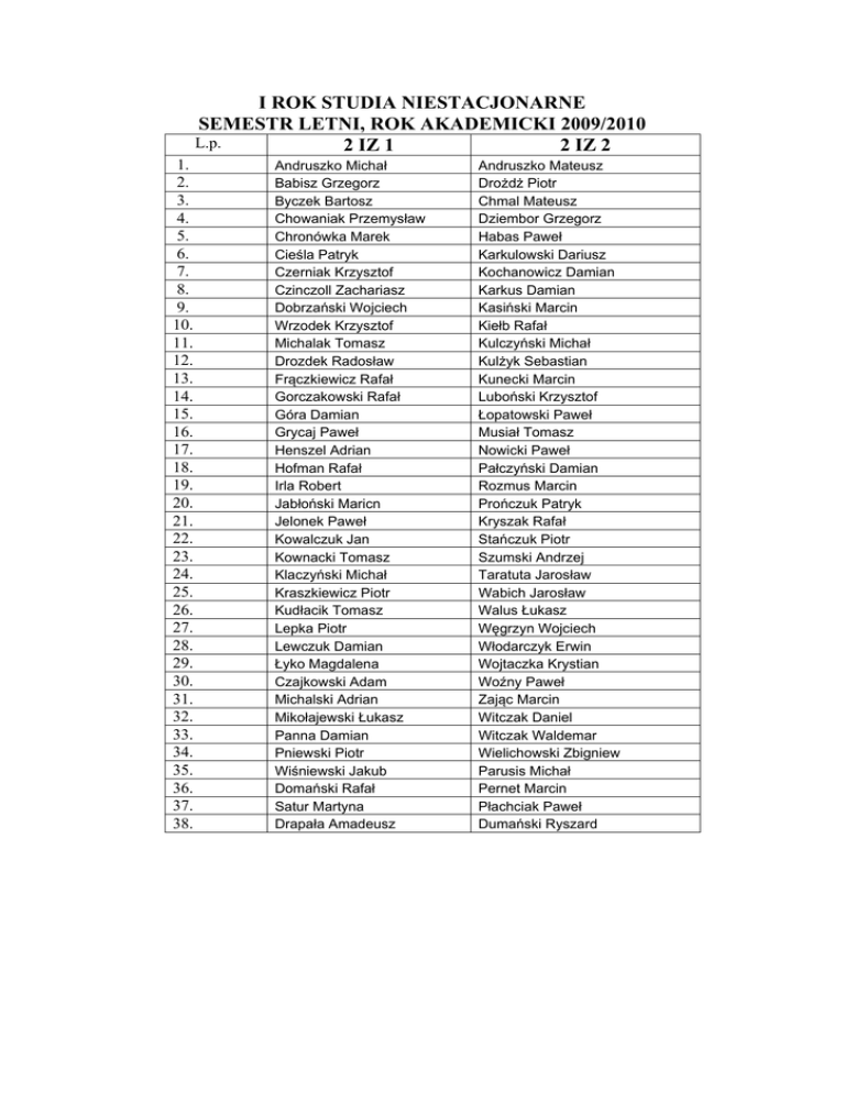 I ROK STUDIA NIESTACJONARNE SEMESTR LETNI, ROK AKADEMICKI 2009/2010 L.p. 2 IZ 1 2 IZ 2 1. 2. 3. 4. 5. 6. 7. 8. 9. 10. 11. 12. 13. 14. 15. 16. 17. 18. 19. 20. 21. 22. 23. 24. 25. 26. 27. 28. 29. 30. 31. 32. 33. 34. 35. 36. 37. 38. Andruszko Michał Babisz Grzegorz Byczek Bartosz Chowaniak Przemysław Chronówka Marek Cieśla Patryk Czerniak Krzysztof Czinczoll Zachariasz Dobrzański Wojciech Wrzodek Krzysztof Michalak Tomasz Drozdek Radosław Frączkiewicz Rafał Gorczakowski Rafał Góra Damian Grycaj Paweł Henszel Adrian Hofman Rafał Irla Robert Jabłoński Maricn Jelonek Paweł Kowalczuk Jan Kownacki Tomasz Klaczyński Michał Kraszkiewicz Piotr Kudłacik Tomasz Lepka Piotr Lewczuk Damian Łyko Magdalena Czajkowski Adam Michalski Adrian Mikołajewski Łukasz Panna Damian Pniewski Piotr Wiśniewski Jakub Domański Rafał Satur Martyna Drapała Amadeusz Andruszko Mateusz Drożdż Piotr Chmal Mateusz Dziembor Grzegorz Habas Paweł Karkulowski Dariusz Kochanowicz Damian Karkus Damian Kasiński Marcin Kiełb Rafał Kulczyński Michał Kulżyk Sebastian Kunecki Marcin Luboński Krzysztof Łopatowski Paweł Musiał Tomasz Nowicki Paweł Pałczyński Damian Rozmus Marcin Prończuk Patryk Kryszak Rafał Stańczuk Piotr Szumski Andrzej Taratuta Jarosław Wabich Jarosław Walus Łukasz Węgrzyn Wojciech Włodarczyk Erwin Wojtaczka Krystian Woźny Paweł Zając Marcin Witczak Daniel Witczak Waldemar Wielichowski Zbigniew Parusis Michał Pernet Marcin Płachciak Paweł Dumański Ryszard L.p. 1. 2. 3. 4. 5. 6. 7. 8. 9. 10. 11. 12. 13. 14. 15. 16. 17. 18. 19. 20. 21. 22. 2 IZ M1 Andruszko Michał Babisz Grzegorz Byczek Bartosz Chowaniak Przemysław Chronówka Marek Cieśla Patryk Czerniak Krzysztof Czinczoll Zachariasz Dobrzański Wojciech Wrzodek Krzysztof Michalak Tomasz Drozdek Radosław Frączkiewicz Rafał Gorczakowski Rafał Góra Damian Grycaj Paweł Henszel Adrian Hofman Rafał Irla Robert I ROK STUDIA NIESTACJONARNE SEMESTR LETNI, ROK AKADEMICKI 2009/2010 2IZ M2 2IZ M3 Jabłoński Maricn Jelonek Paweł Kowalczuk Jan Kownacki Tomasz Klaczyński Michał Kraszkiewicz Piotr Kudłacik Tomasz Lepka Piotr Lewczuk Damian Łyko Magdalena Czajkowski Adam Michalski Adrian Mikołajewski Łukasz Panna Damian Pniewski Piotr Wiśniewski Jakub Domański Rafał Satur Martyna Drapała Amadeusz Andruszko Mateusz Drożdż Piotr Chmal Mateus Dziembor Grzegorz Habas Paweł Karkulowski Dariusz Kochanowicz Damian Karkus Damian Kasiński Marcin Kiełb Rafał Kulczyński Michał Kulżyk Sebastian Kunecki Marcin Luboński Krzysztof Łopatowski Paweł Musiał Tomasz Nowicki Paweł Pałczyński Damian 2 IZ M4 Rozmus Marcin Prończuk Patryk Kryszak Rafał Stańczuk Piotr Szumski Andrzej Taratuta Jarosław Wabich Jarosław Walus Łukasz Węgrzyn Wojciech Włodarczyk Erwin Wojtaczka Krystian Woźny Paweł Zając Marcin Witczak Daniel Witczak Waldemar Wielichowski Zbigniew Parusis Michał Pernet Marcin Płachciak Paweł Dumański Ryszard