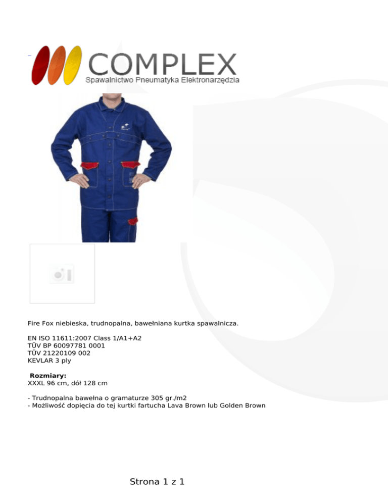 Fire Fox niebieska, trudnopalna, bawełniana kurtka spawalnicza. EN ISO 11611:2007 Class 1/A1+A2 TÜV BP 60097781 0001 TÜV 21220109 002 KEVLAR 3 ply Rozmiary: XXXL 96 cm, dół 128 cm - Trudnopalna bawełna o gramaturze 305 gr./m2 - Możliwość dopięcia do tej kurtki fartucha Lava Brown lub Golden Brown Strona 1 z 1