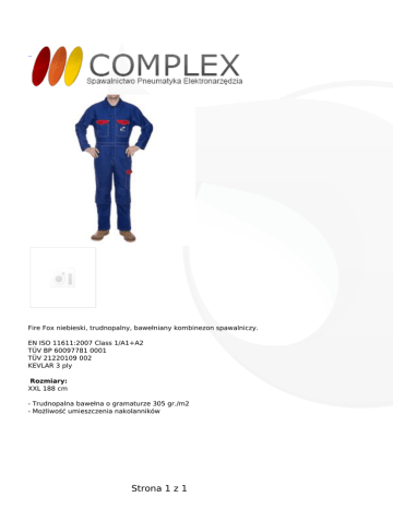 Fire Fox niebieski, trudnopalny, bawełniany kombinezon spawalniczy. EN ISO 11611:2007 Class 1/A1+A2 TÜV BP 60097781 0001 TÜV 21220109 002 KEVLAR 3 ply Rozmiary: XXL 188 cm - Trudnopalna bawełna o gramaturze 305 gr./m2 - Możliwość umieszczenia nakolanników Strona 1 z 1